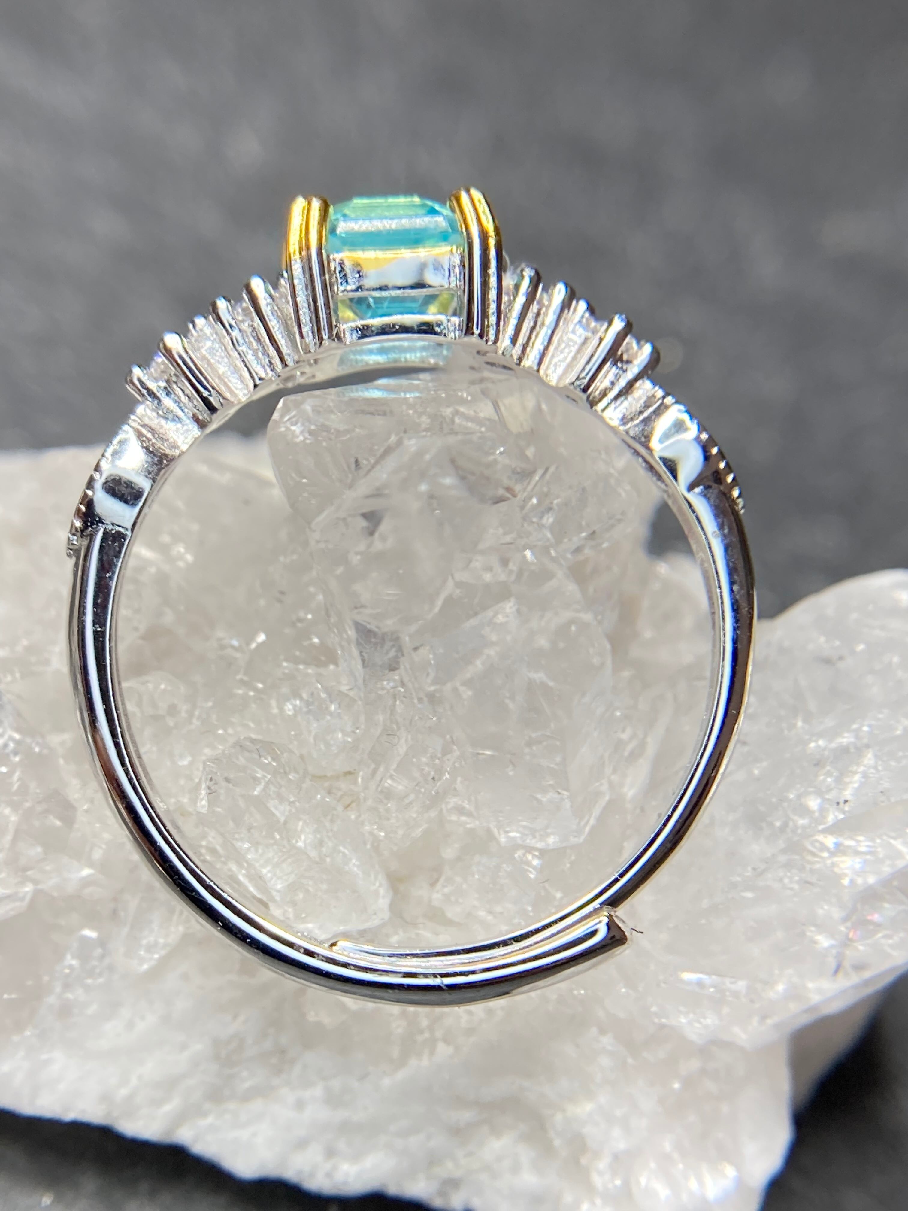 スクエアカットの中に流星群のように美しいインクルージョンが見えるアパタイトのリングです。