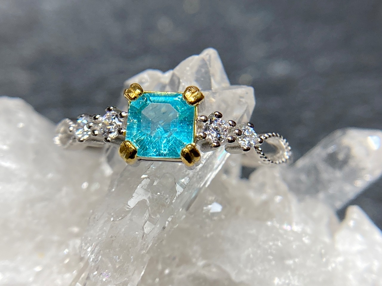 サイドに並んだジルコニアたちがキラキラと輝き、アパタイトの美しさを引き立てます。