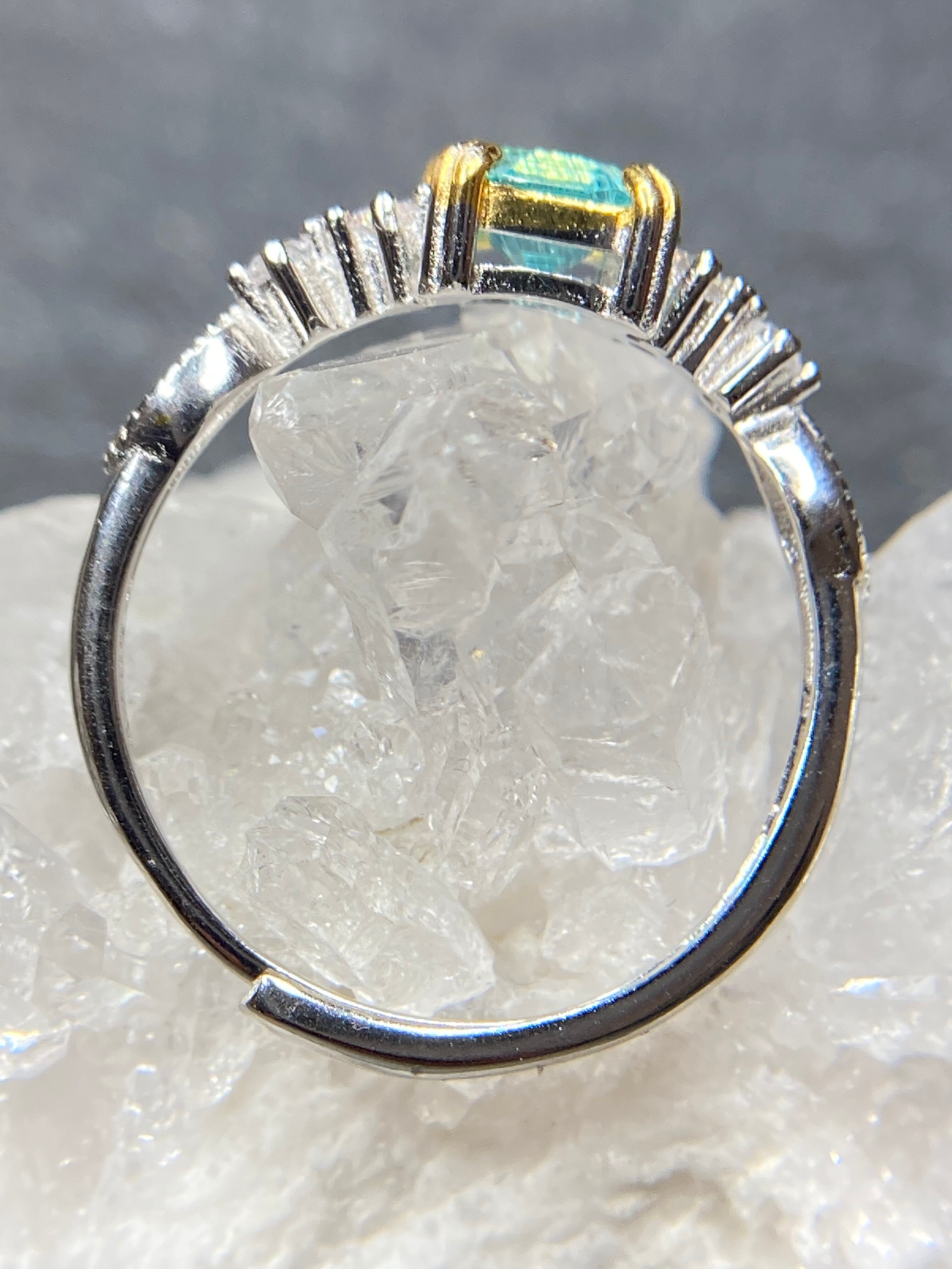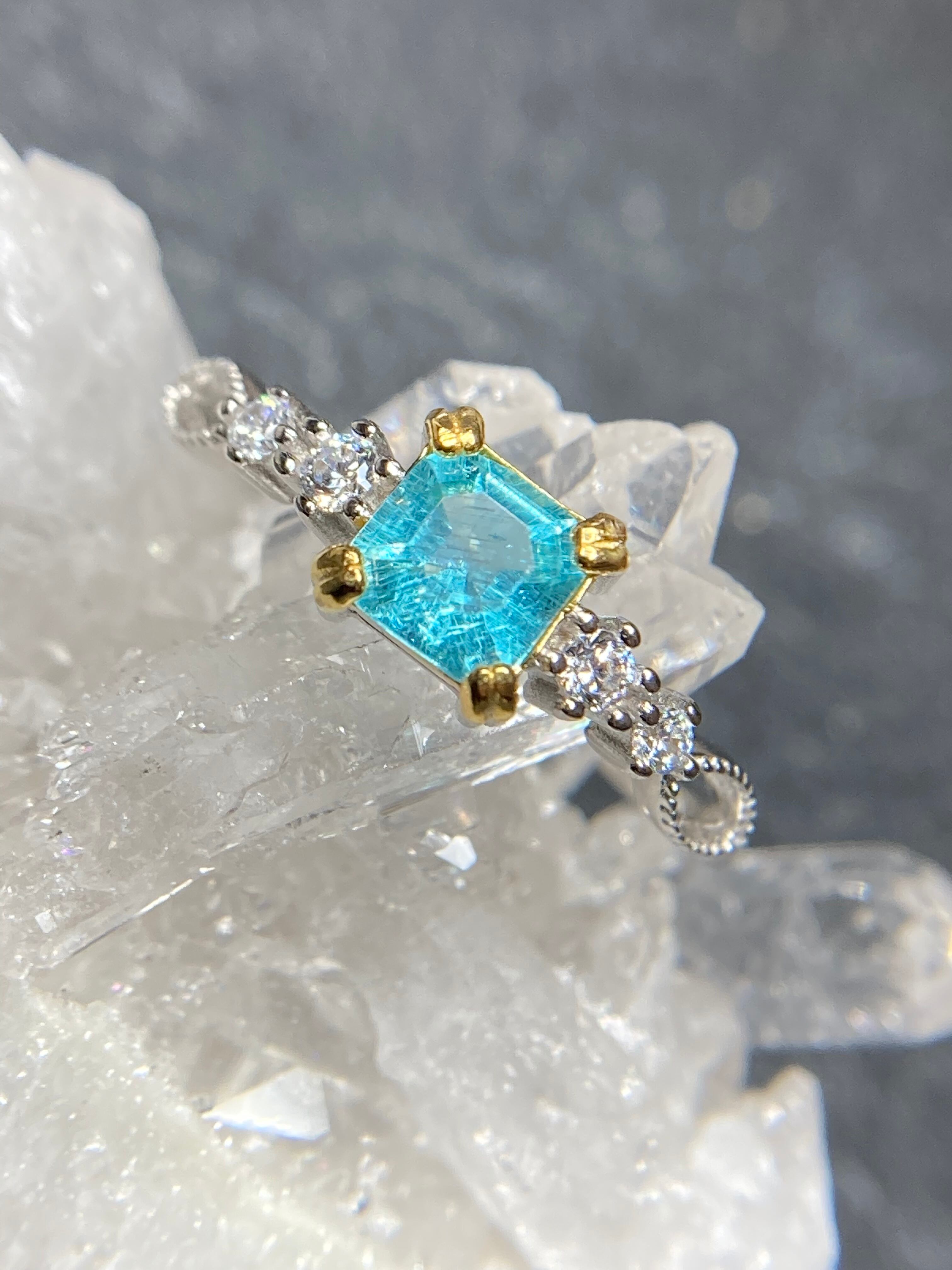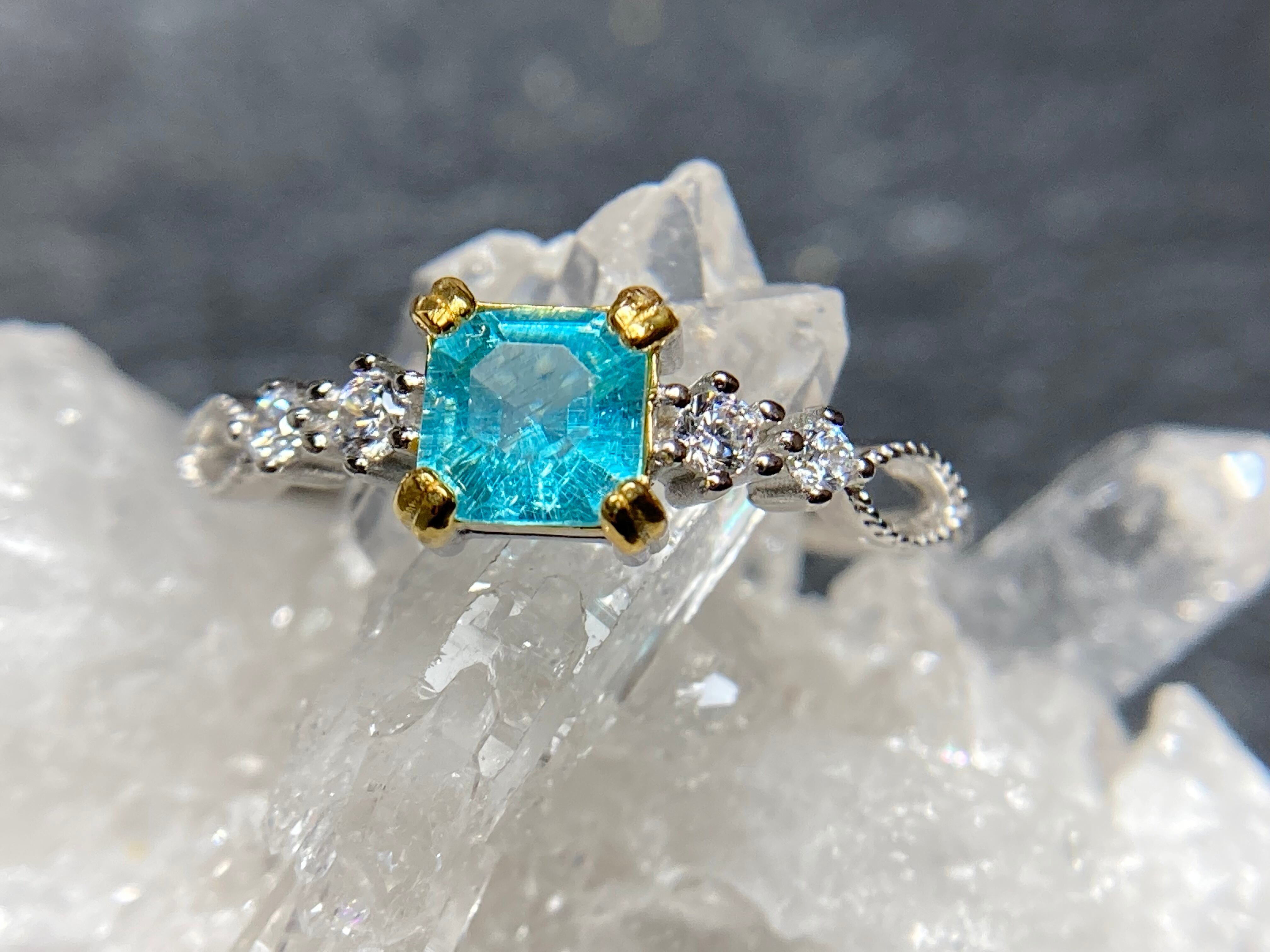 スクエアカットの中に流星群のように美しいインクルージョンが見えるアパタイトのリングです。