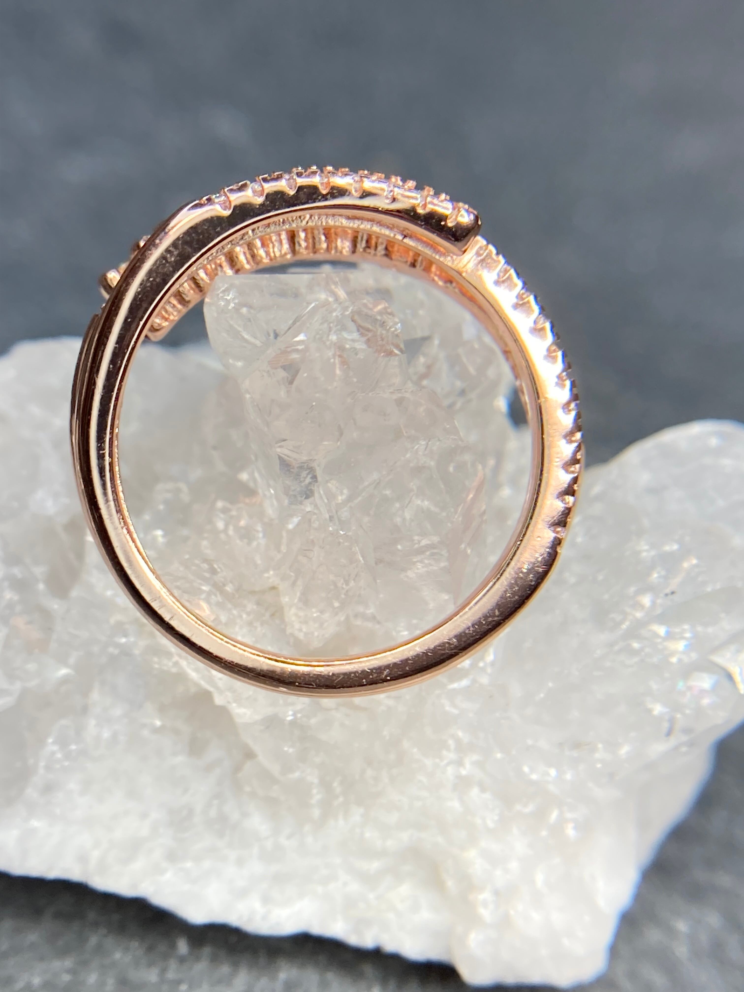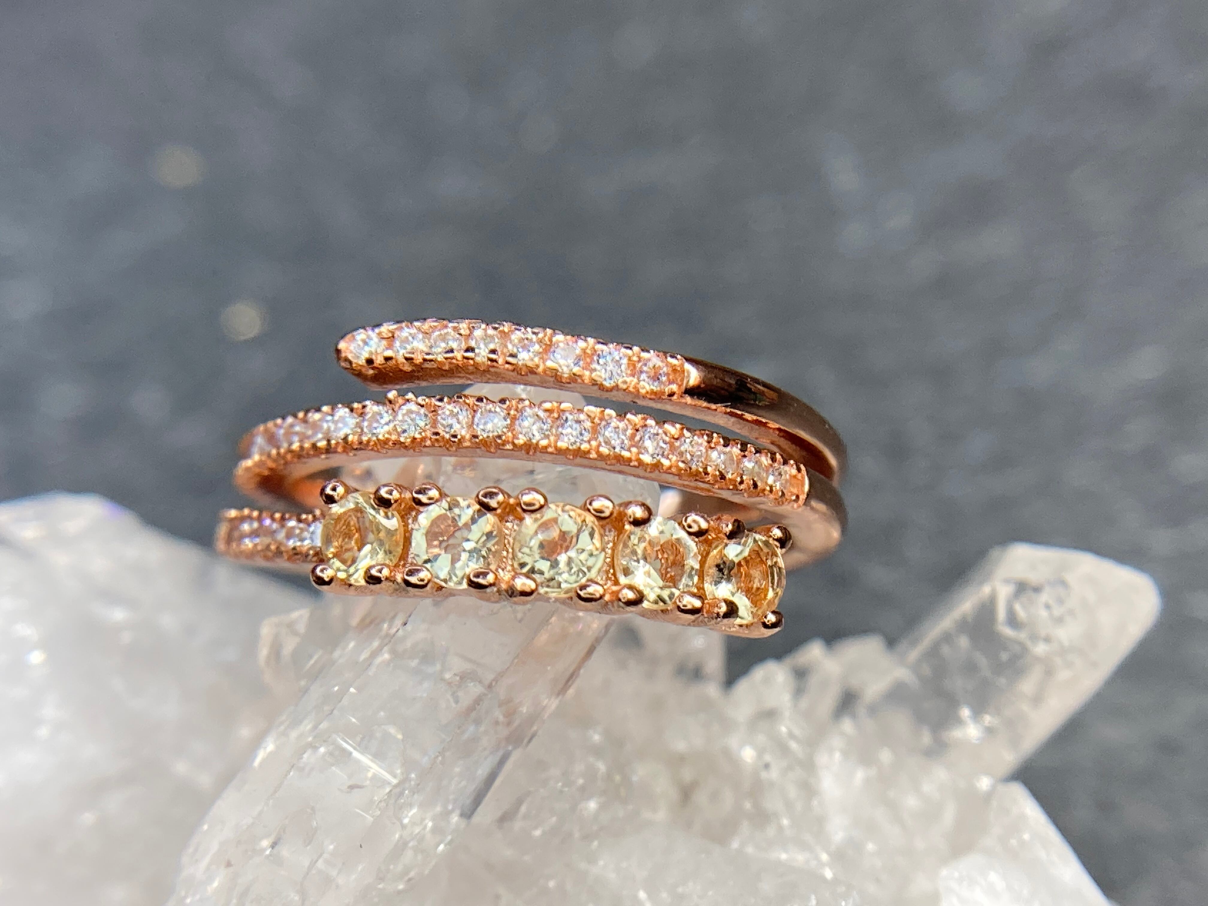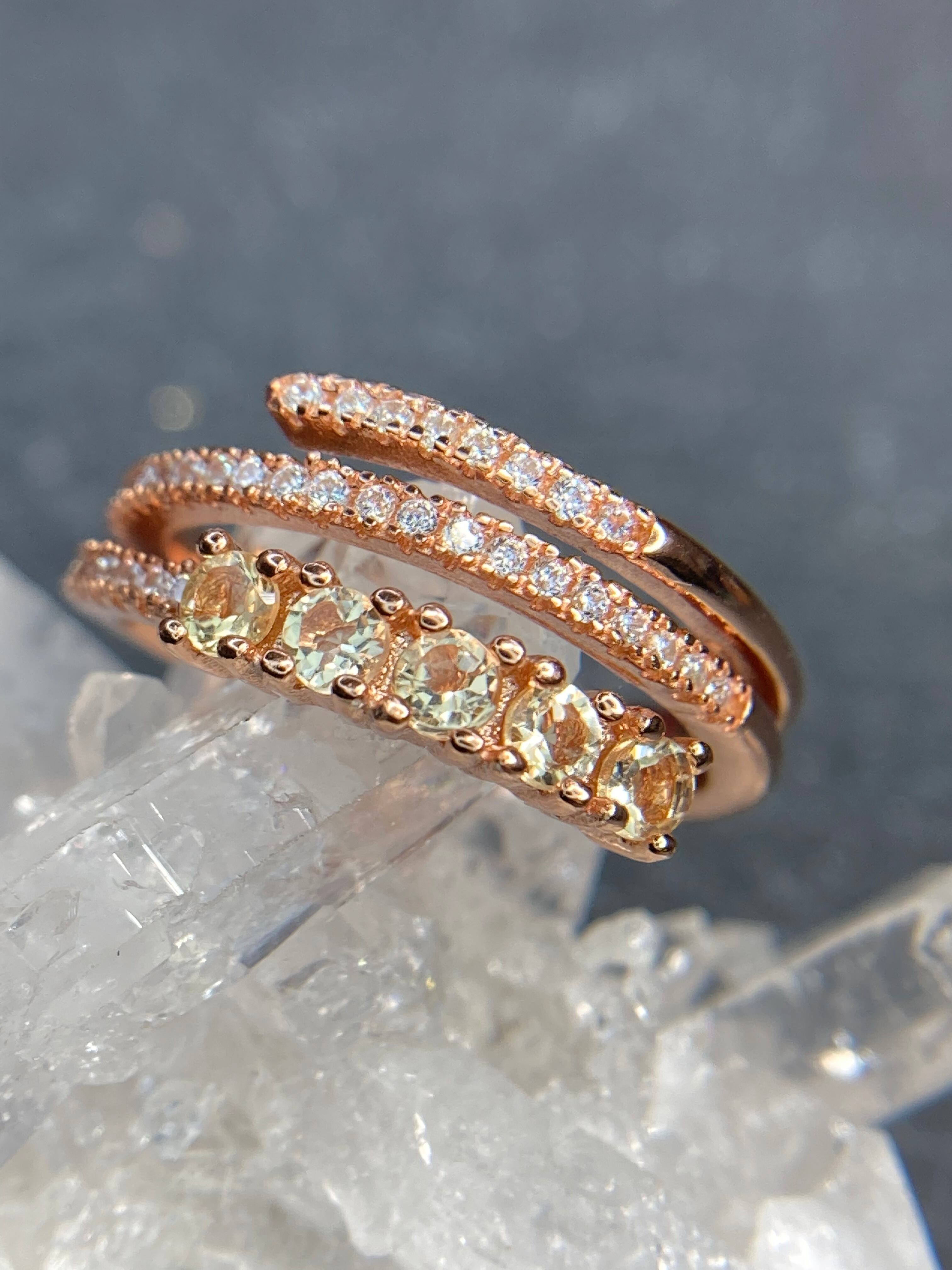 ぐるりと指を護るように重なったデザインのアームに、淡いイエローベリルが並んだ華奢ながらにインパクトのあるリングです。