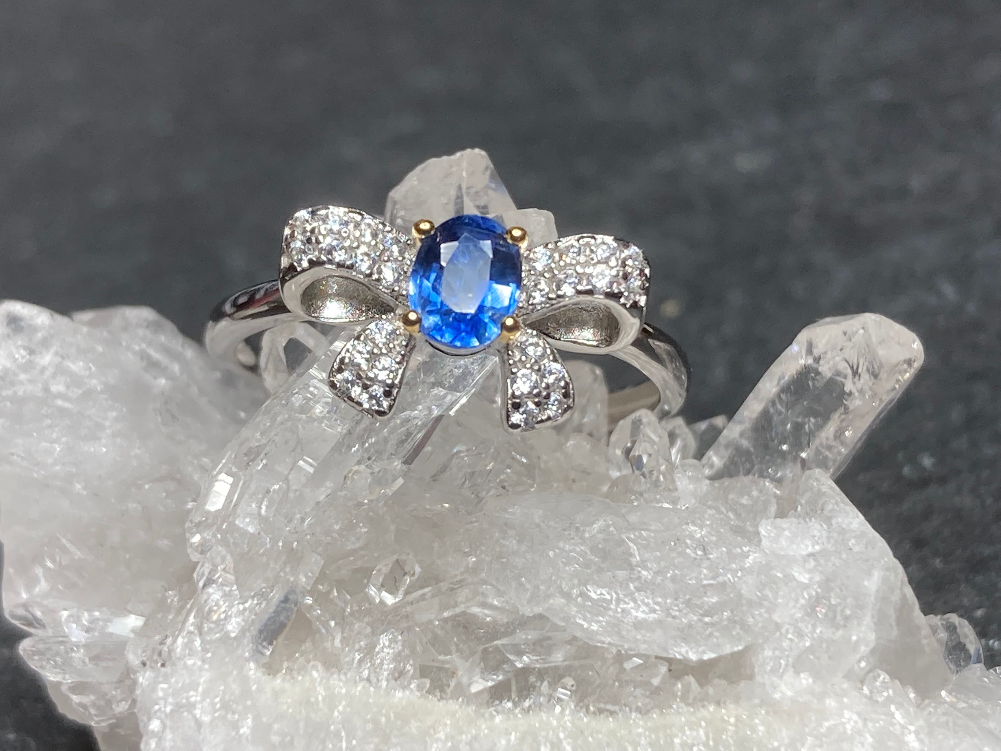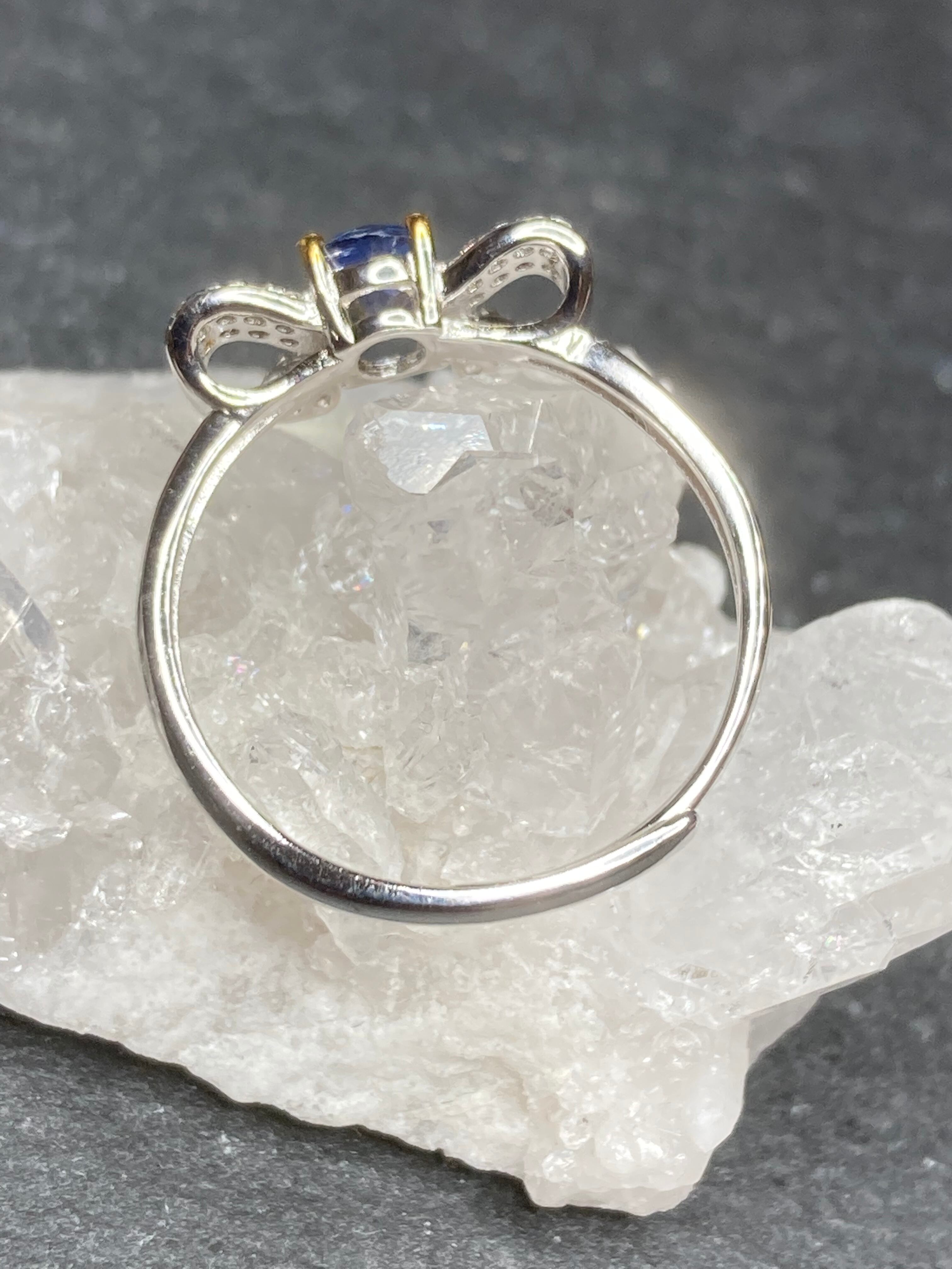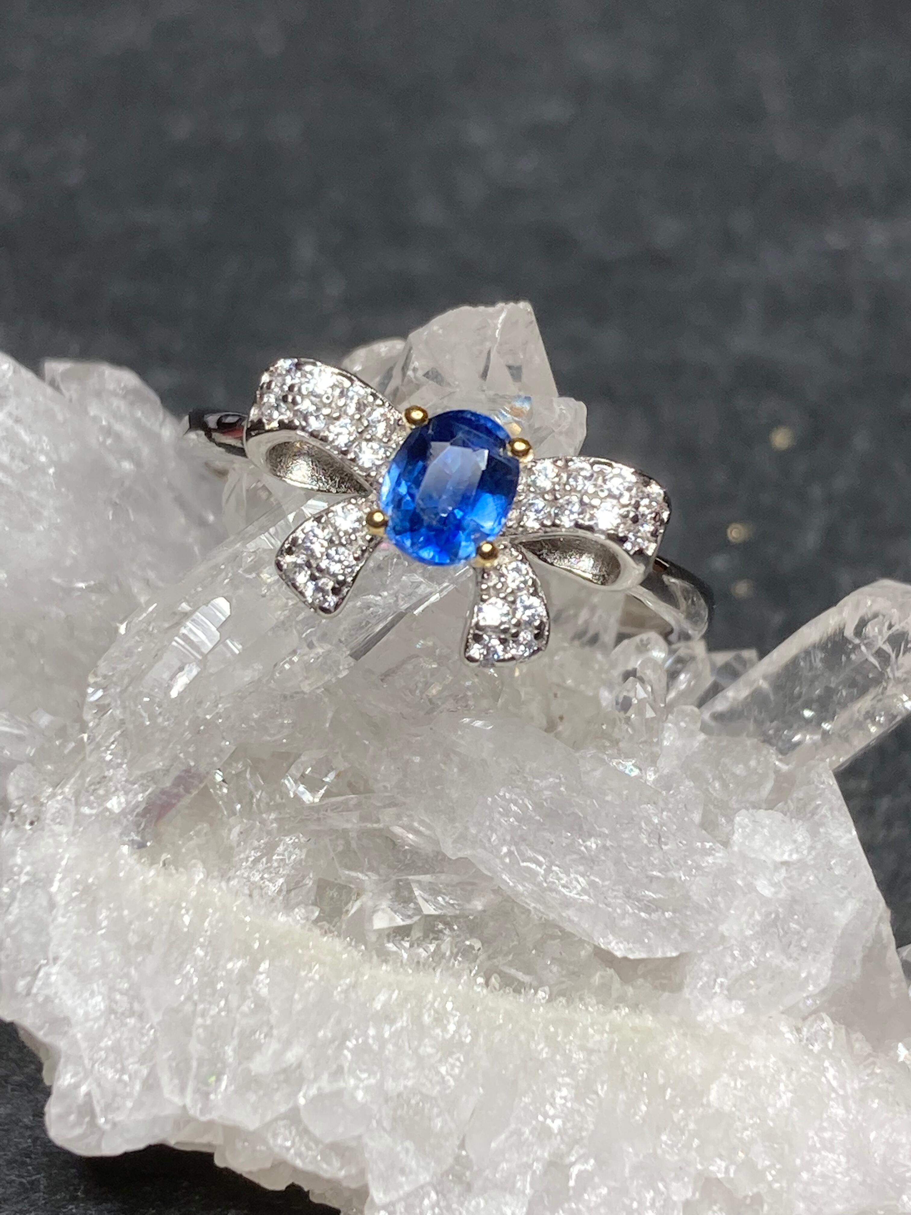 中央にパキッとしたブルーのカイヤナイトをセッティングしたふわりとしたリボンモチーフのリングです。