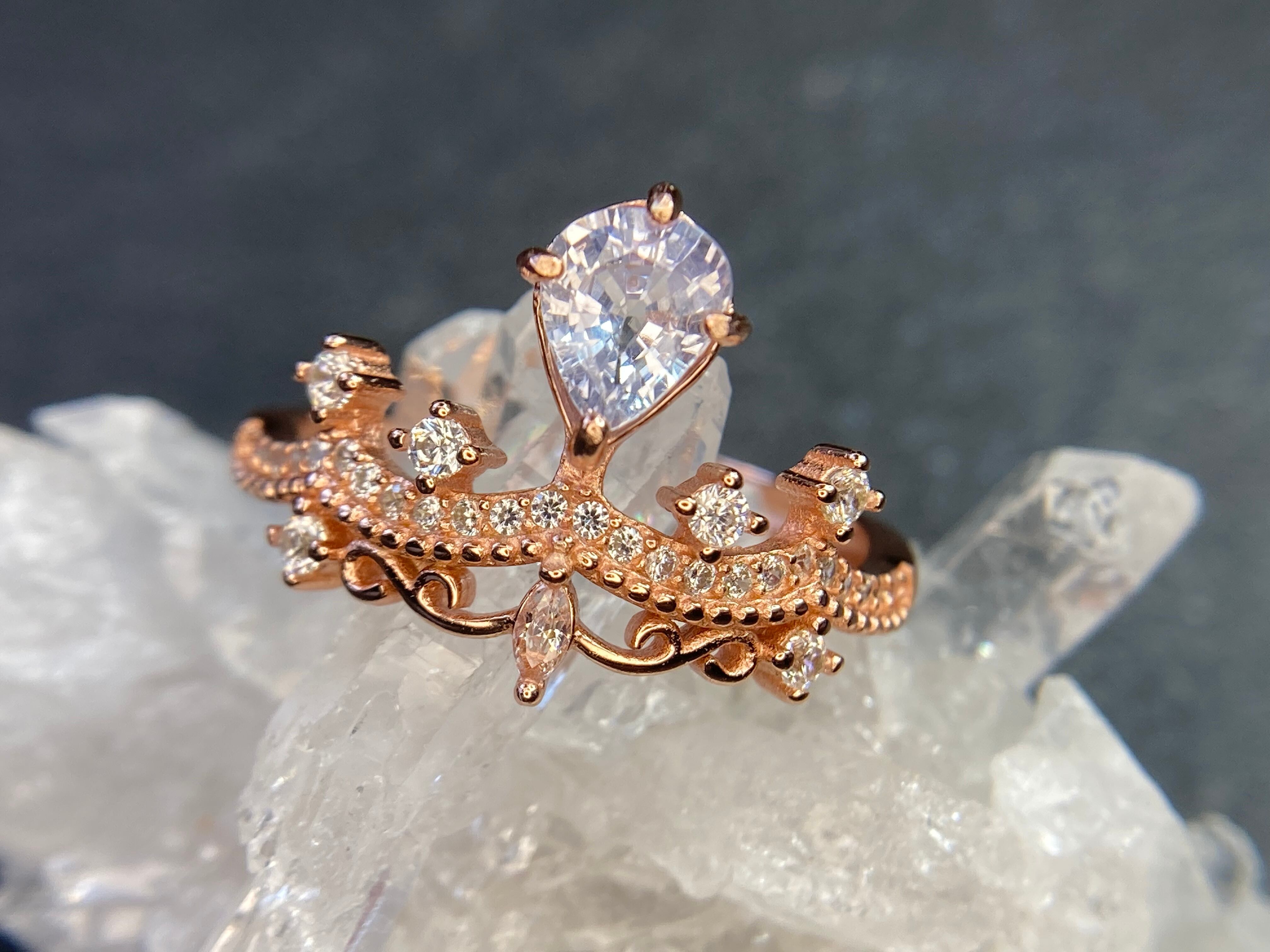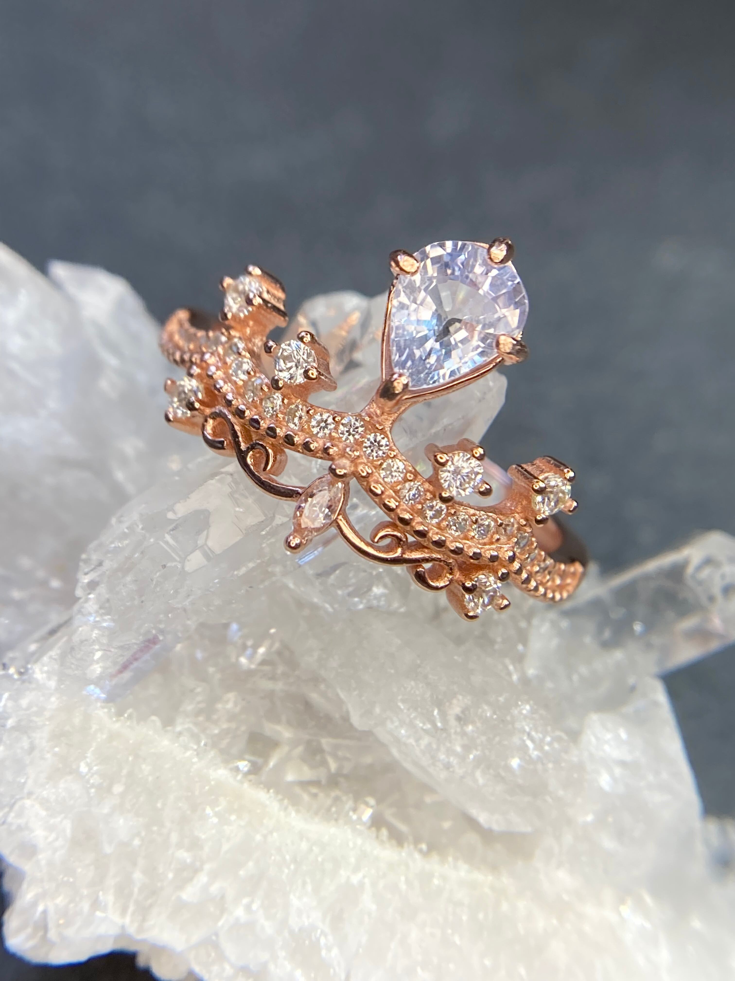 まるでシャンデリアのように美しいデザインのトップからアイスブルーのサファイアが零れ落ちんばかりに輝いているゴージャスなリングです。