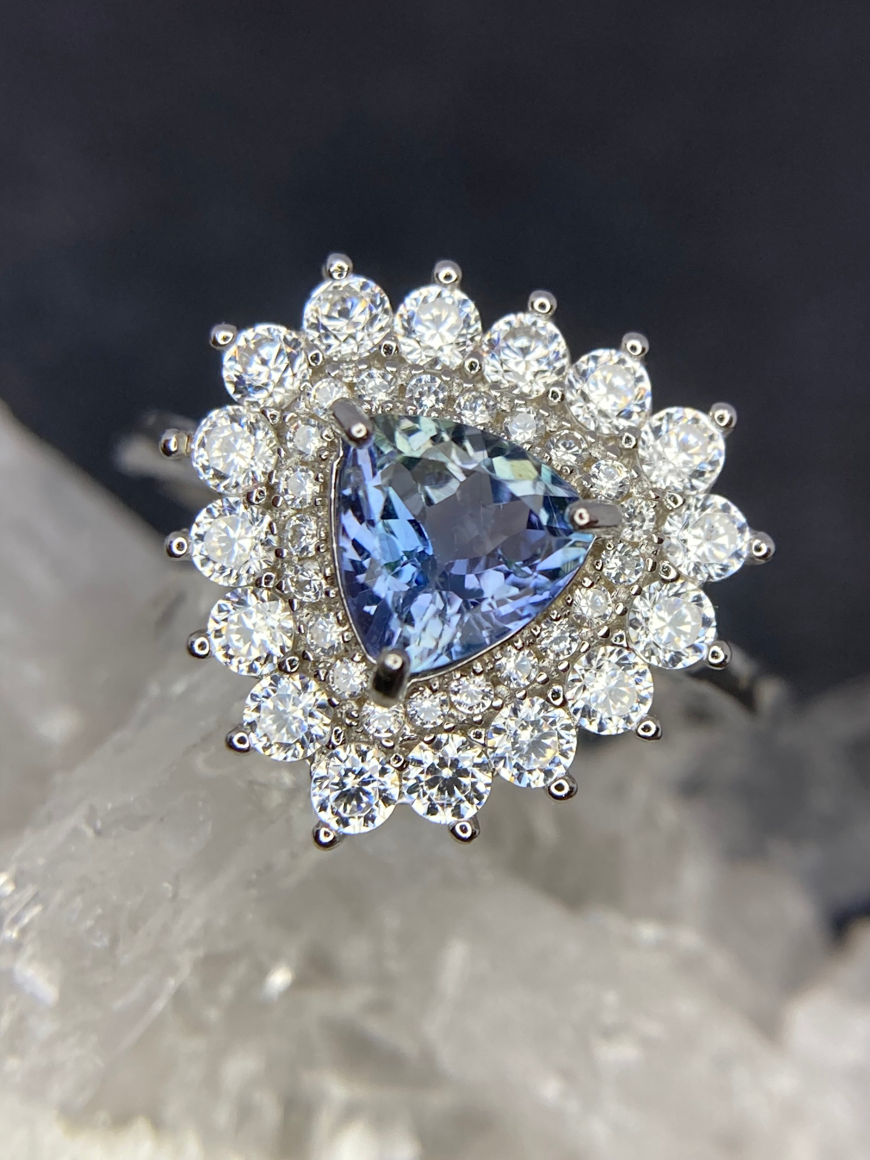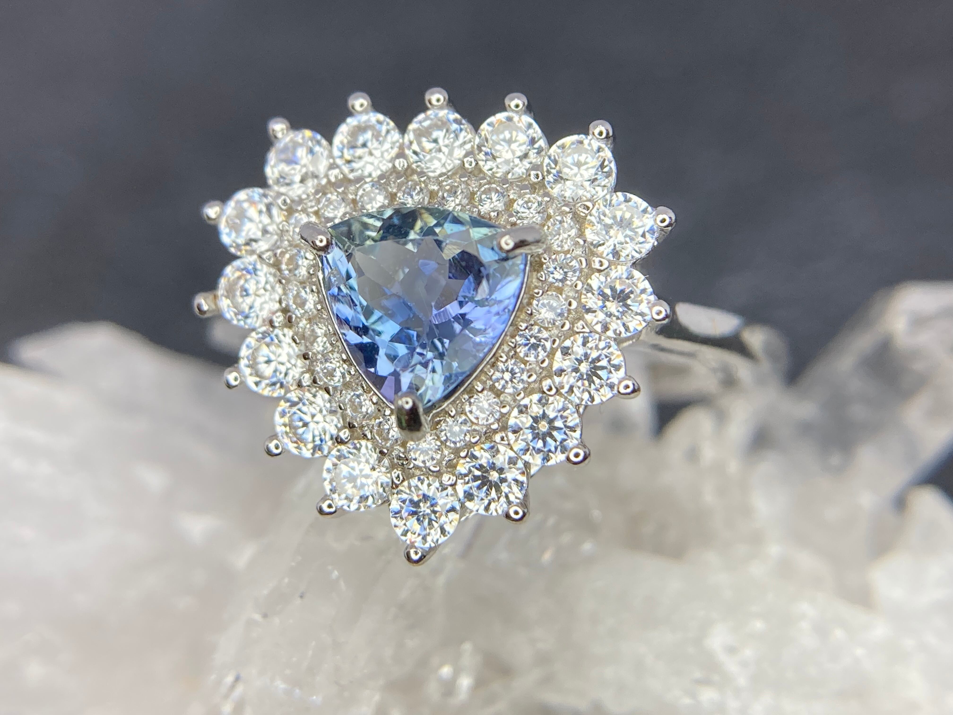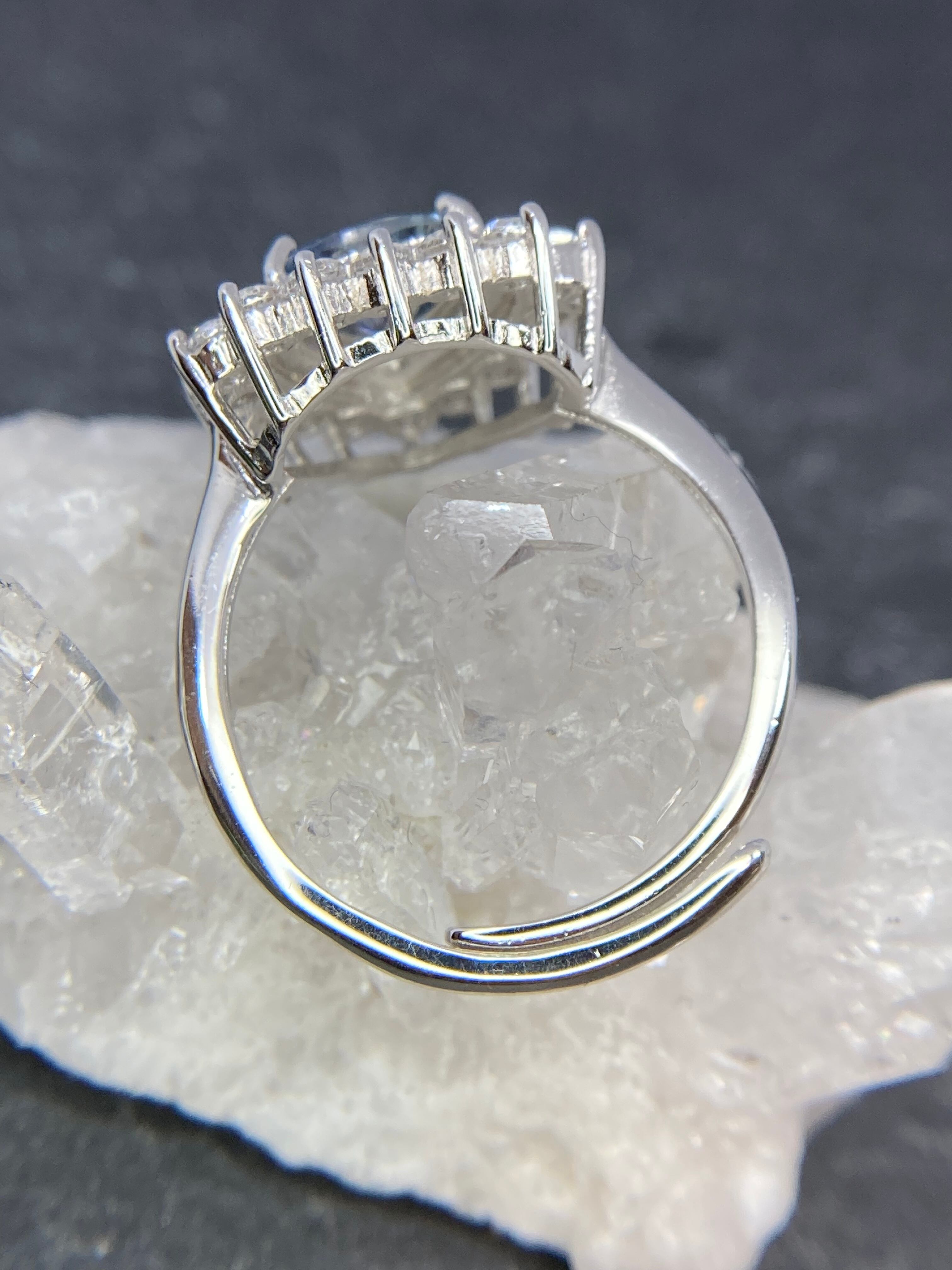 煌びやかに散るジルコニアの中央に佇む、淡めブルーが美しいゾイサイトのリングです。