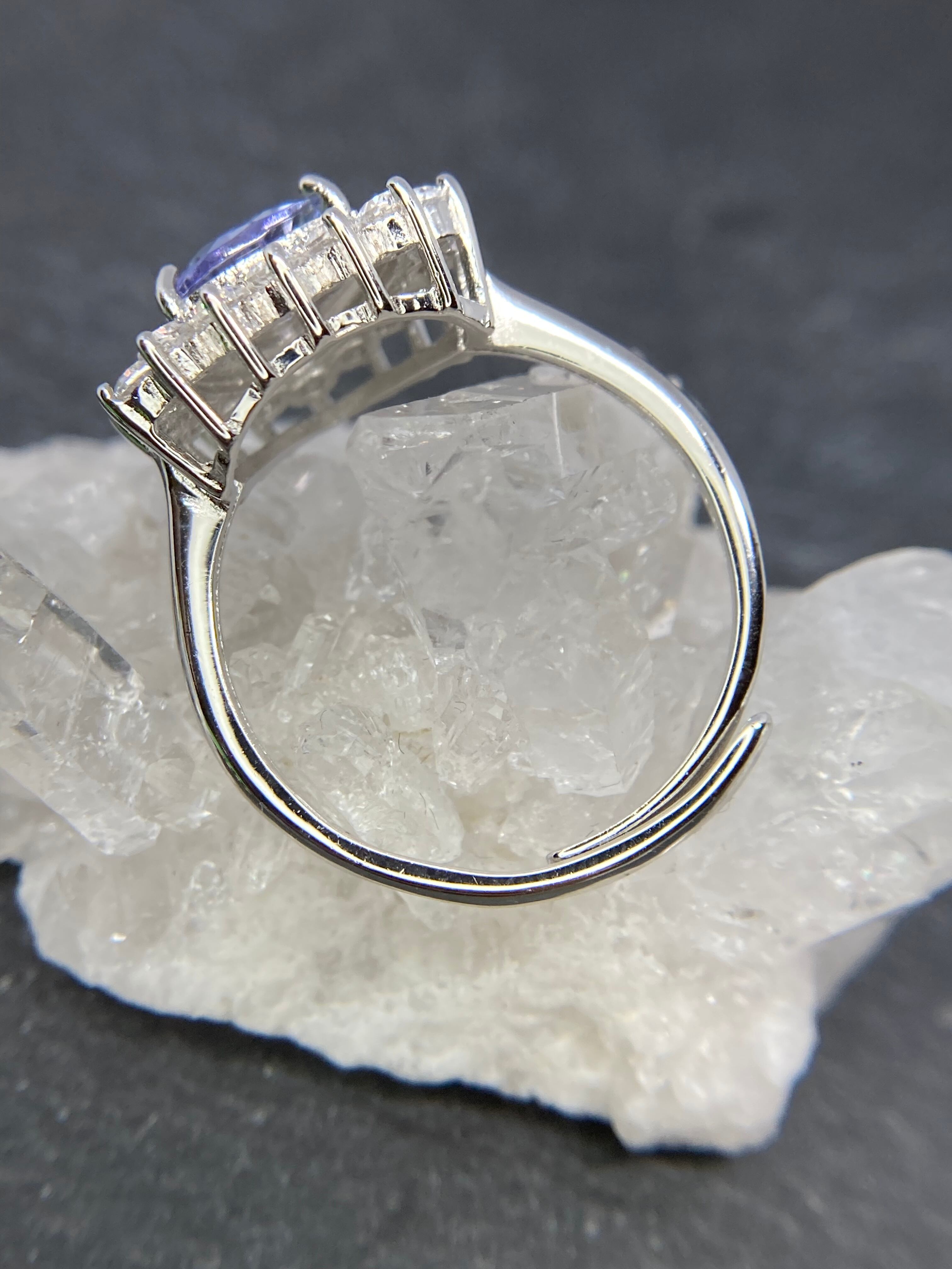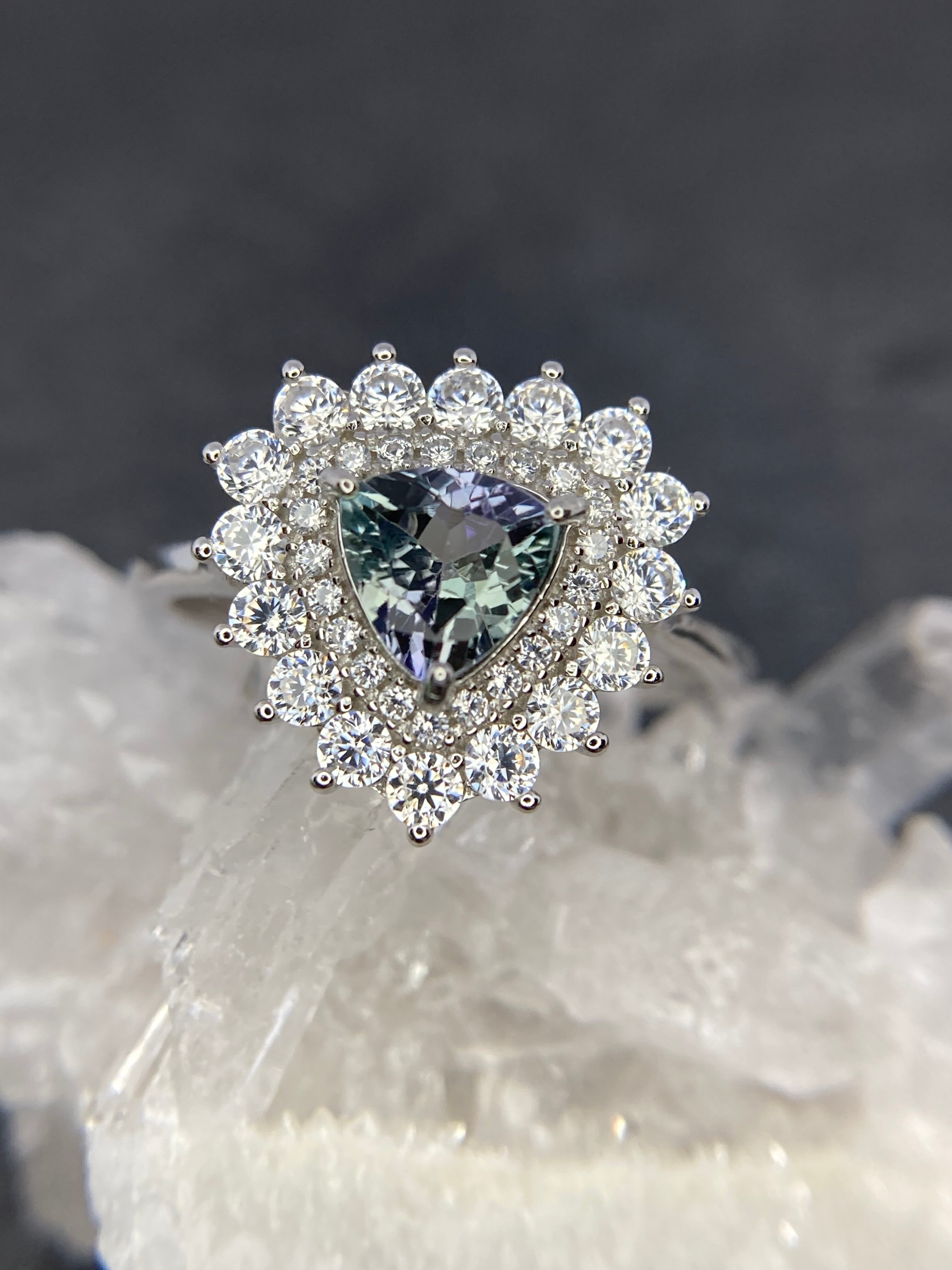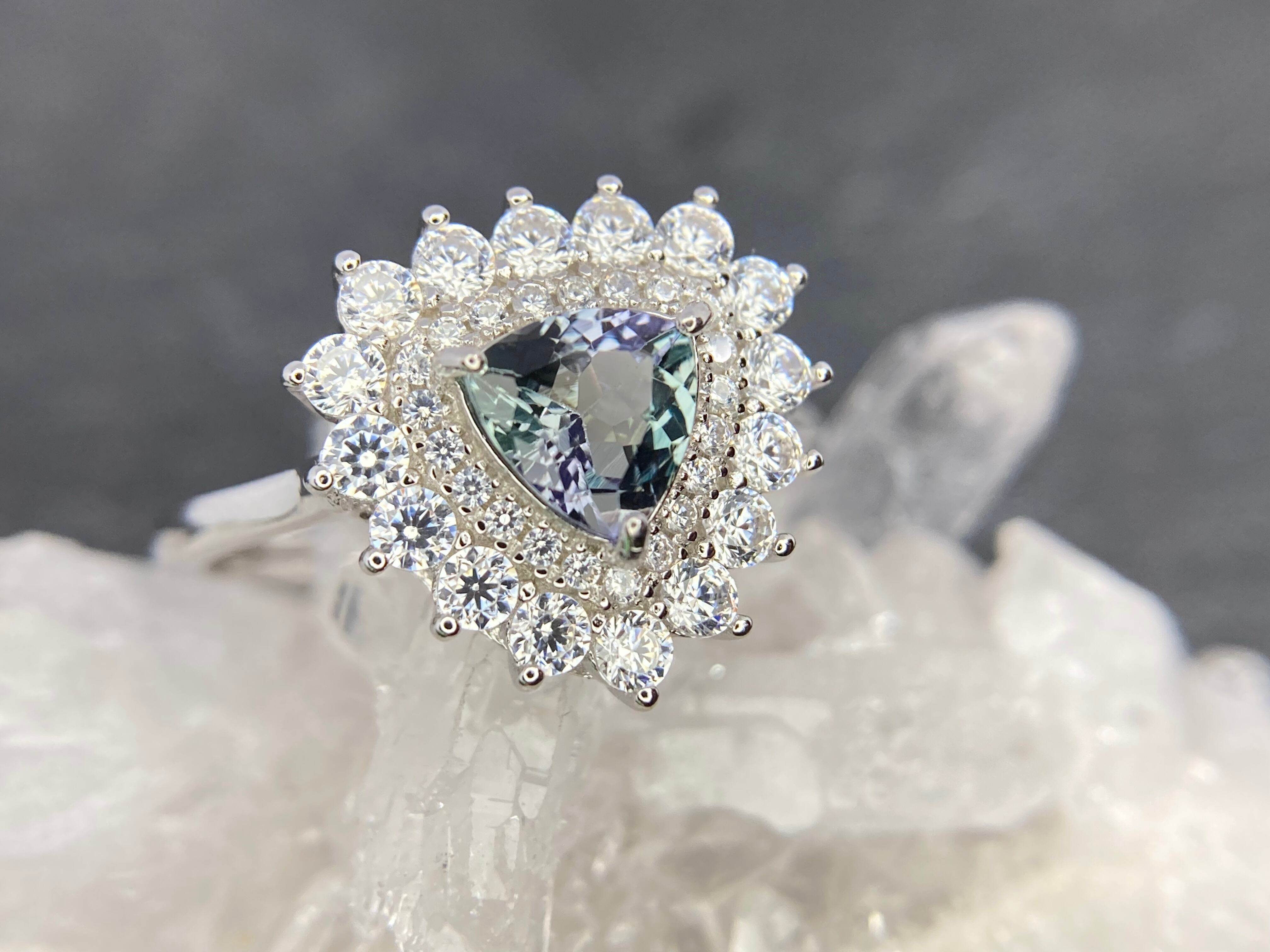 煌びやかに散るジルコニアの中央に佇む、緑が美しいゾイサイトのリングです。