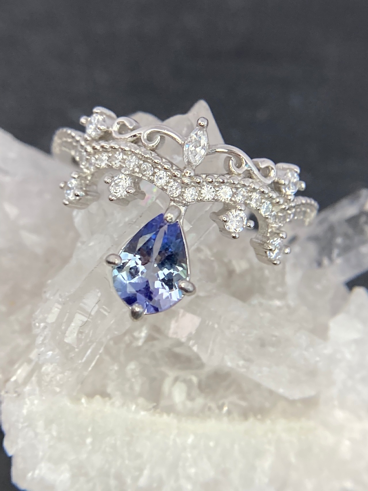 まるでシャンデリアのように美しいデザインのトップからバイカラーのゾイサイトが零れ落ちんばかりに輝いているゴージャスなリングです。