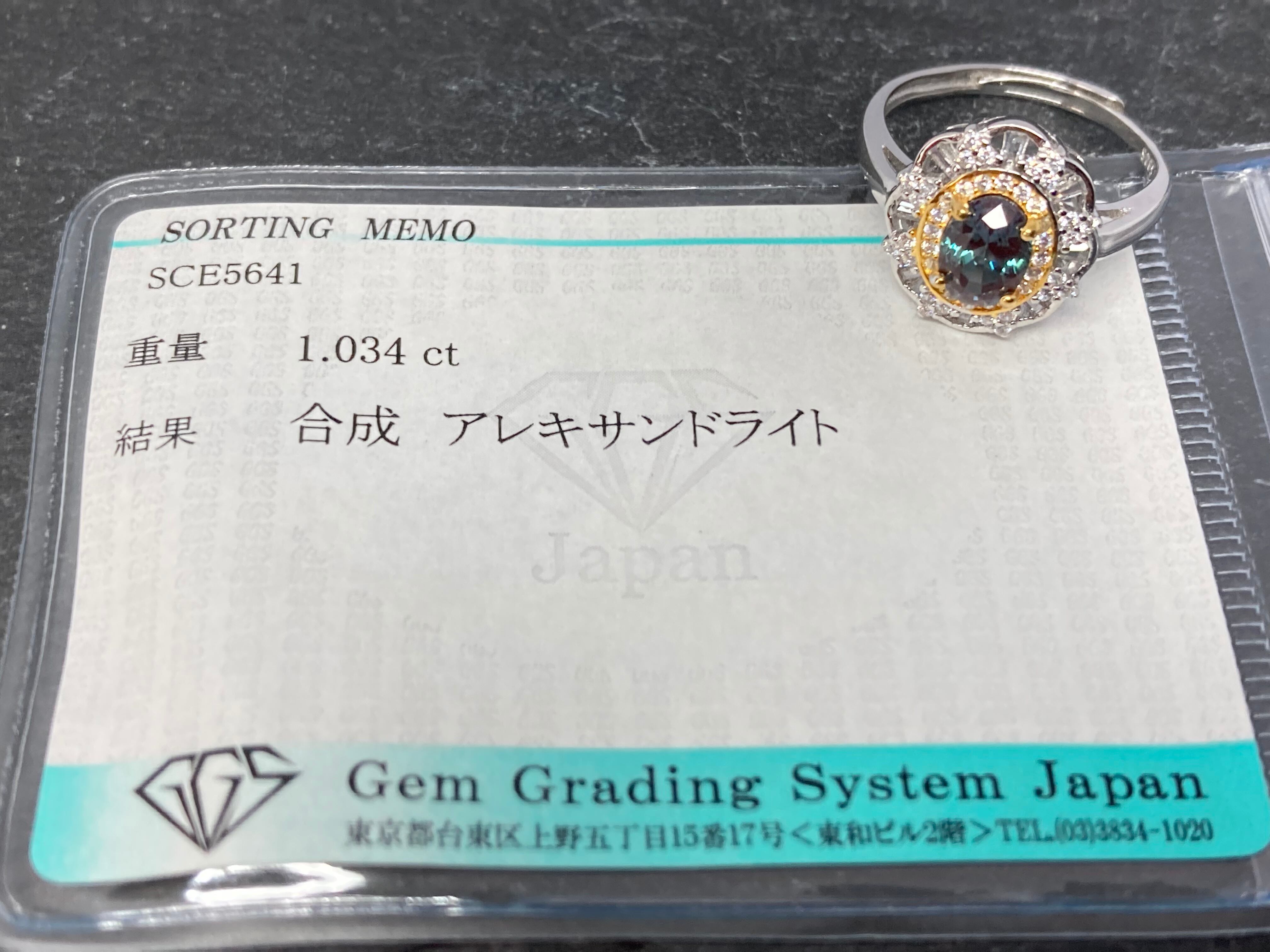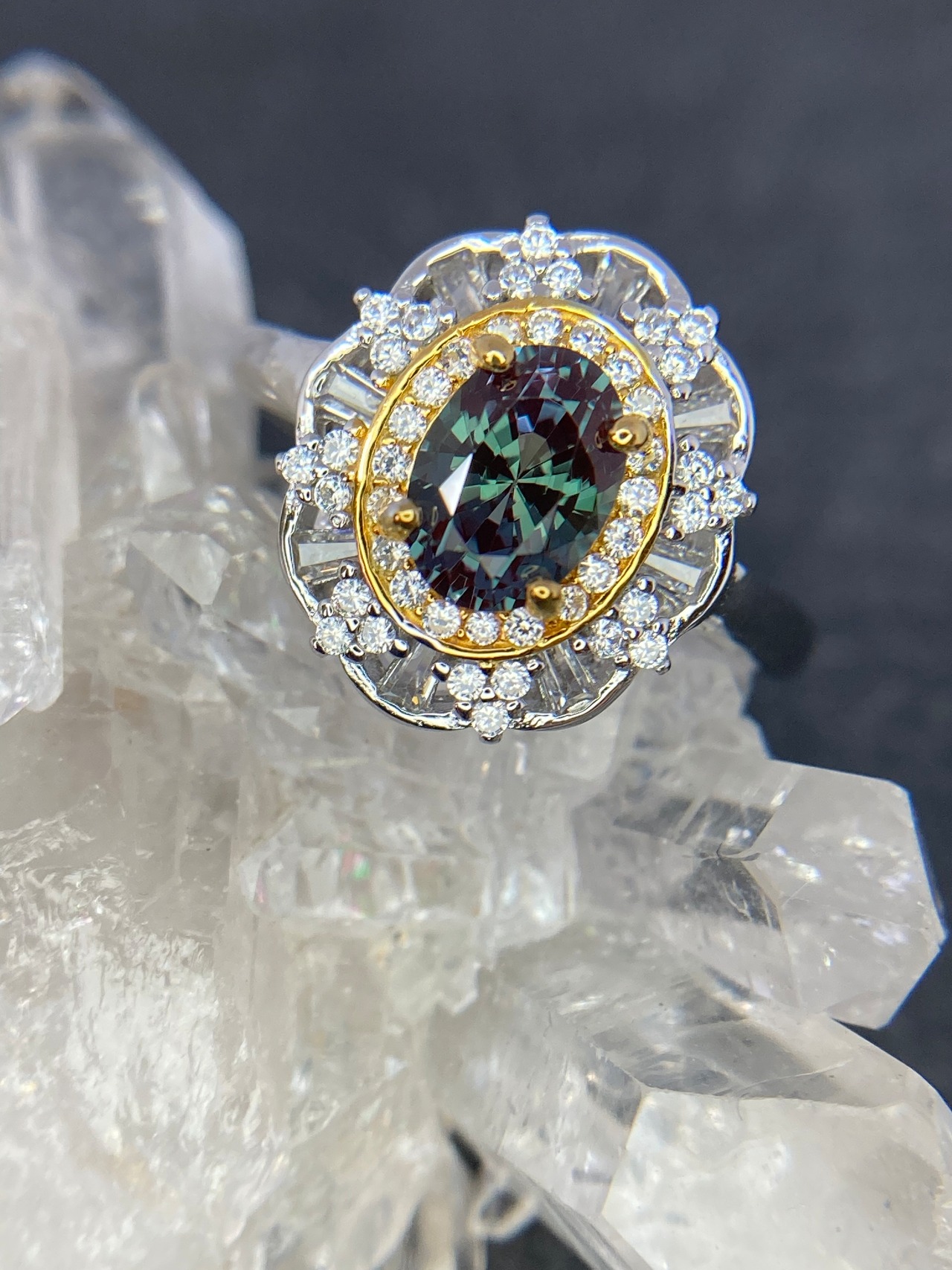 ダークグリーンが美しい合成アレキサンドライトが中央に鎮座したゴージャスなリングです。