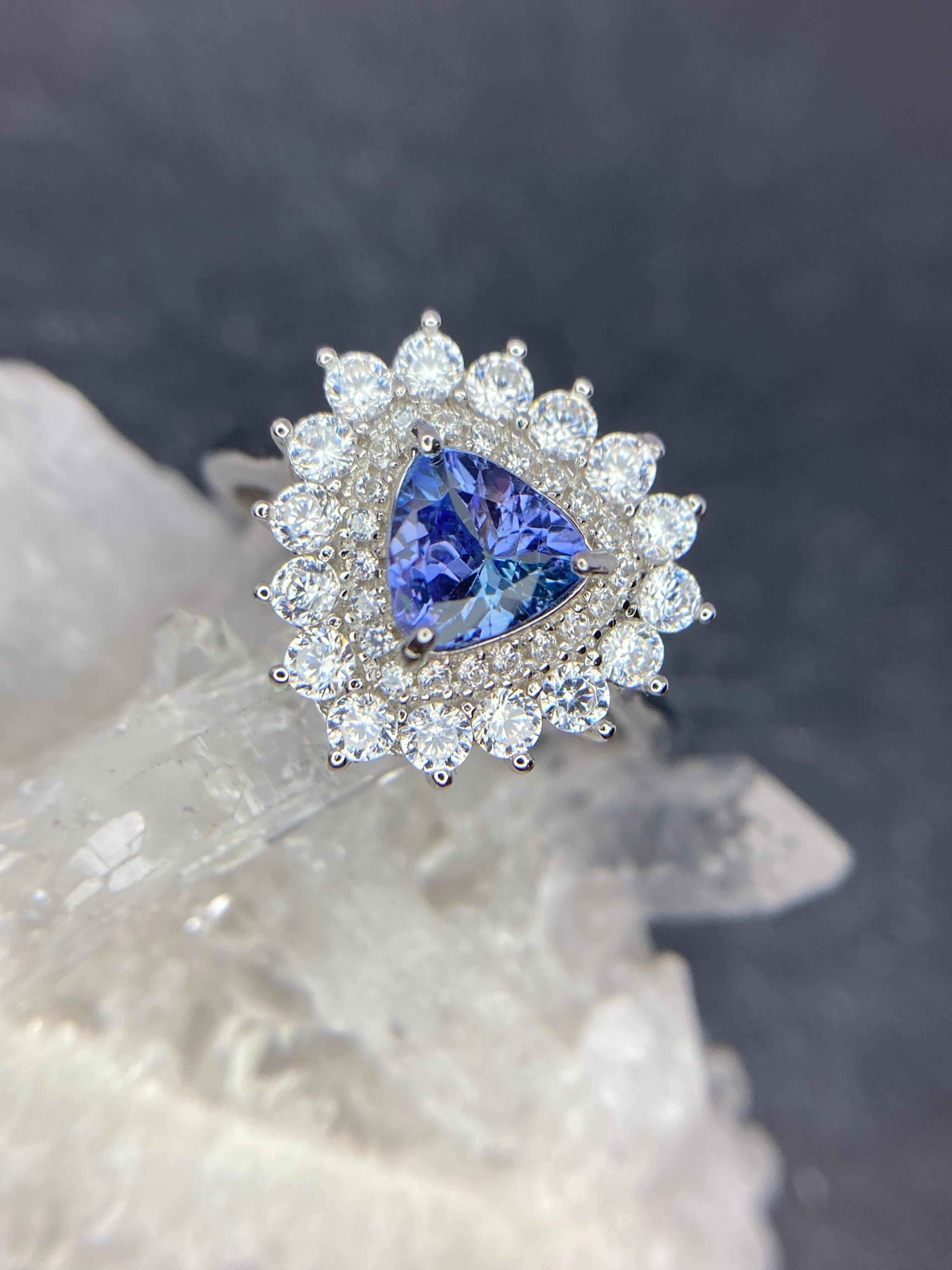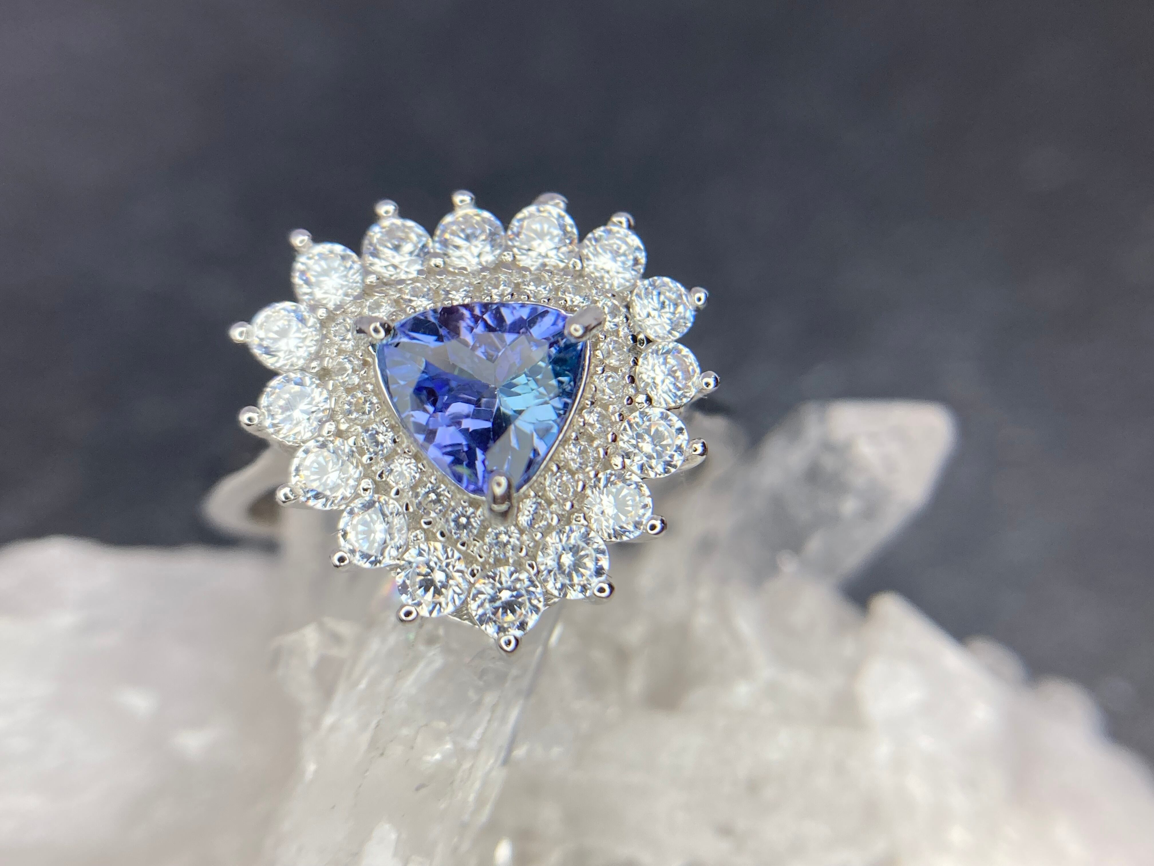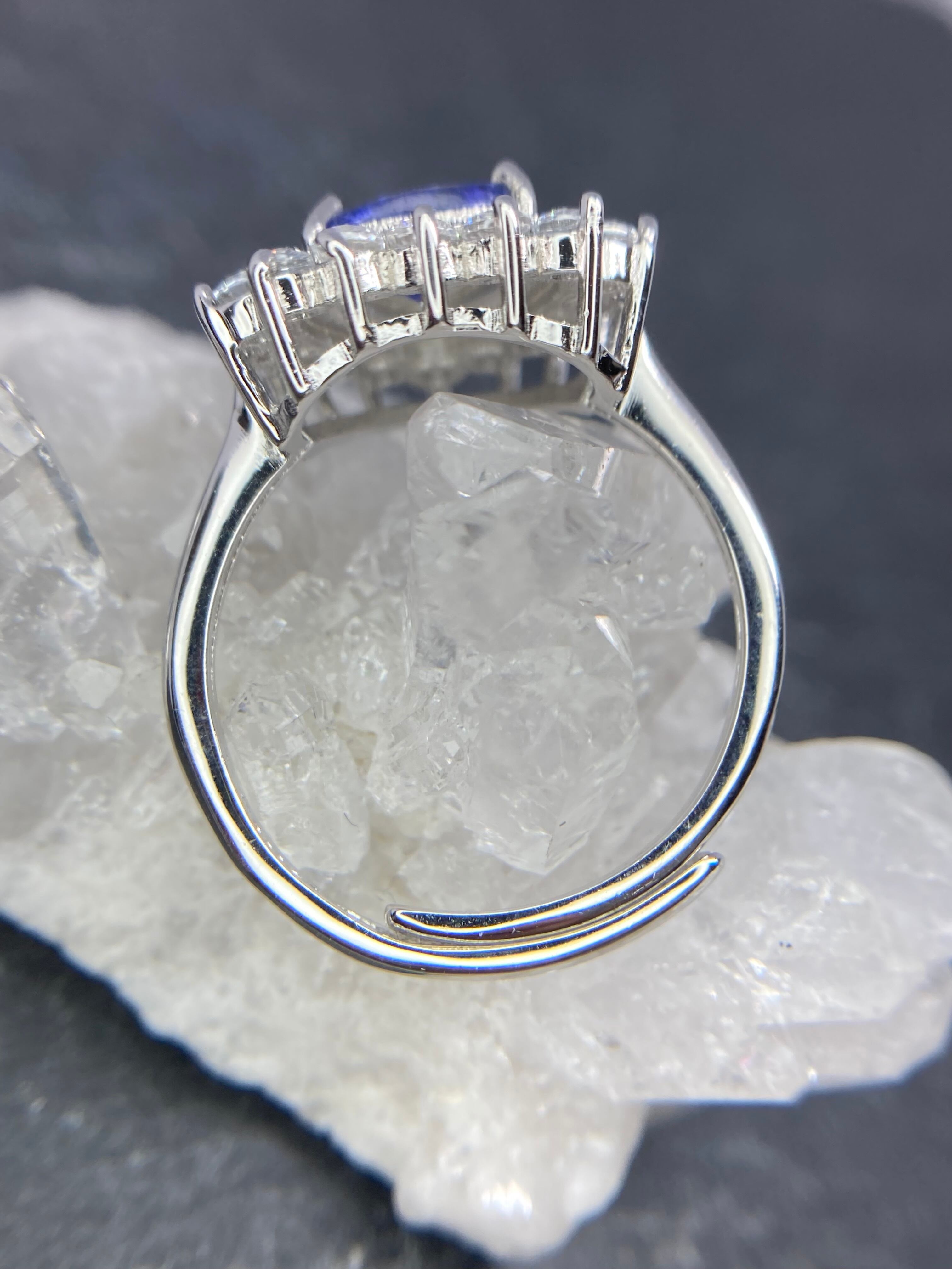 煌びやかに散るジルコニアの中央に佇む、青が美しいゾイサイトのリングです。