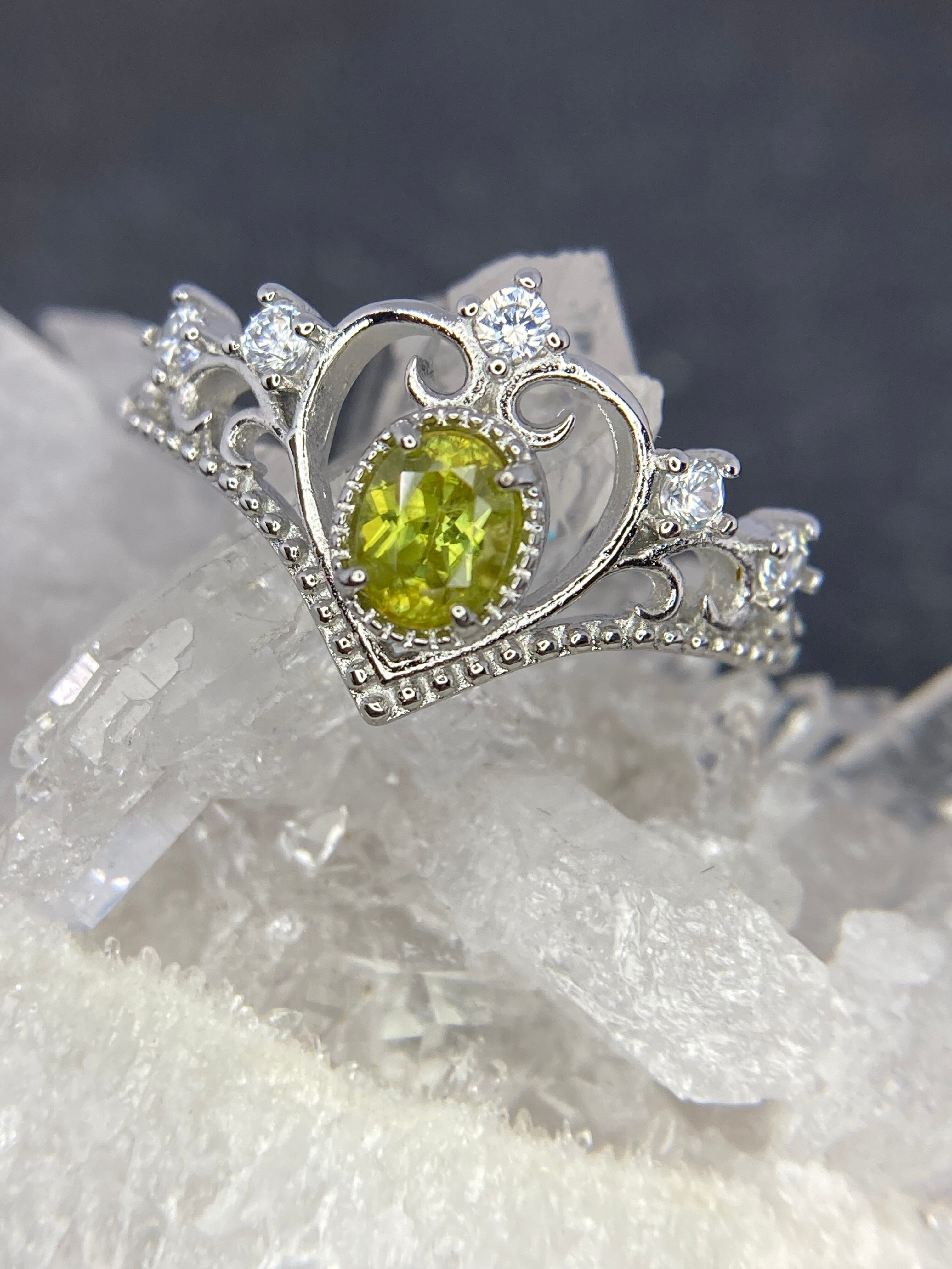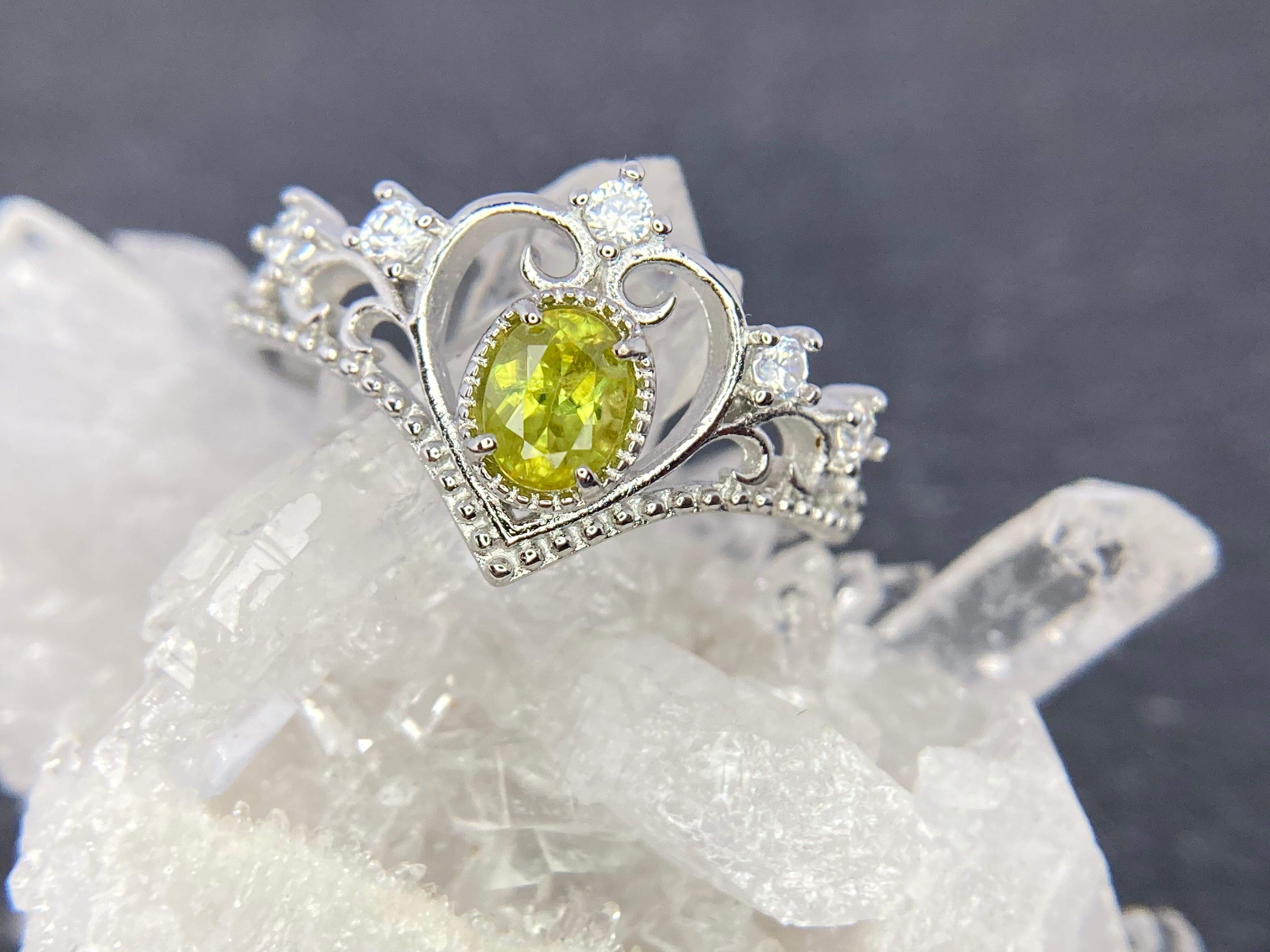 大きなハートに囲まれて輝く、イエローグリーンが美しいスフェーン。