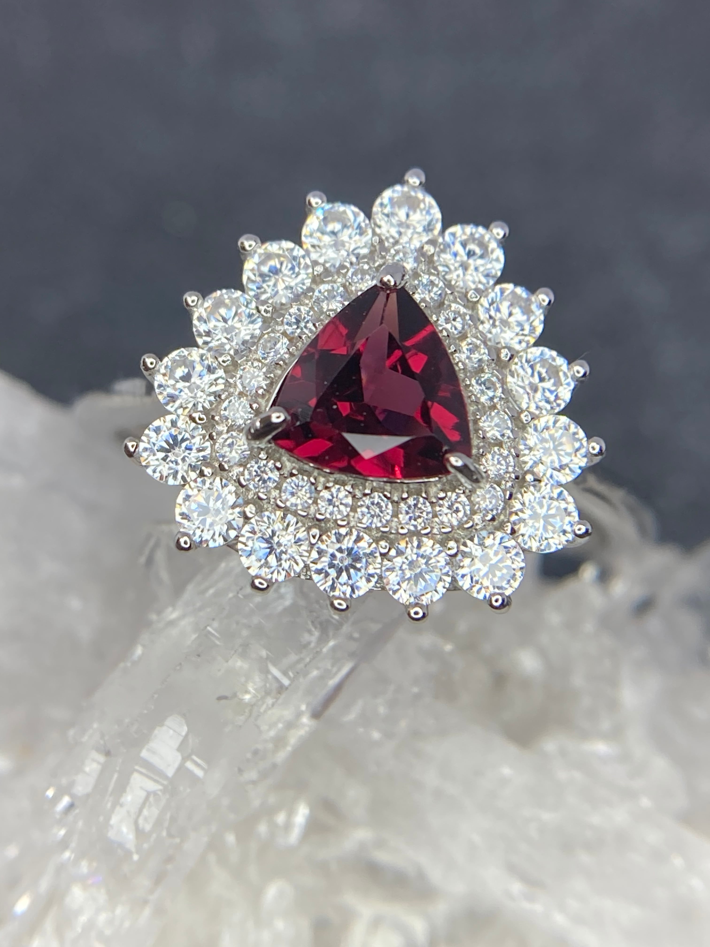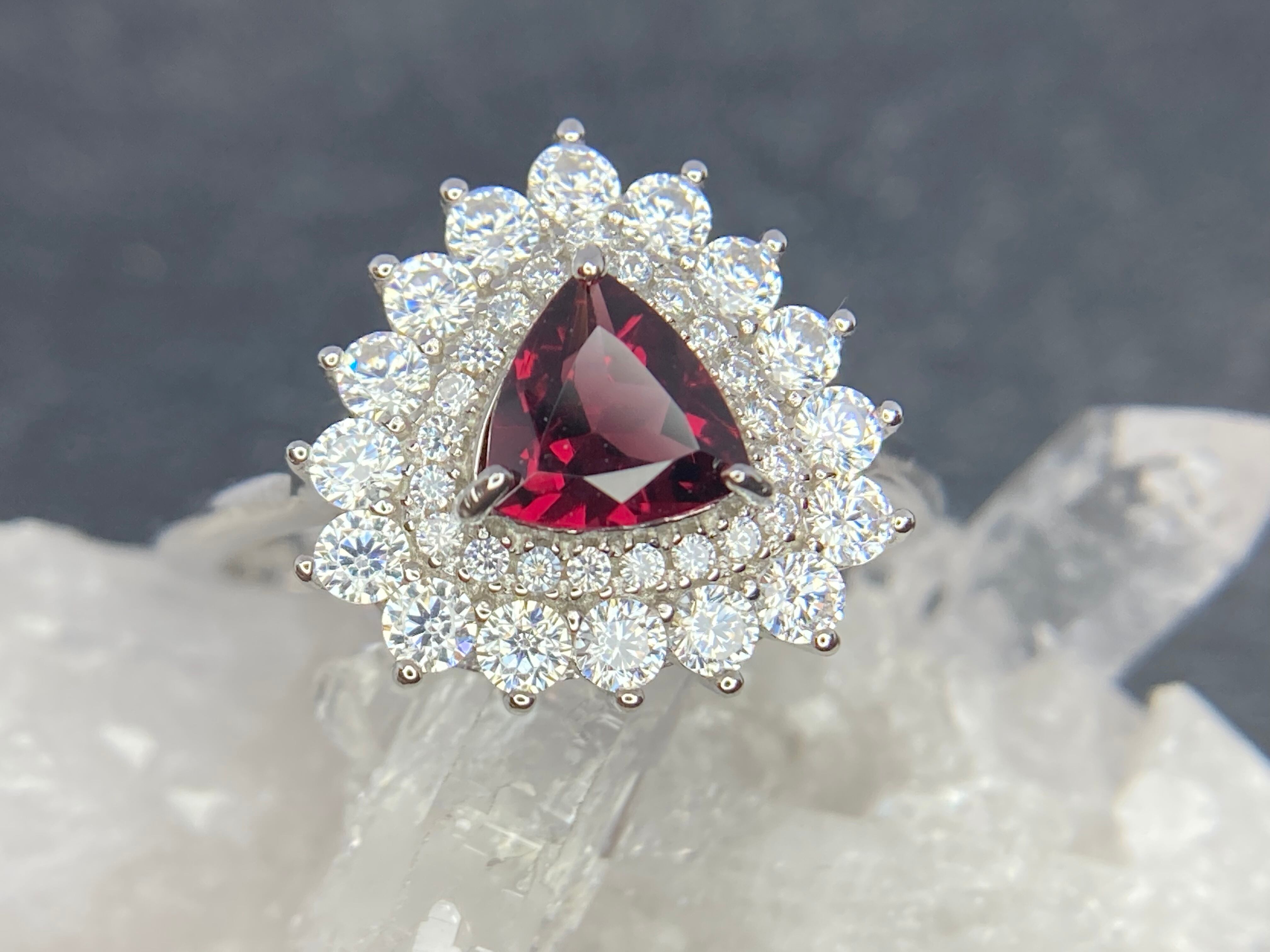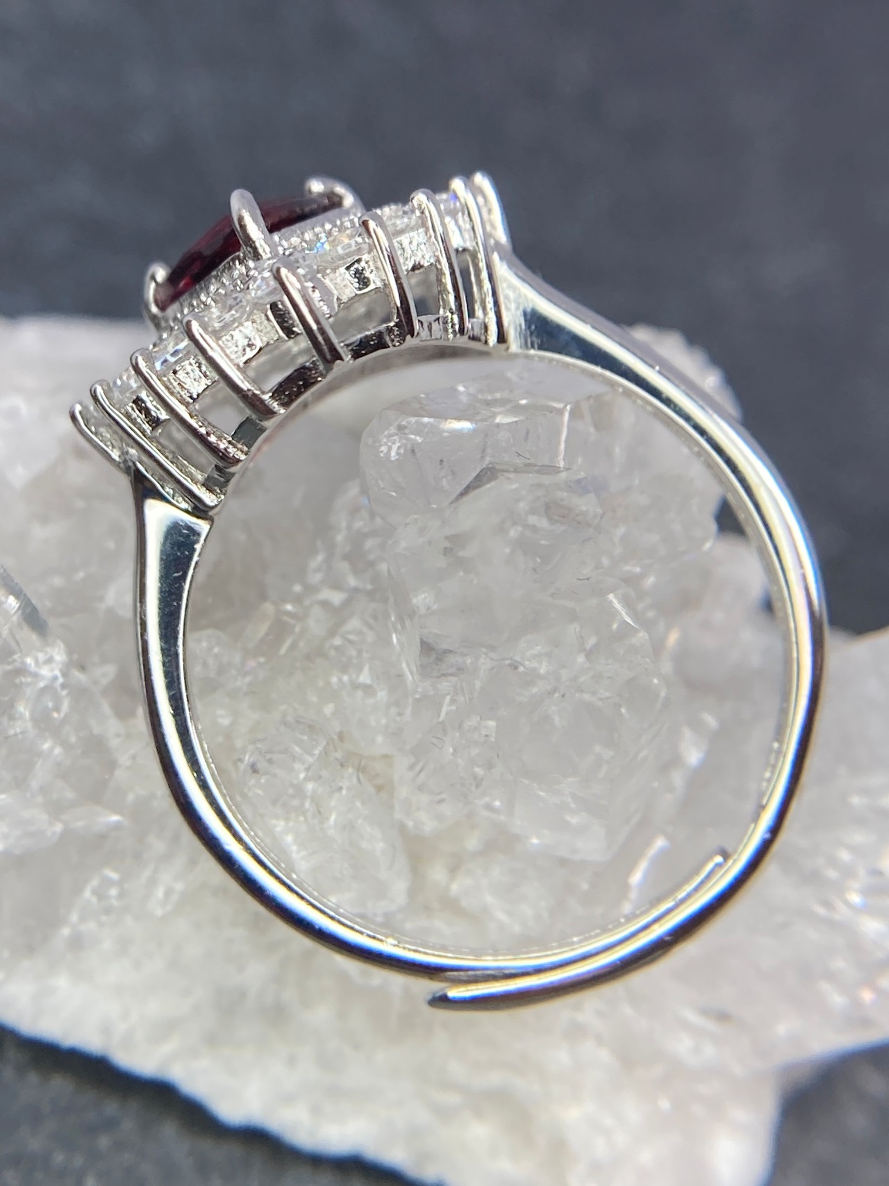 煌びやかに散るジルコニアの中央に佇む、こっくりと深いワインレッドが美しいロードライトガーネットのリングです。