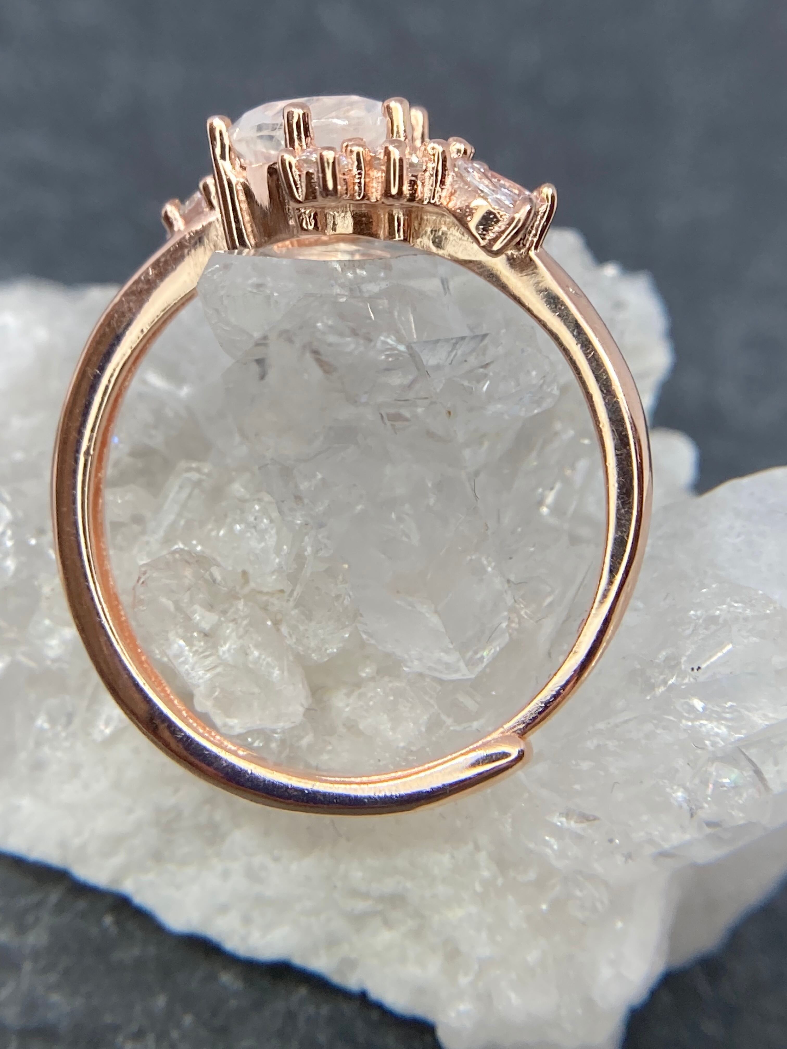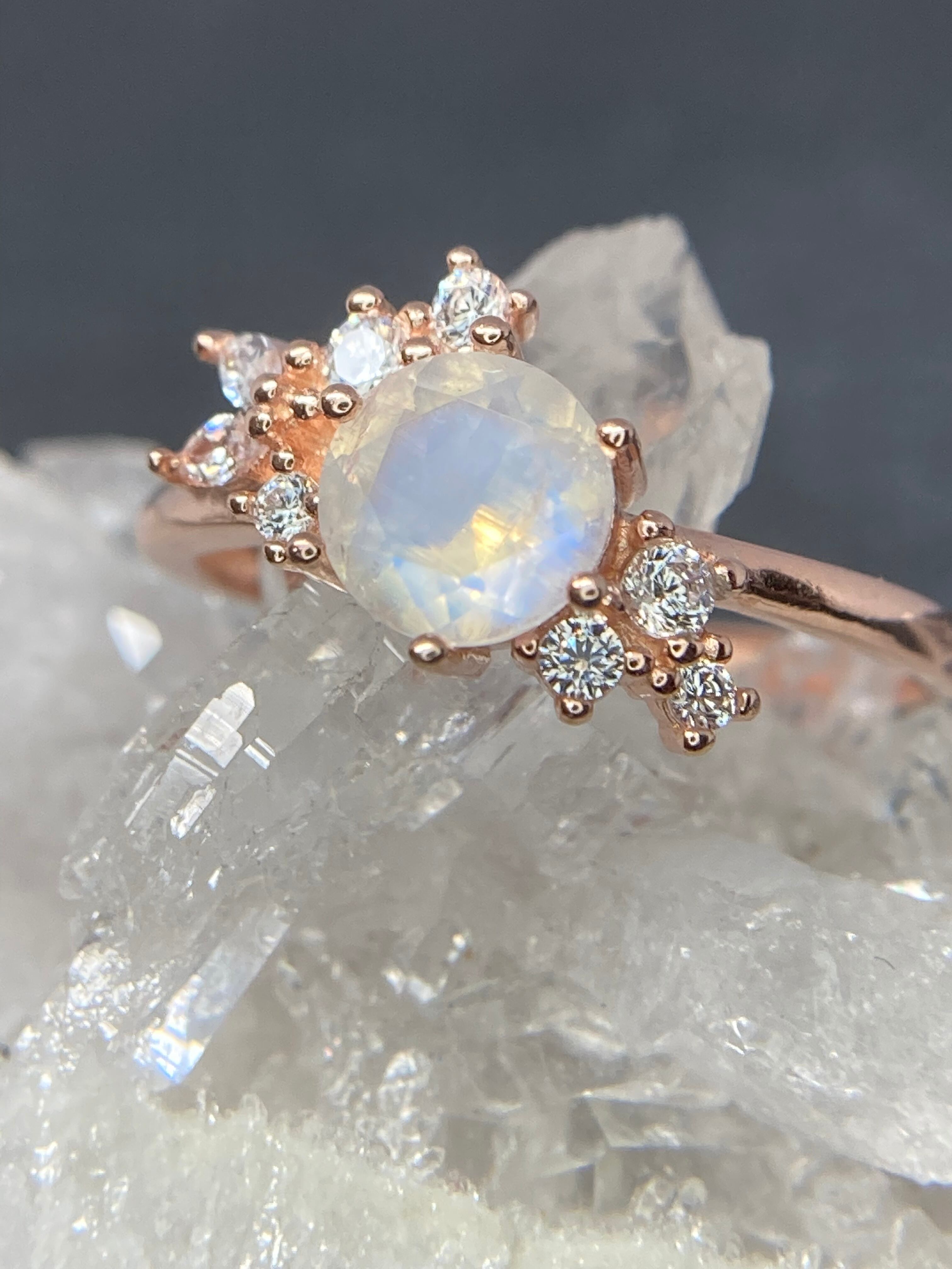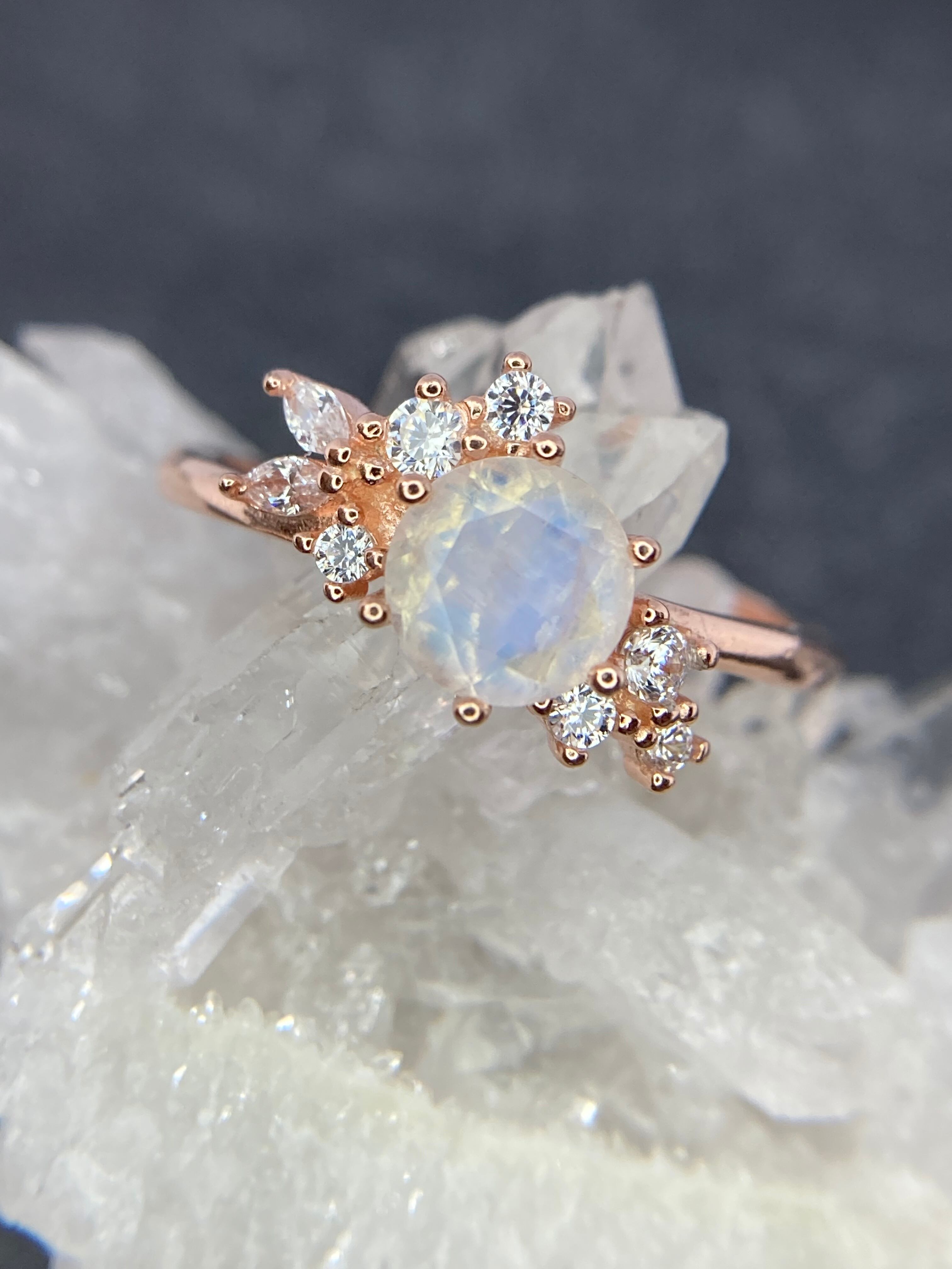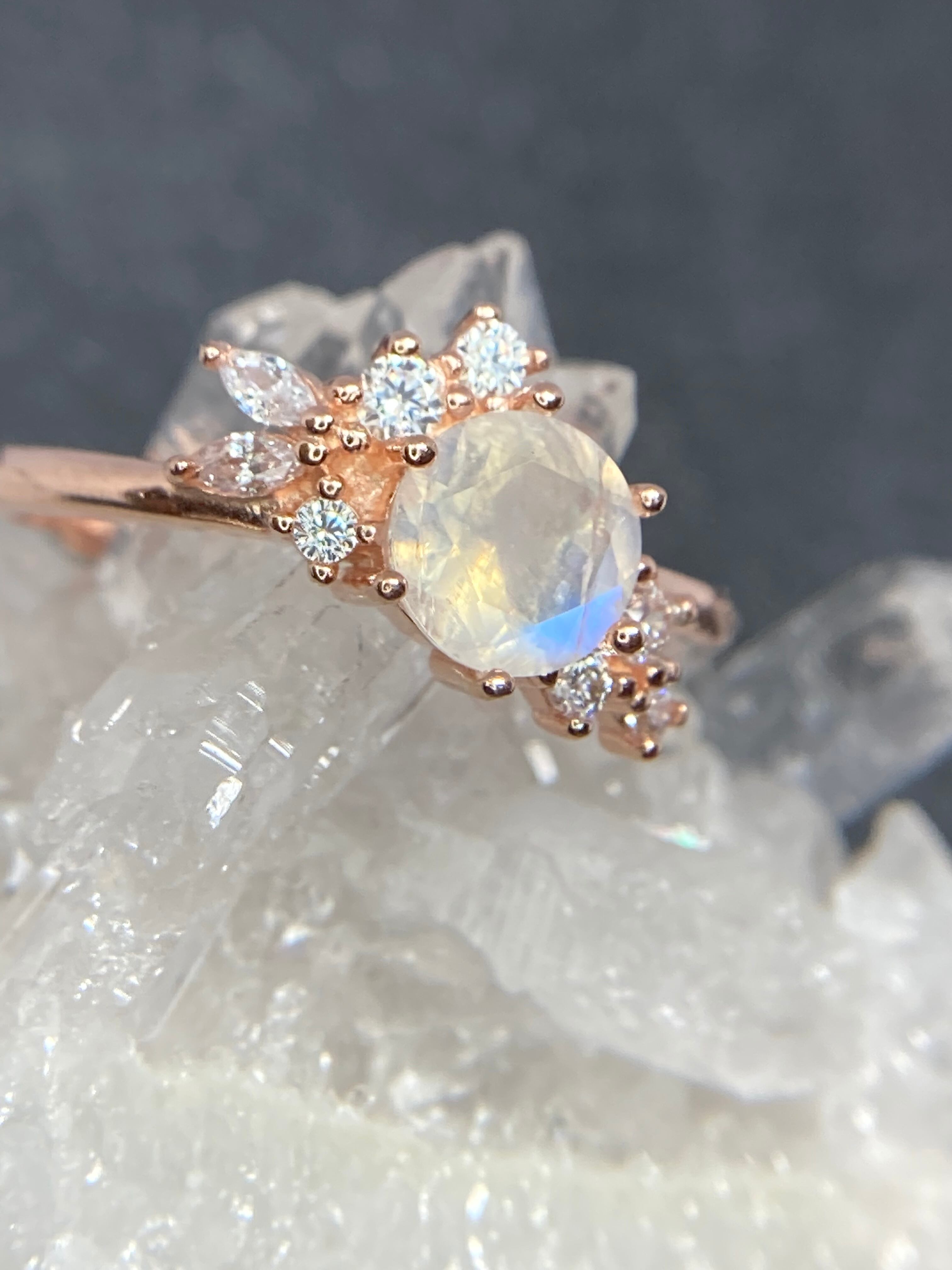 美しく包まれた花束のように並んだ小さなジルコニアたちが、トップのおおきなムーンストーンをさらに輝かせる繊細なリングです。