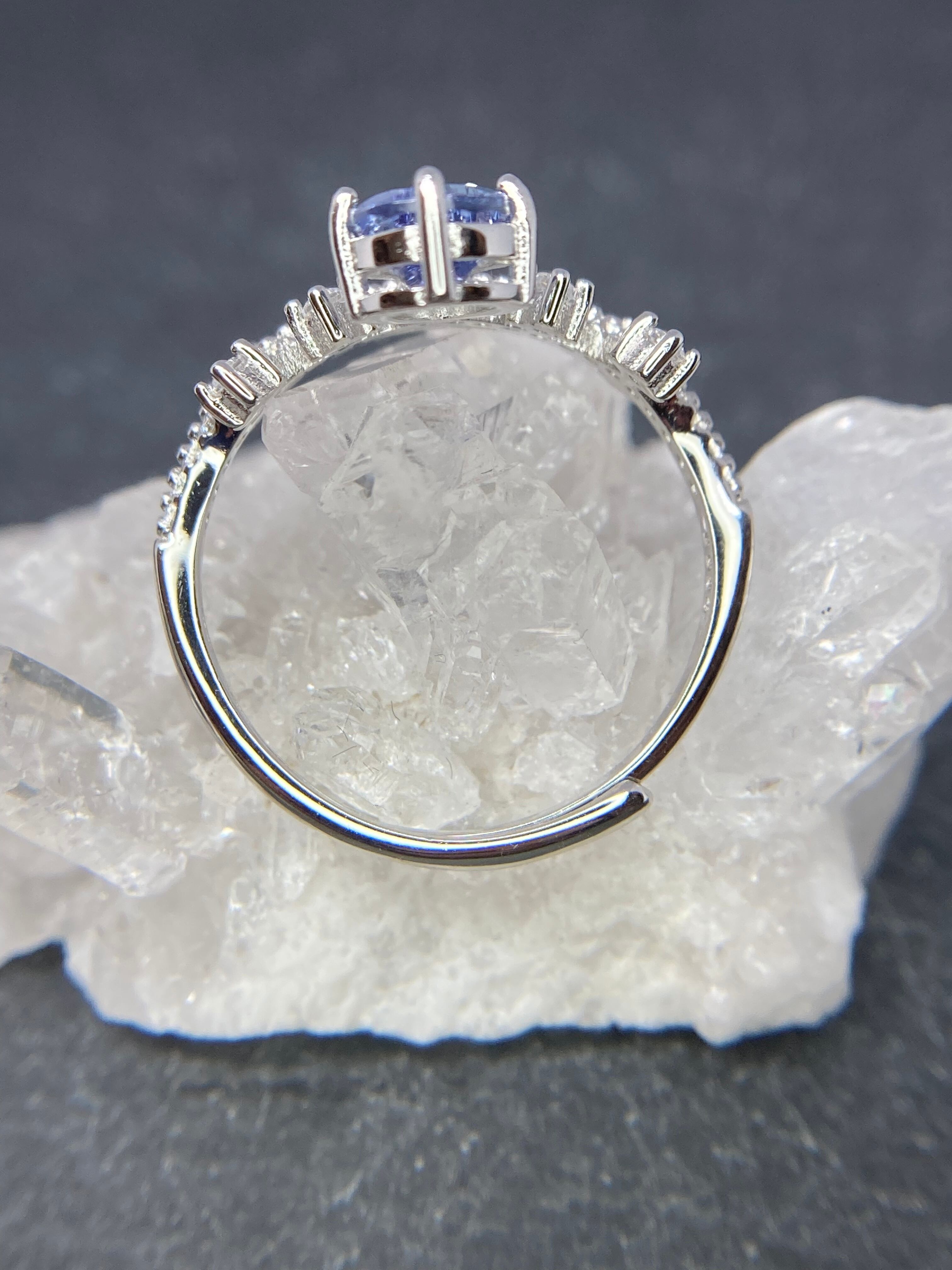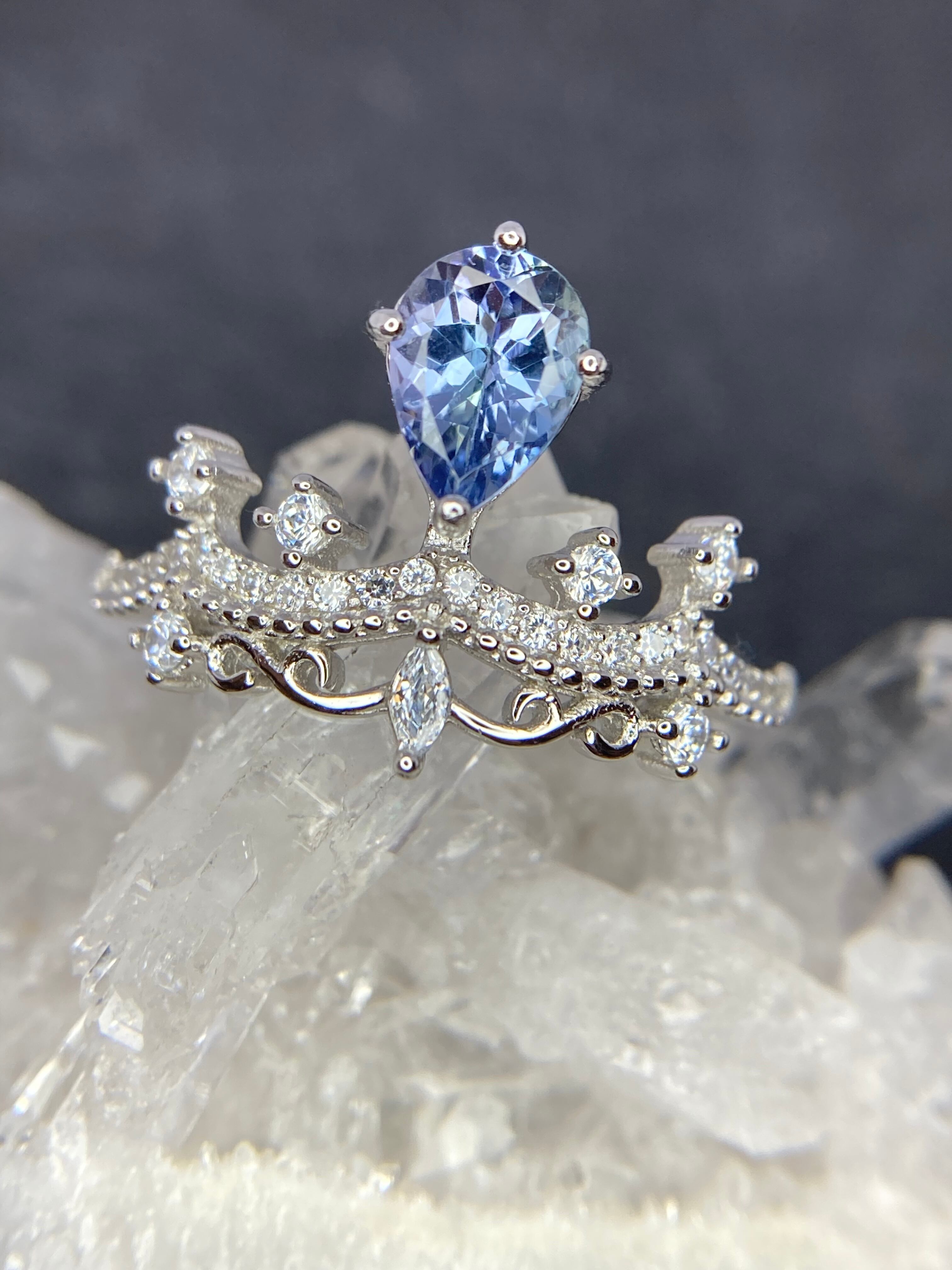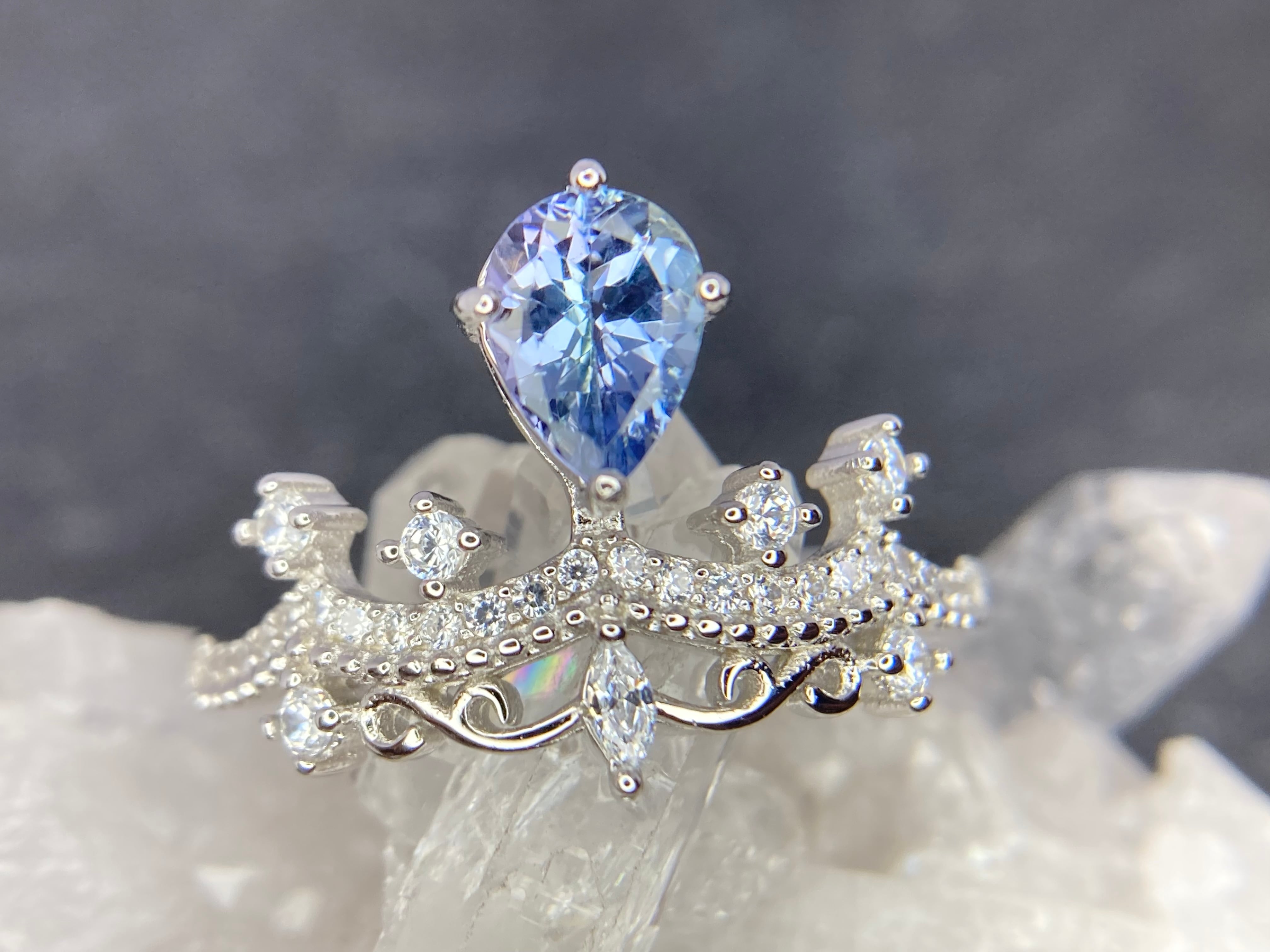 まるでシャンデリアのように美しいデザインのトップからブルーゾイサイトが零れ落ちんばかりに輝いているゴージャスなリングです。