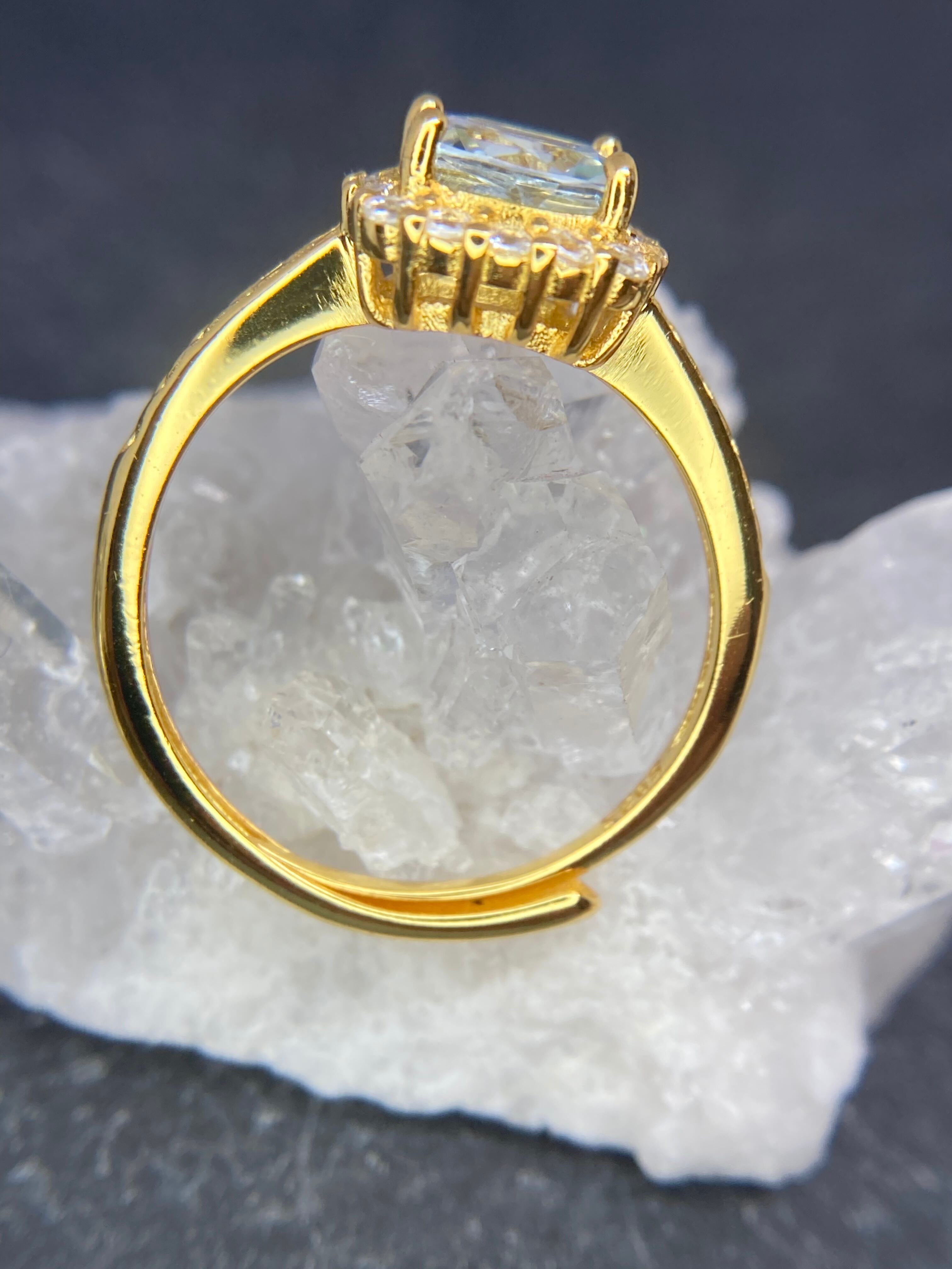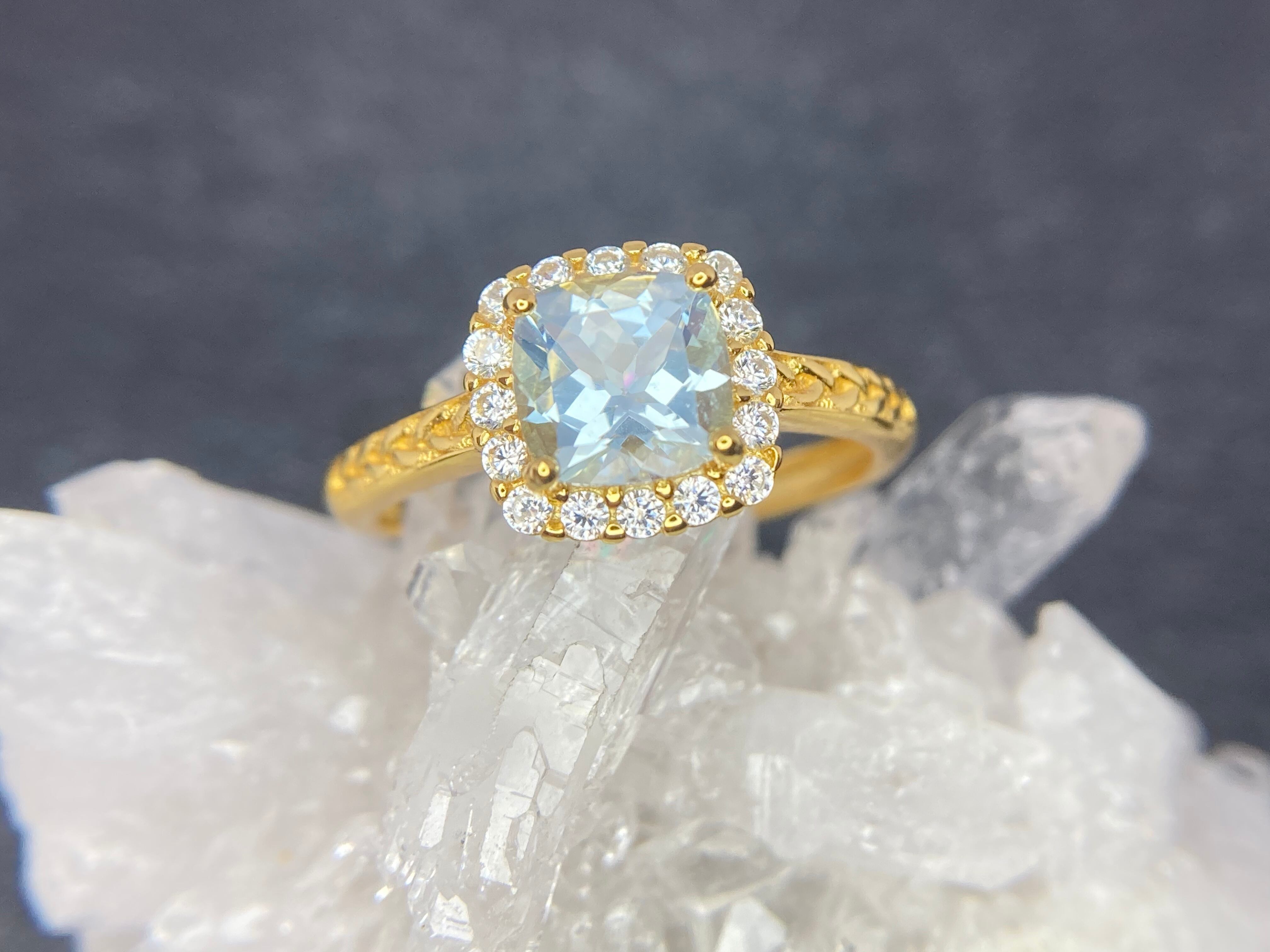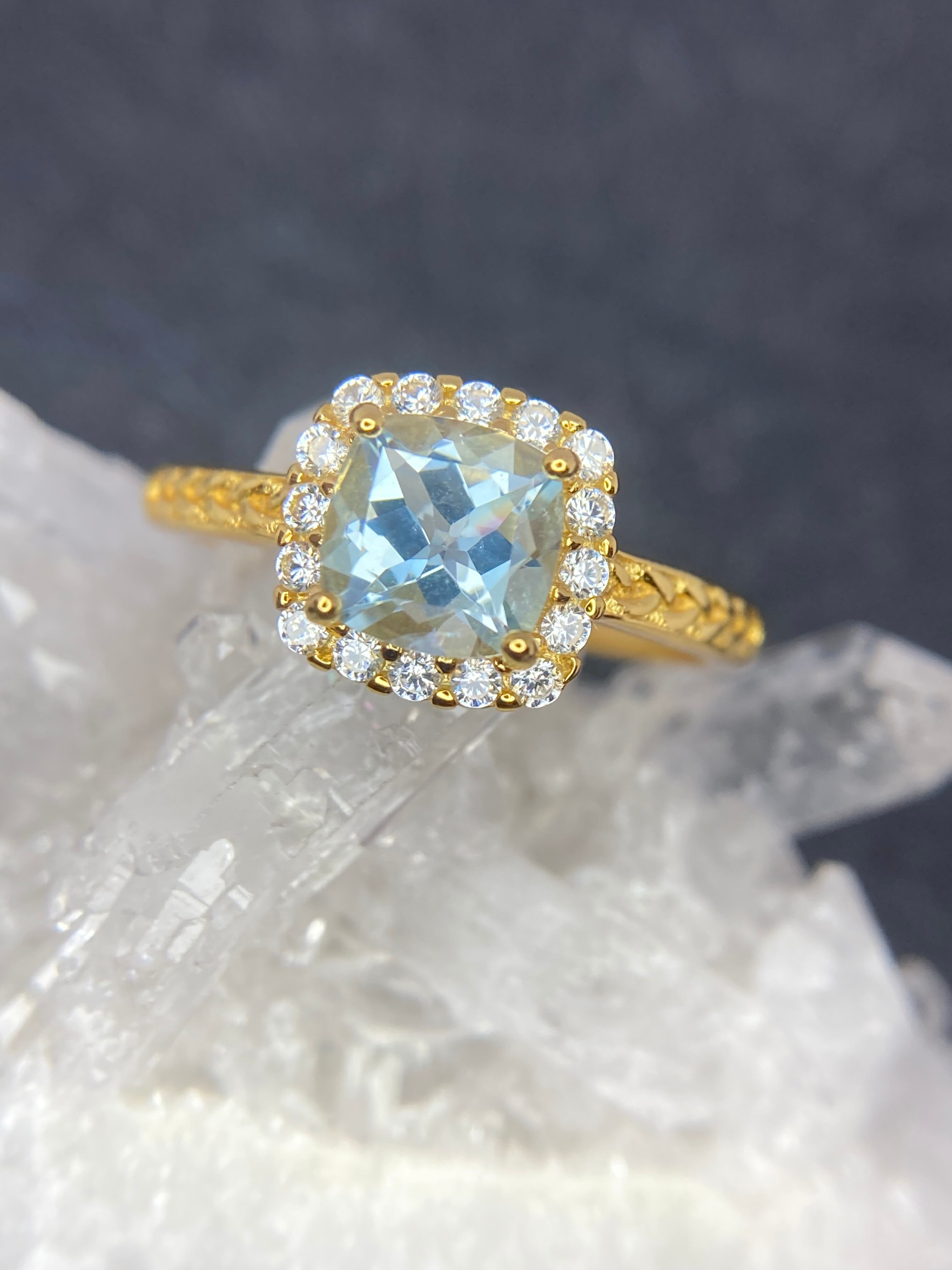 取り巻きのジルコニアたちがキラキラと輝き、アクアマリンのふんわりとしたブルーを美しく引き立てます。