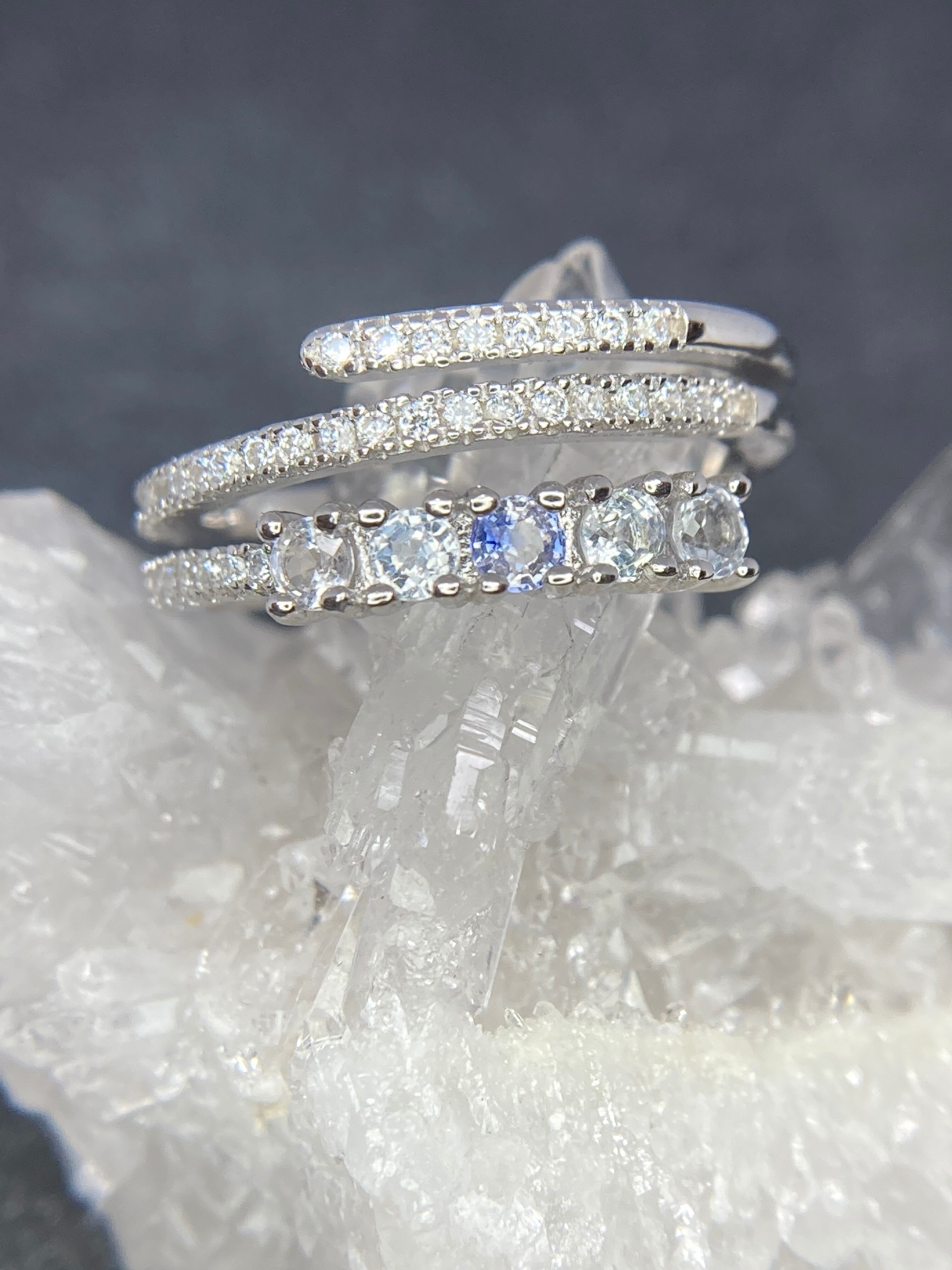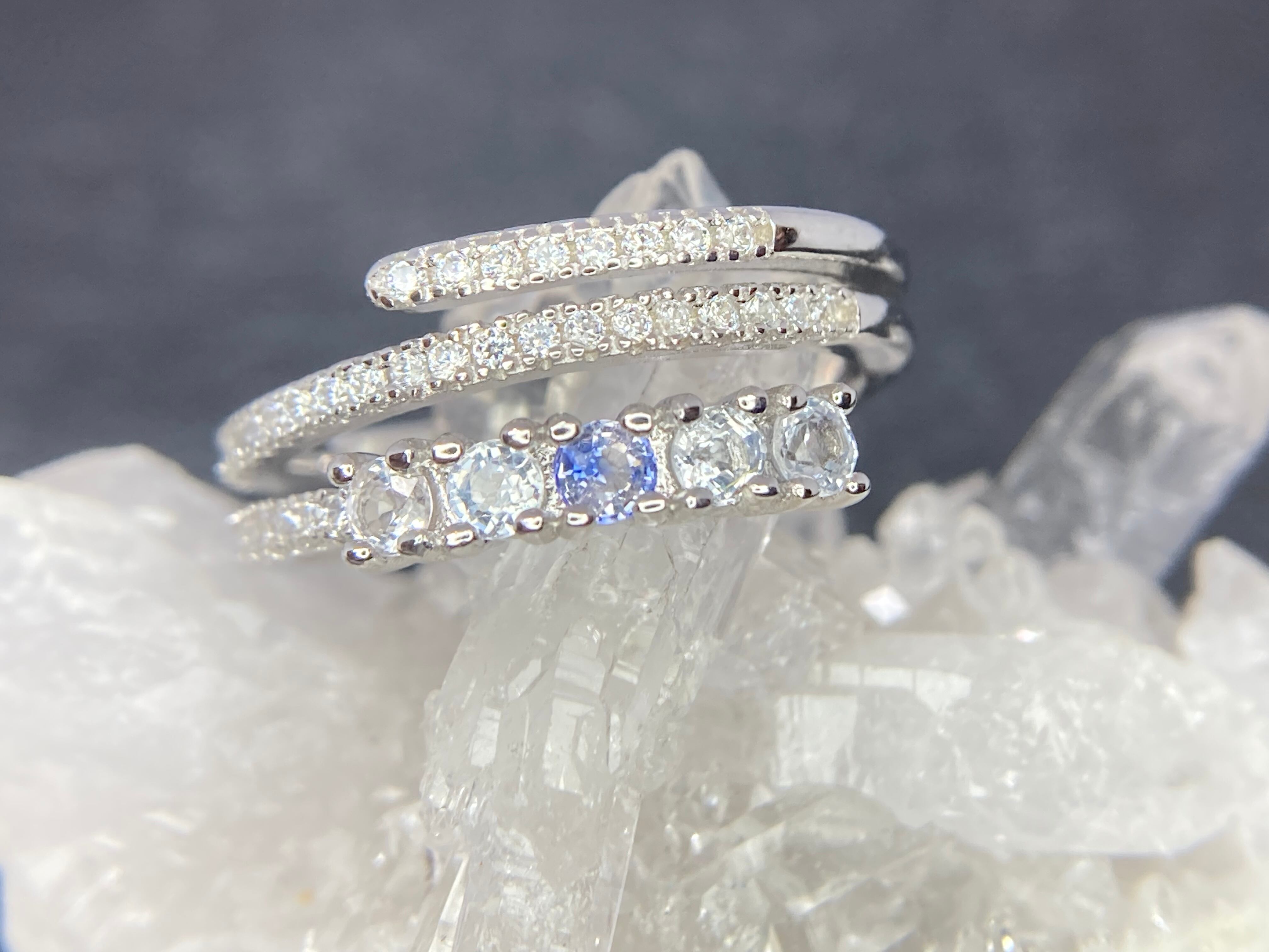 ぐるりと指を護るように重なったデザインのアームに、美しいサファイアが並んだ華奢ながらにインパクトのあるリングです。