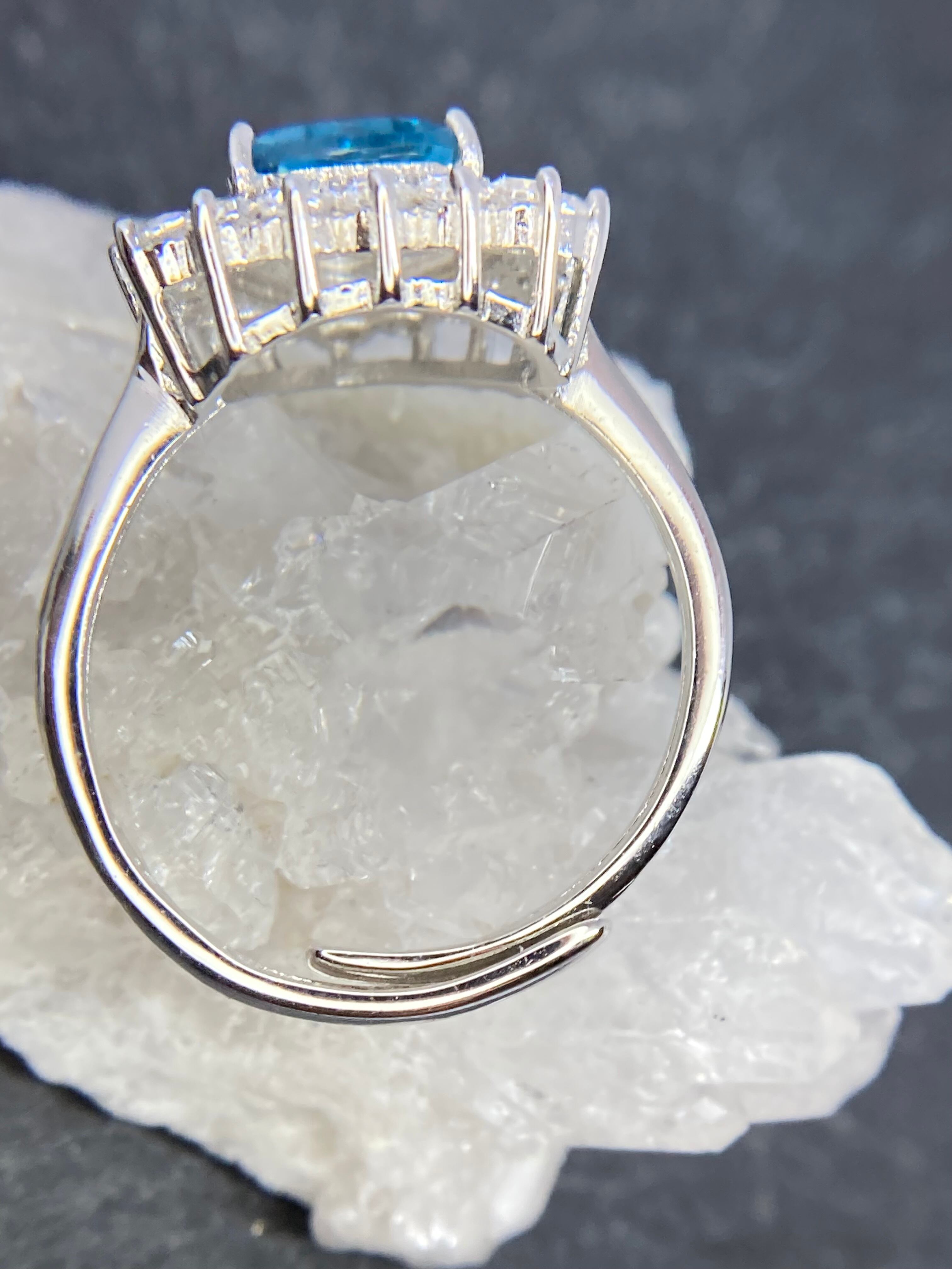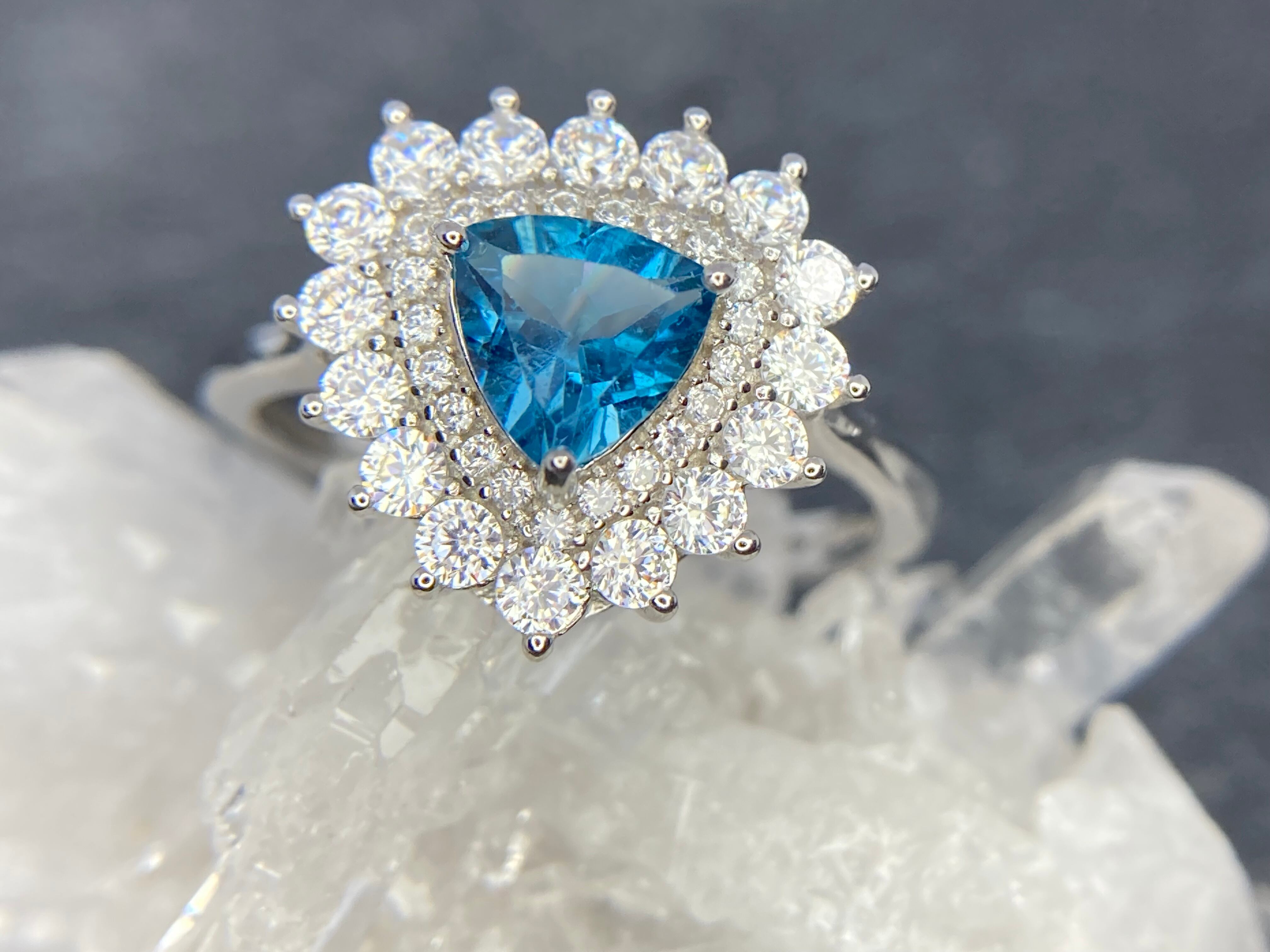 煌びやかに散るジルコニアの中央に佇む、鮮やかな青が美しいブルートパーズのリングです。