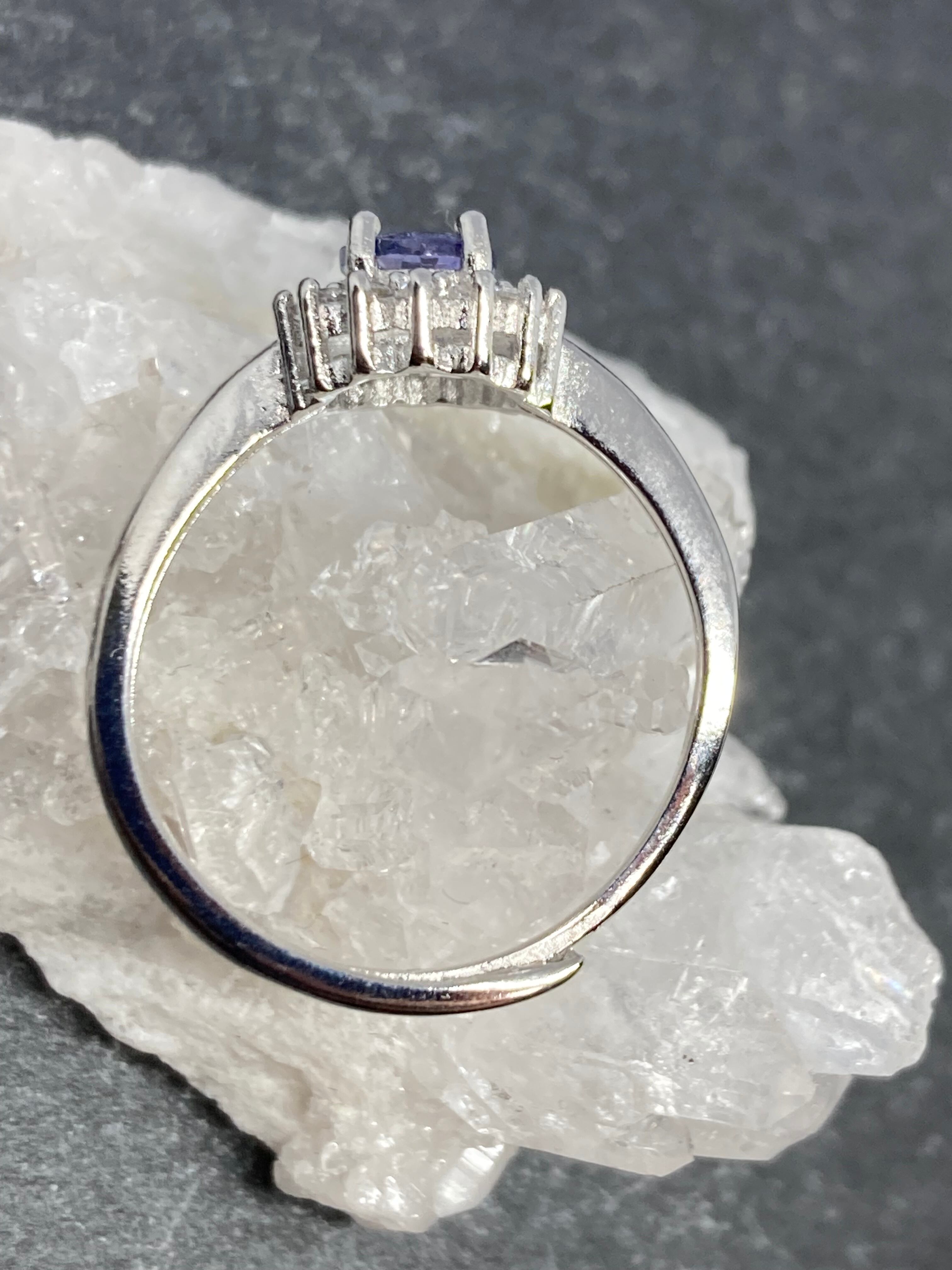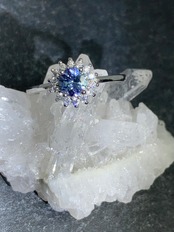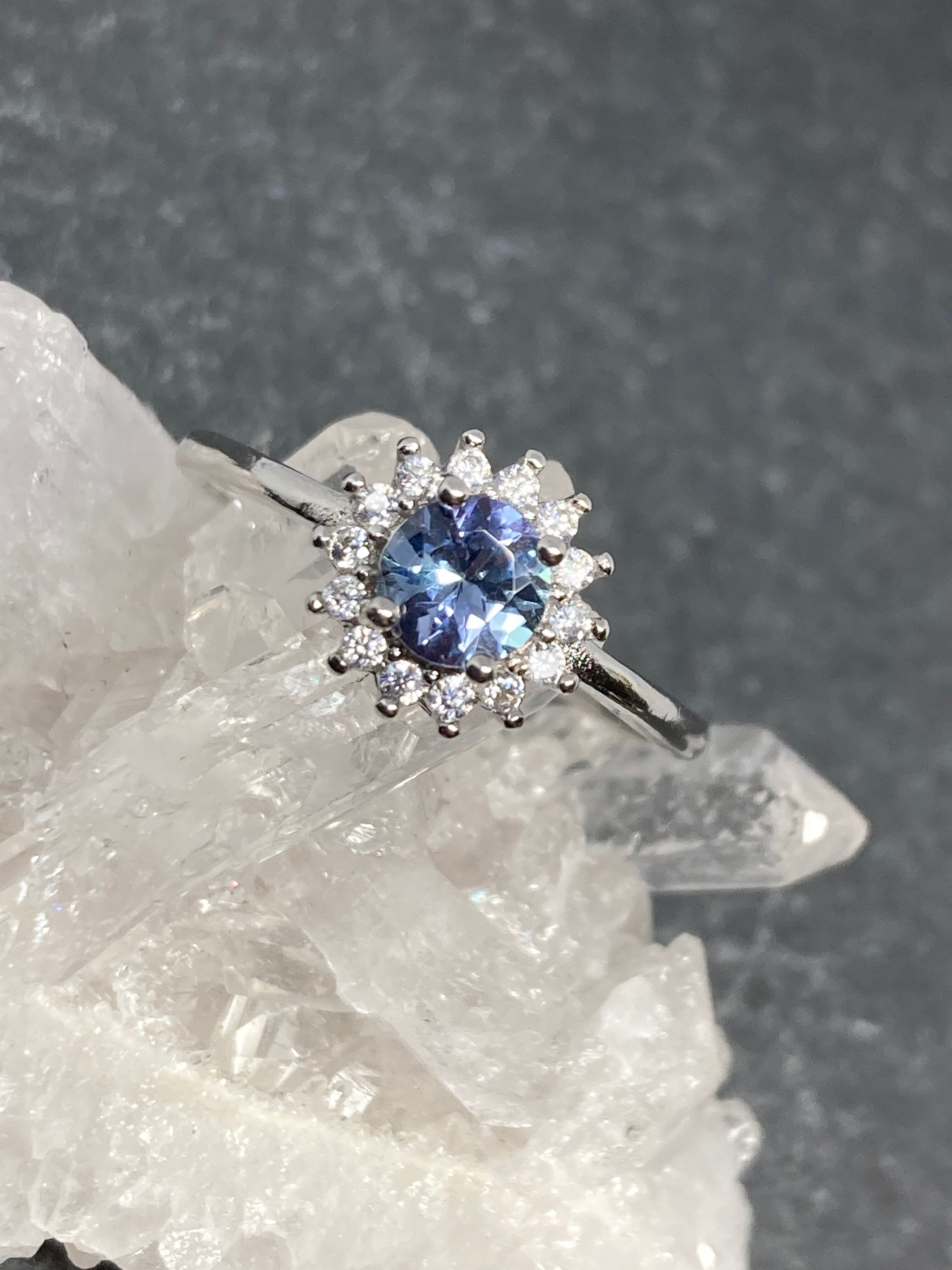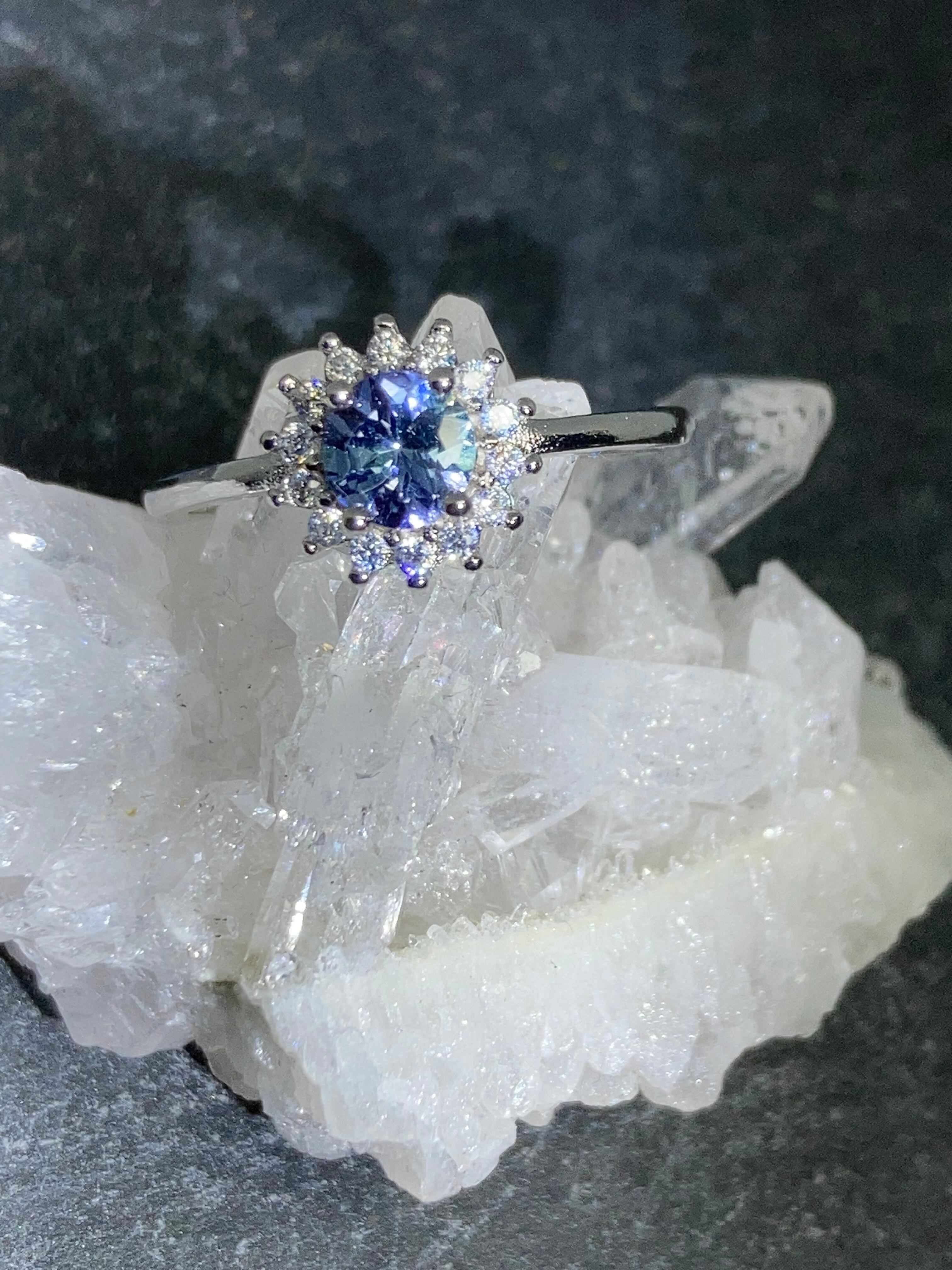 太陽の放射光のように並んだジルコニアたちの中央に、5mmUPのバイカラーゾイサイトを添えました。
