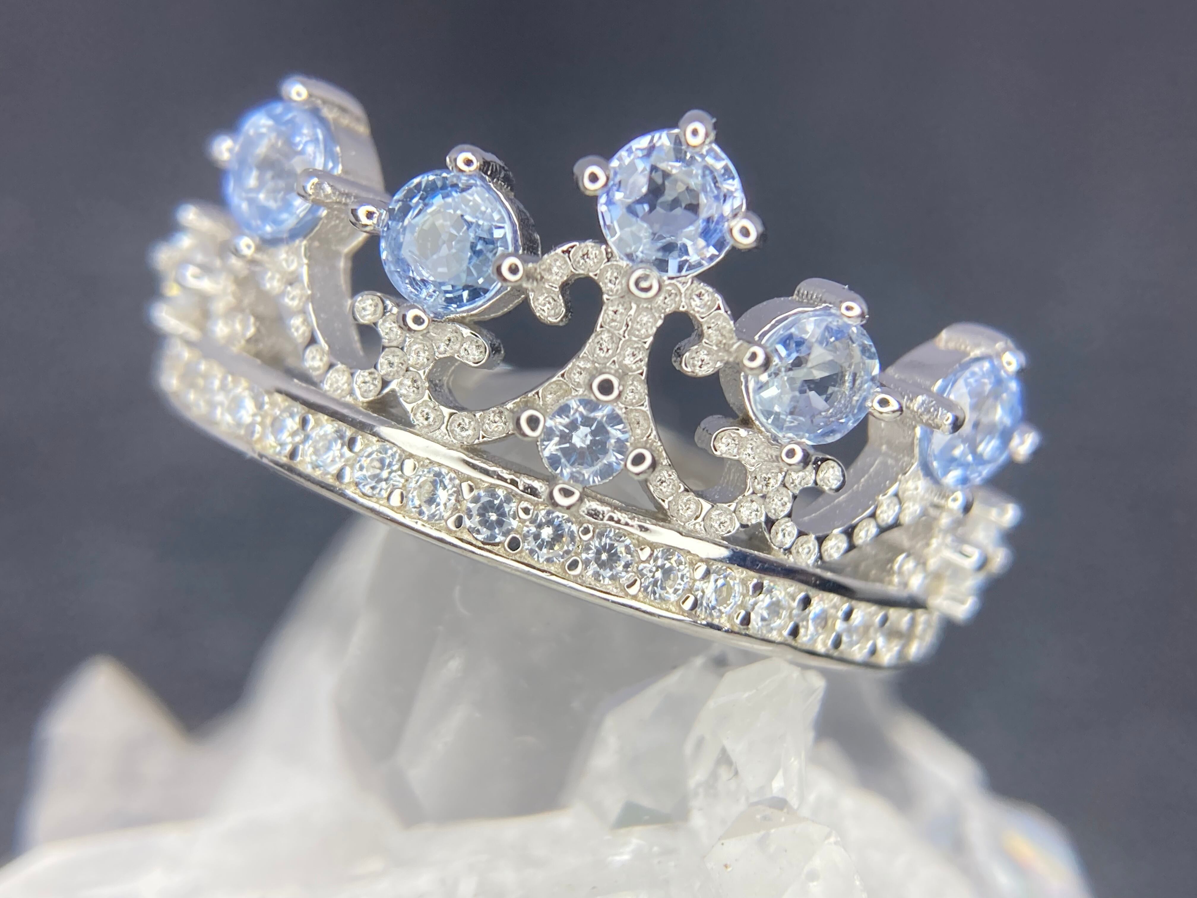 王冠のトップに立つサファイアはクリアな色味を放ち、どの角度から見てもサファイアの輝きをお楽しみいただけます。