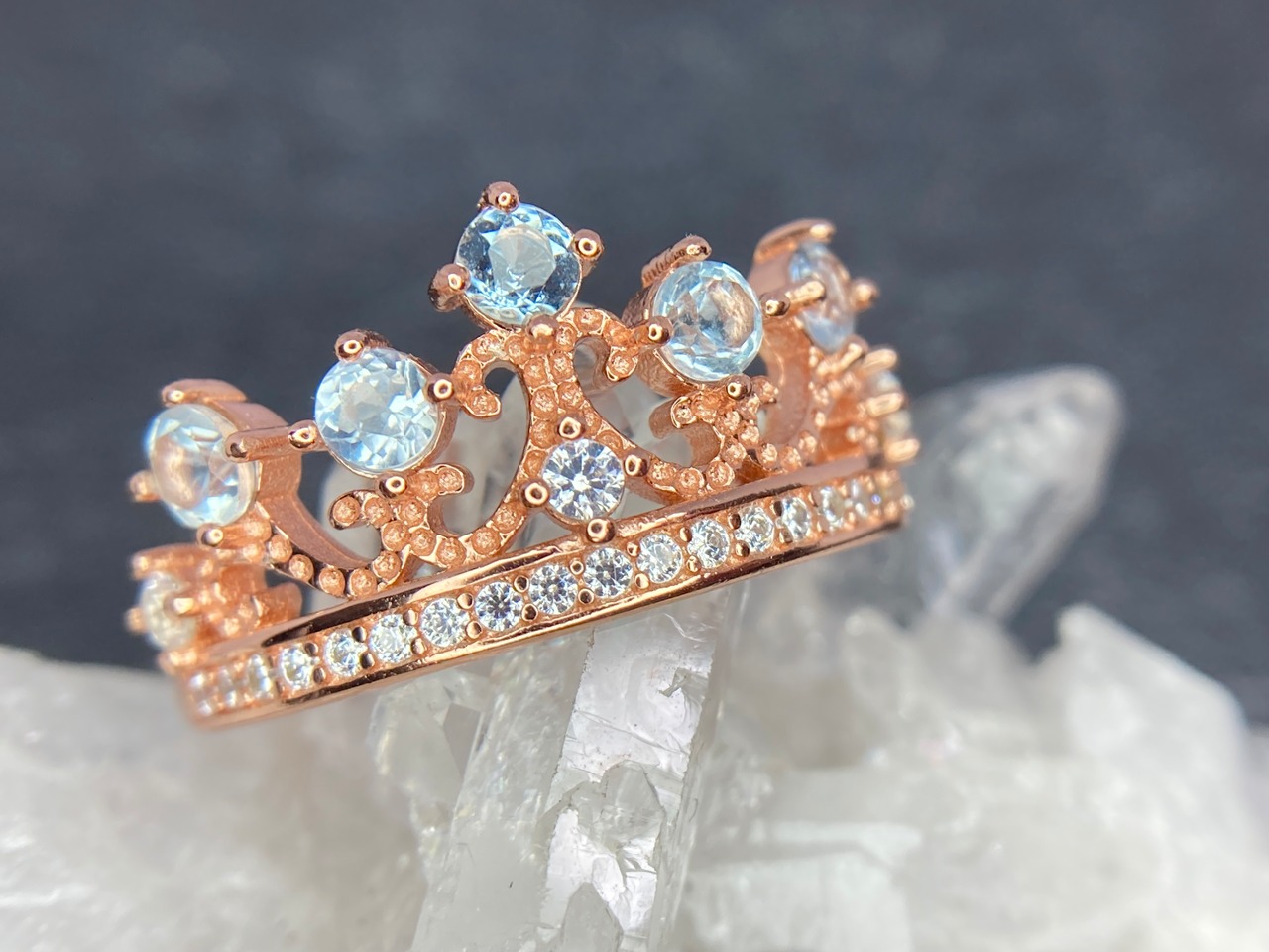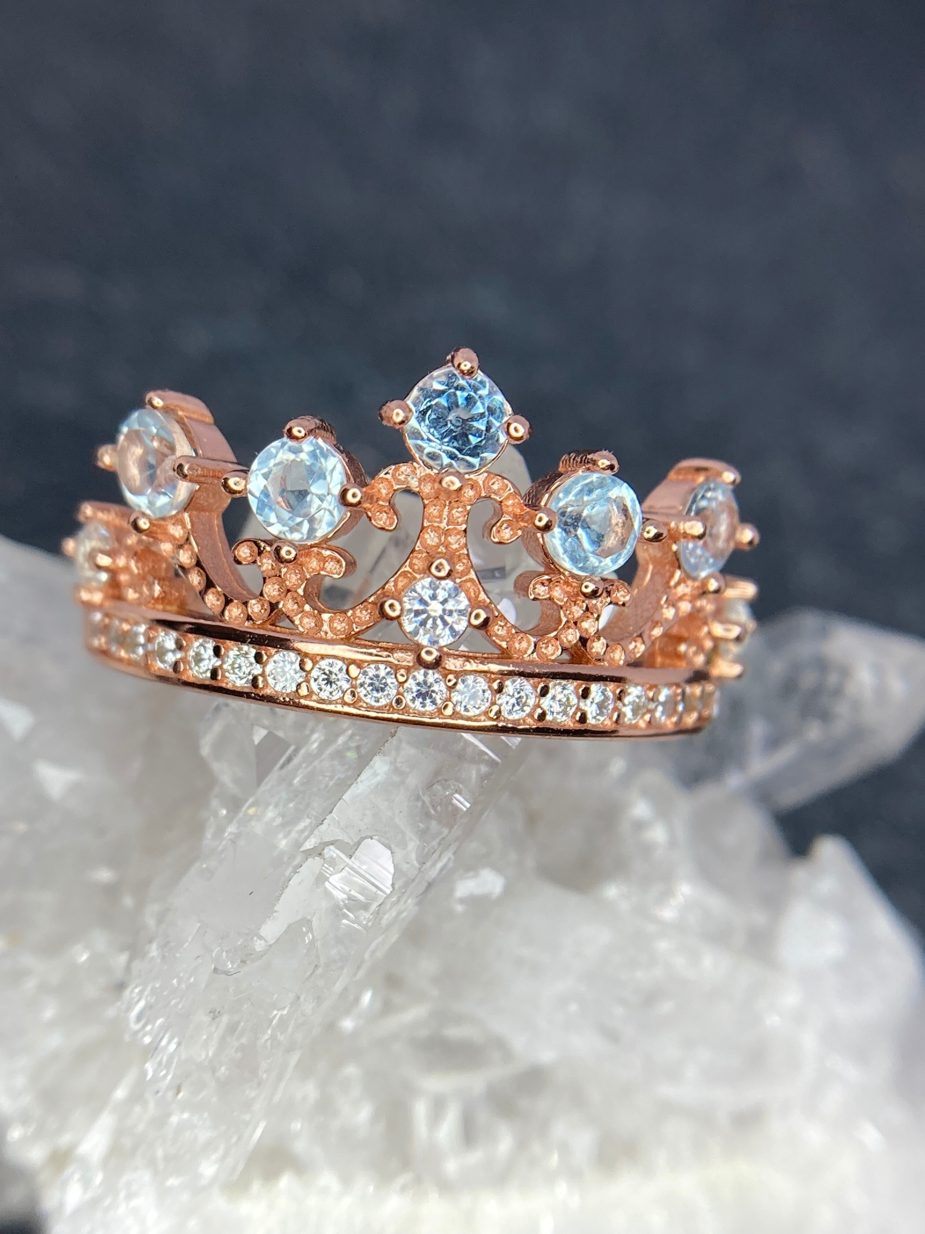 王冠のトップに立つブルートパーズはクリアな色味を放ち、どの角度から見ても輝きをお楽しみいただけます。