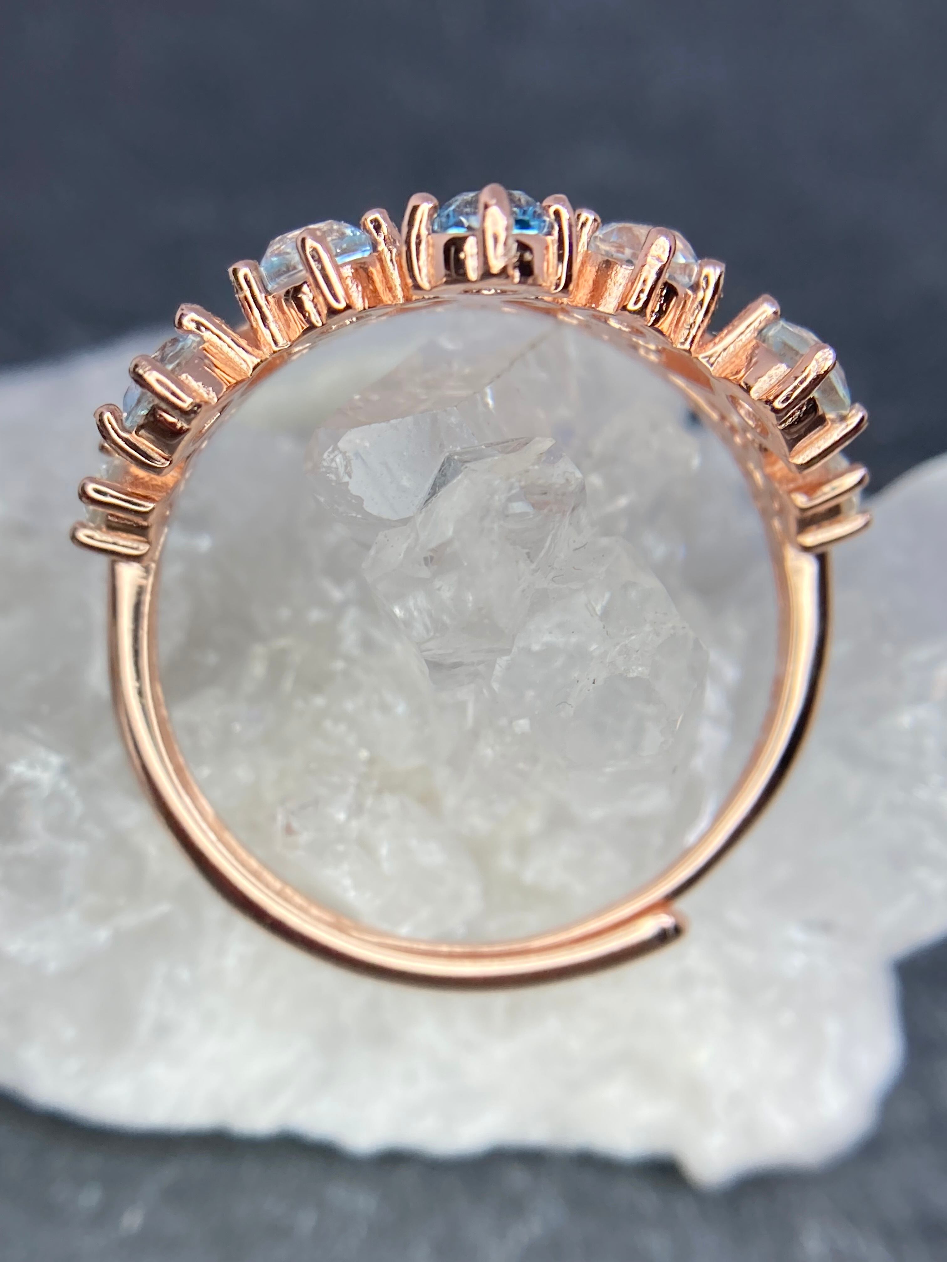 美しいブルートパーズが並び、太陽の光を受けることでより強く輝くゴージャスなリングです。