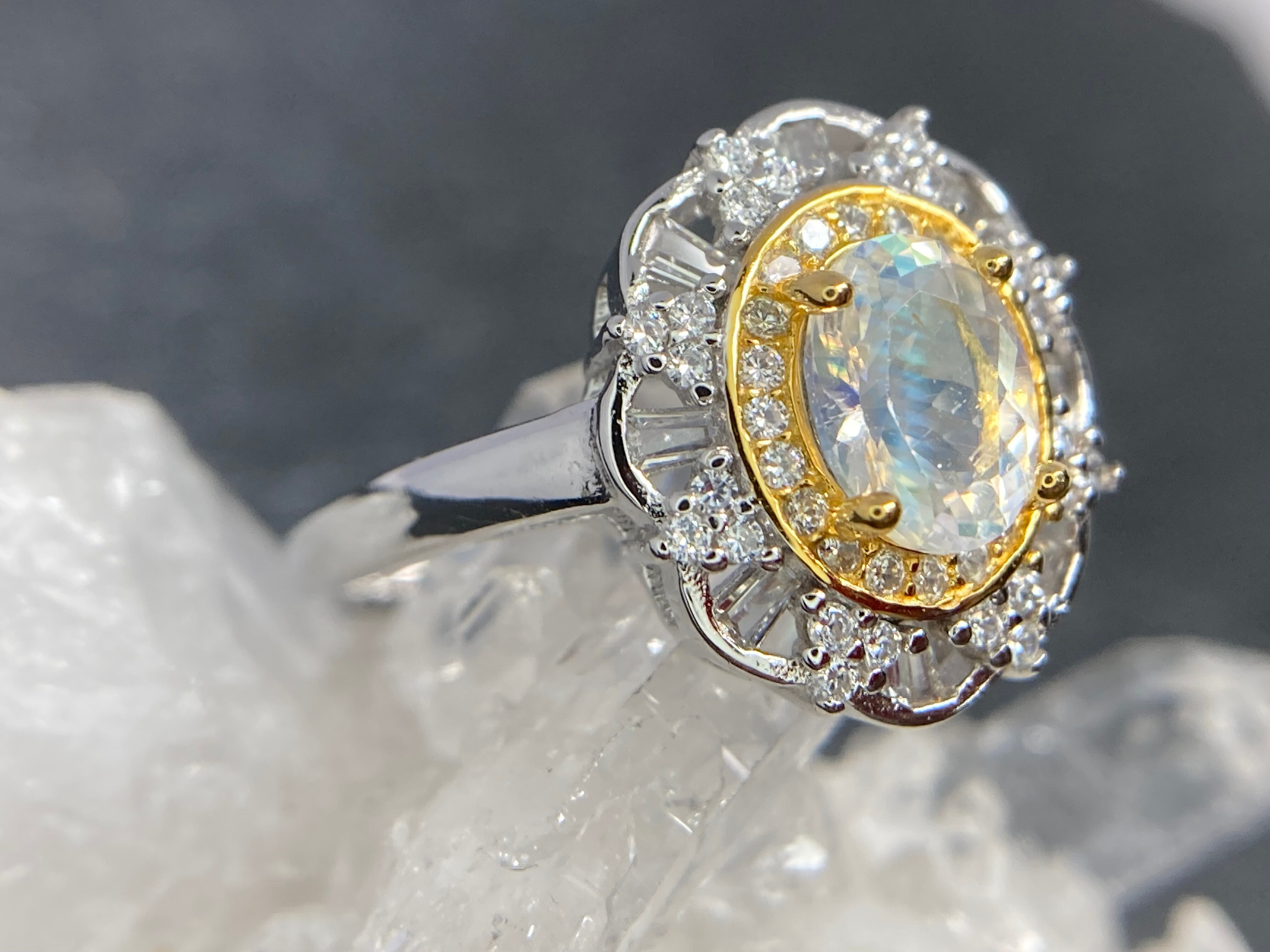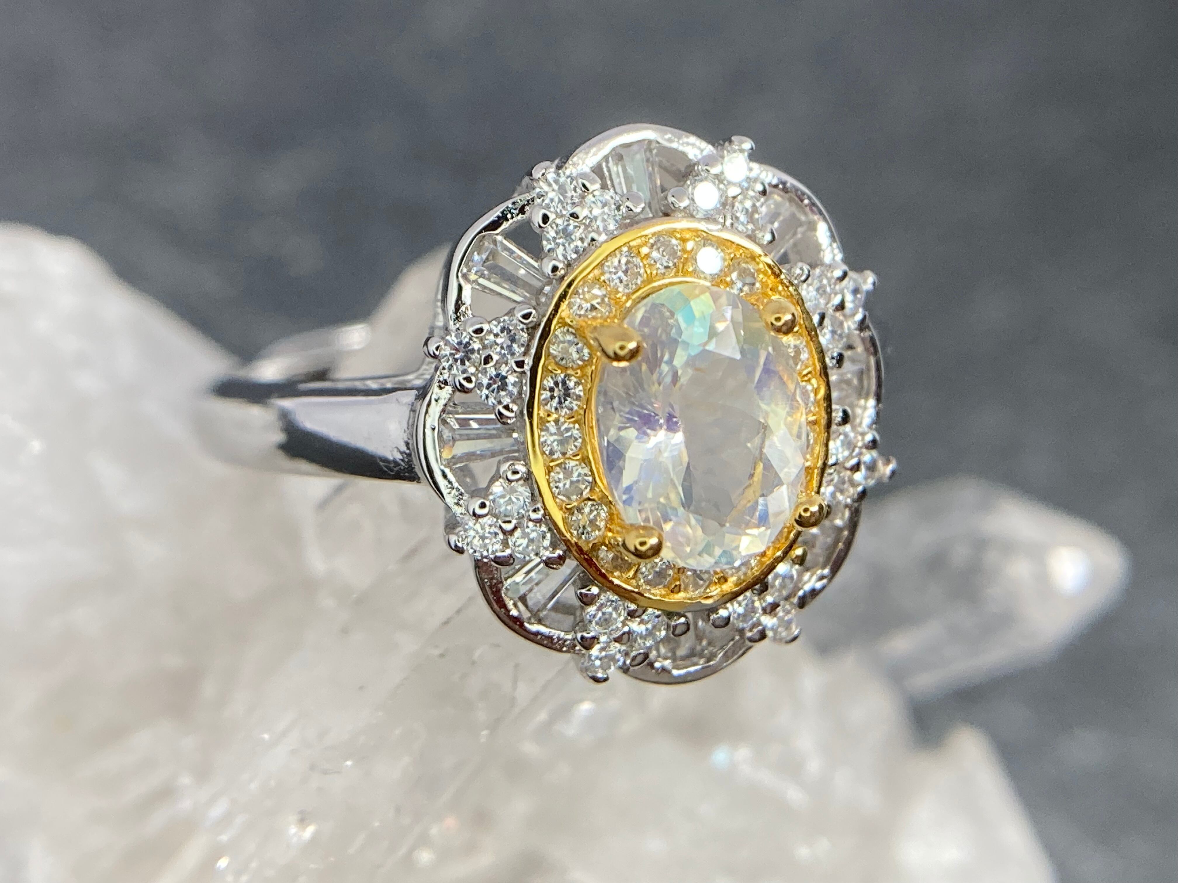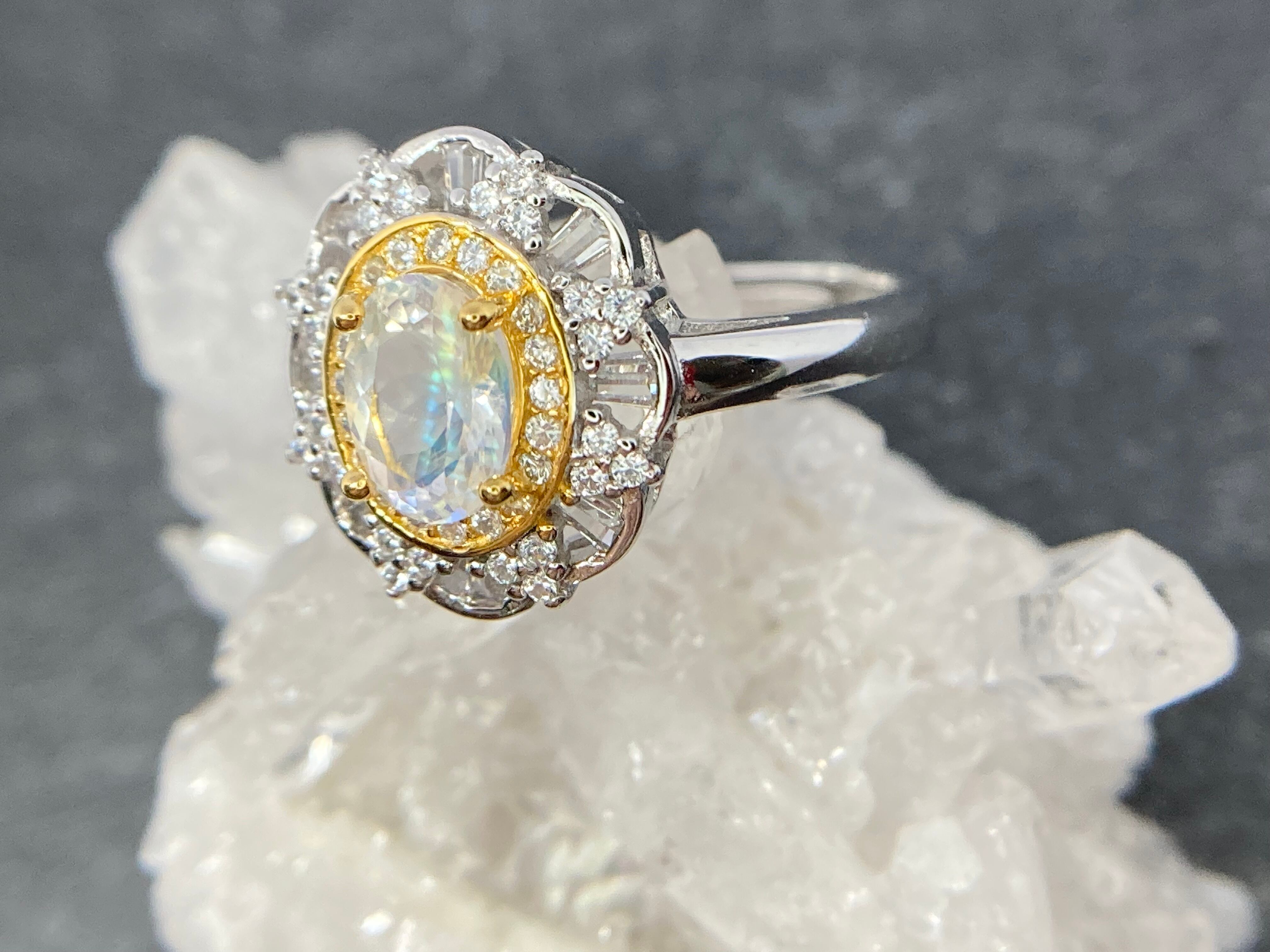 透明なベースの中、斜めにシラーの入る美しい虹を閉じ込めた素晴らしいカットのムーンストーンが指を動かすたびにきらきらと煌めきます。