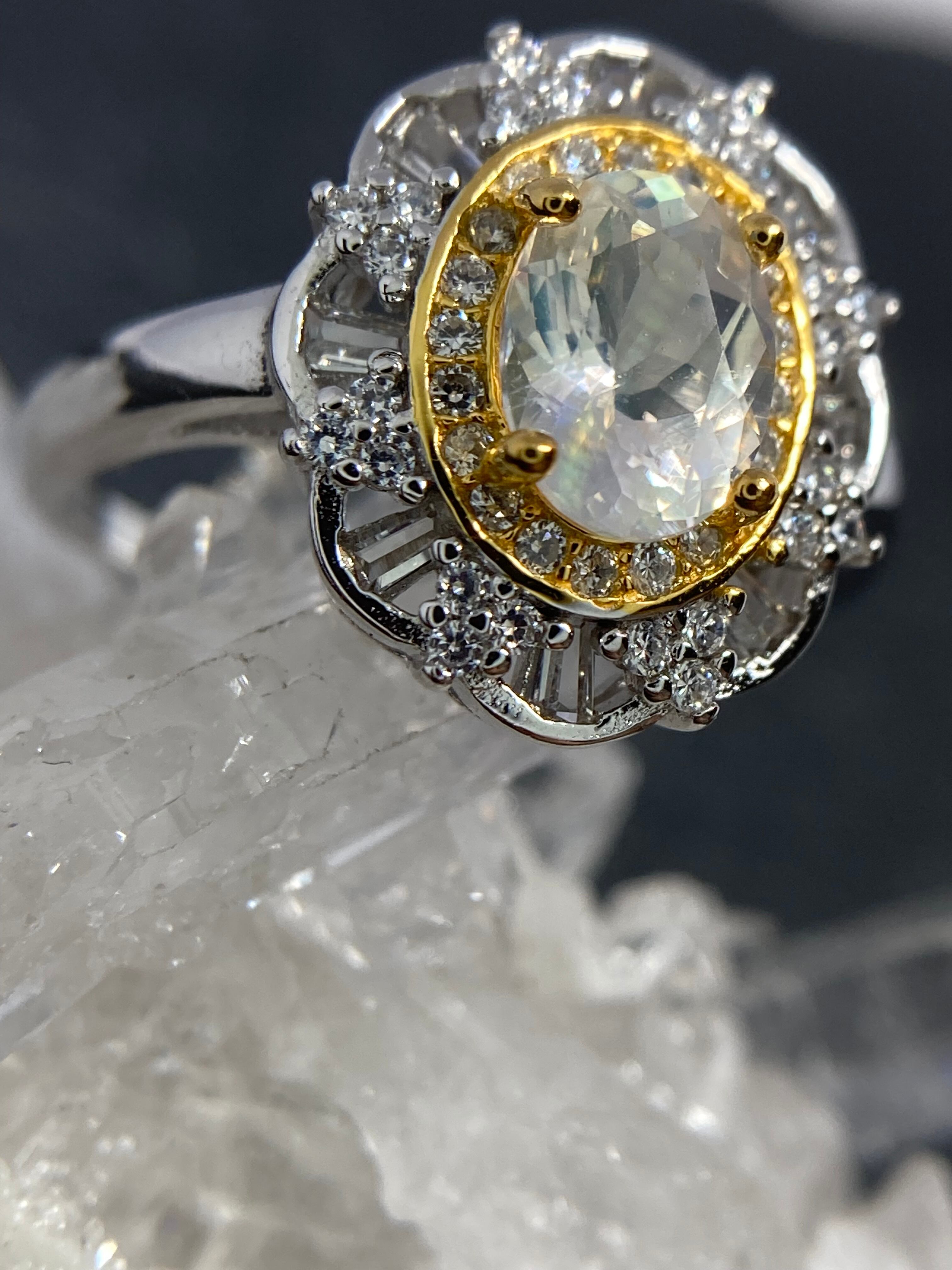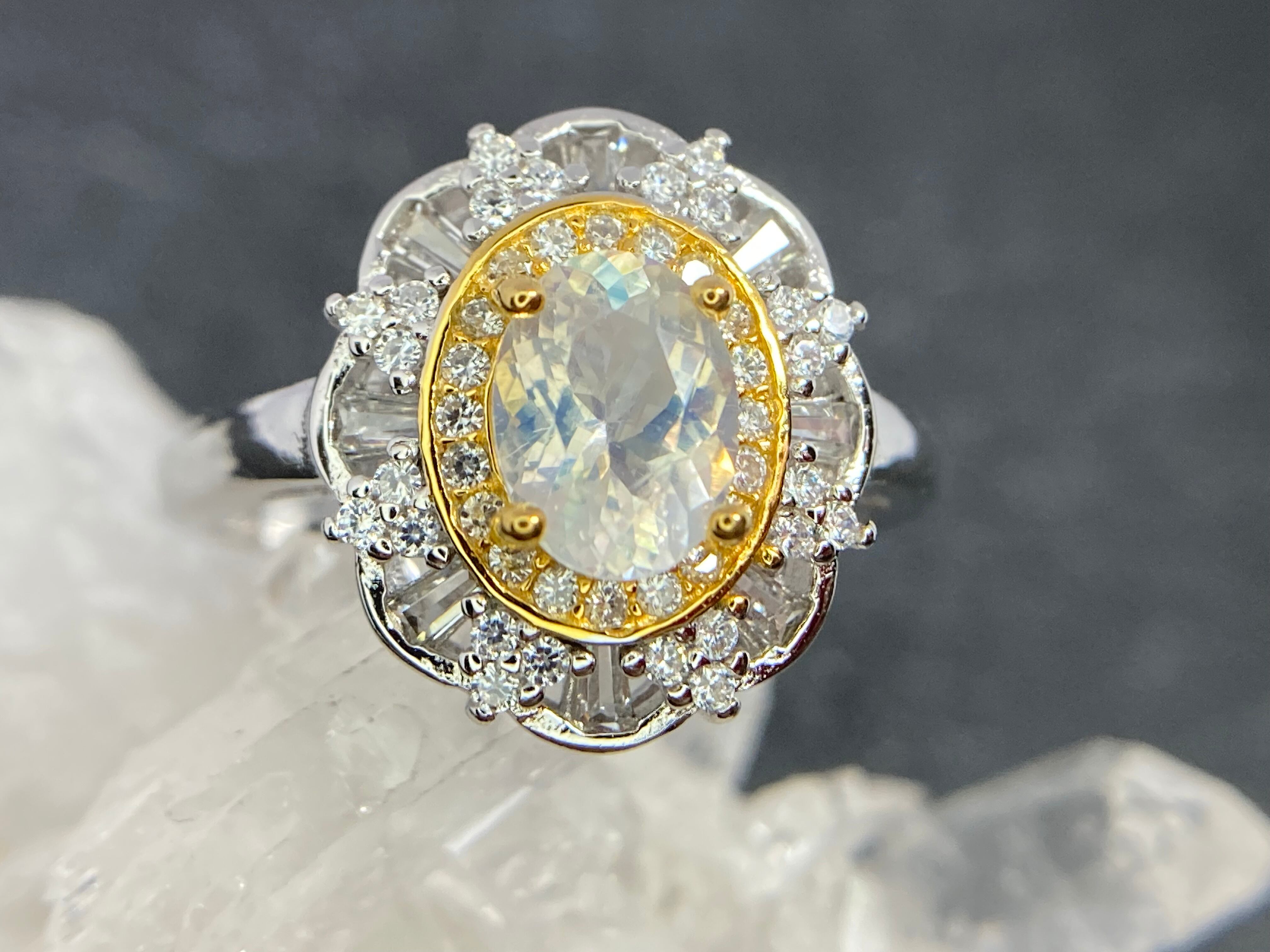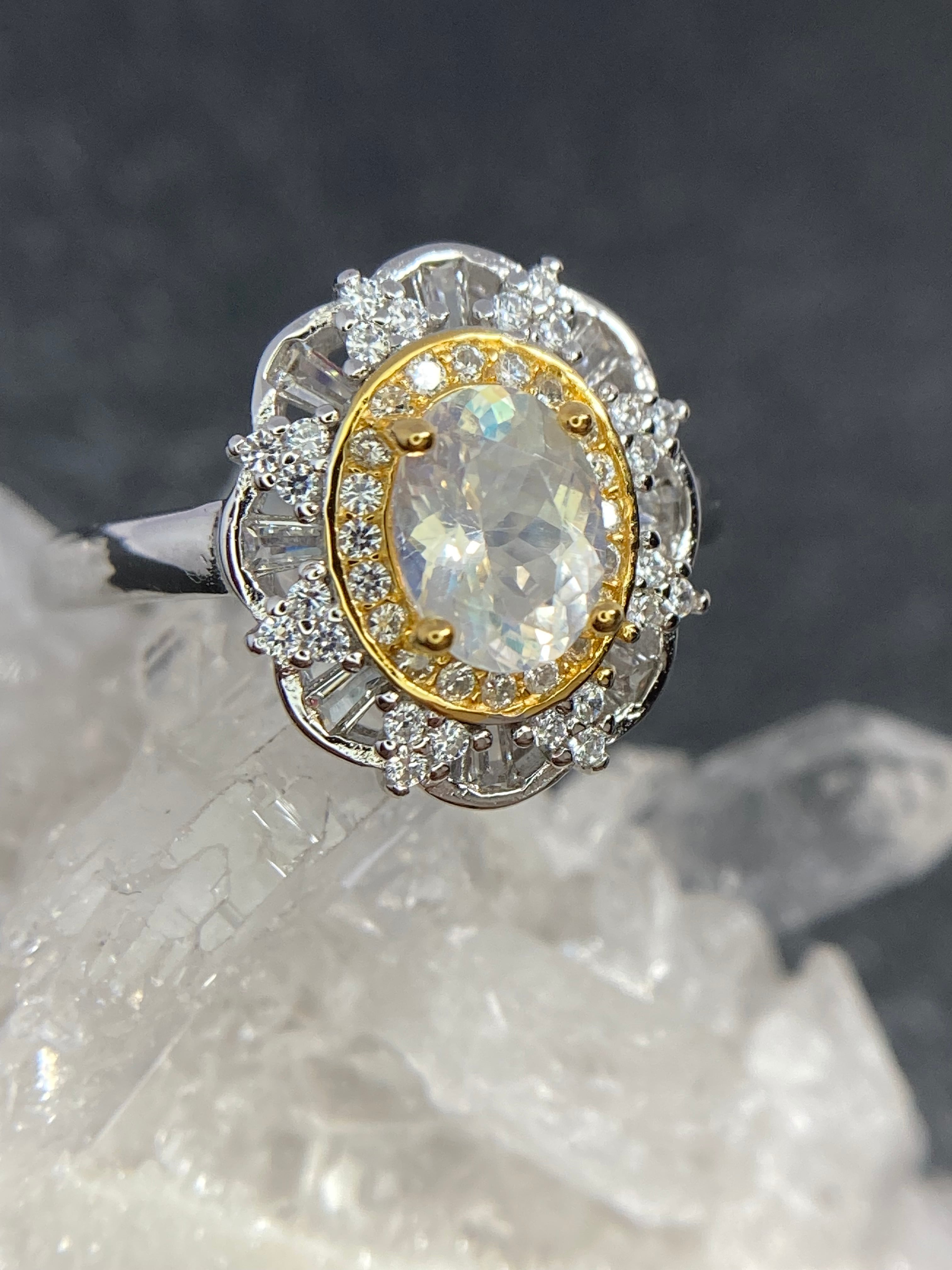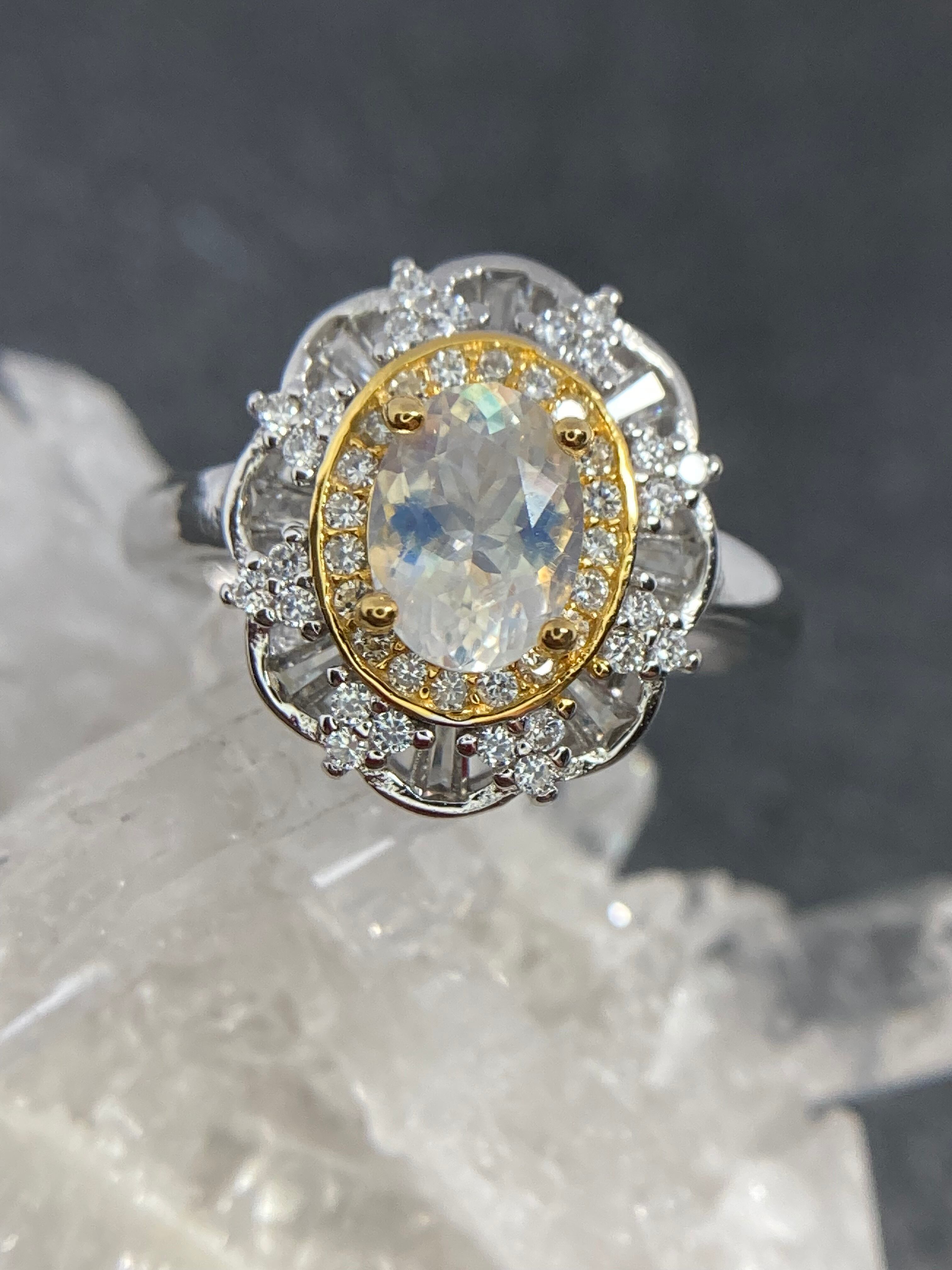 透明なベースの中、斜めにシラーの入る美しい虹を閉じ込めた素晴らしいカットのムーンストーンが指を動かすたびにきらきらと煌めきます。