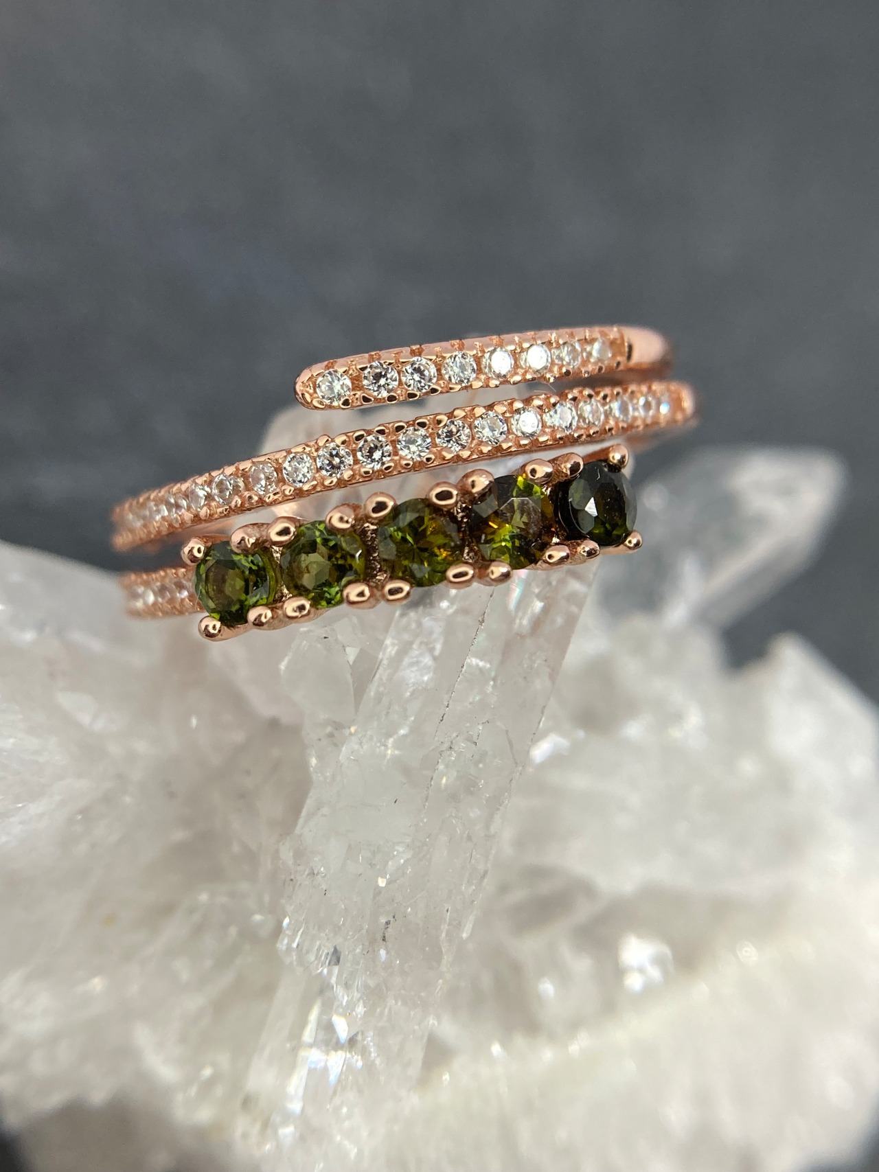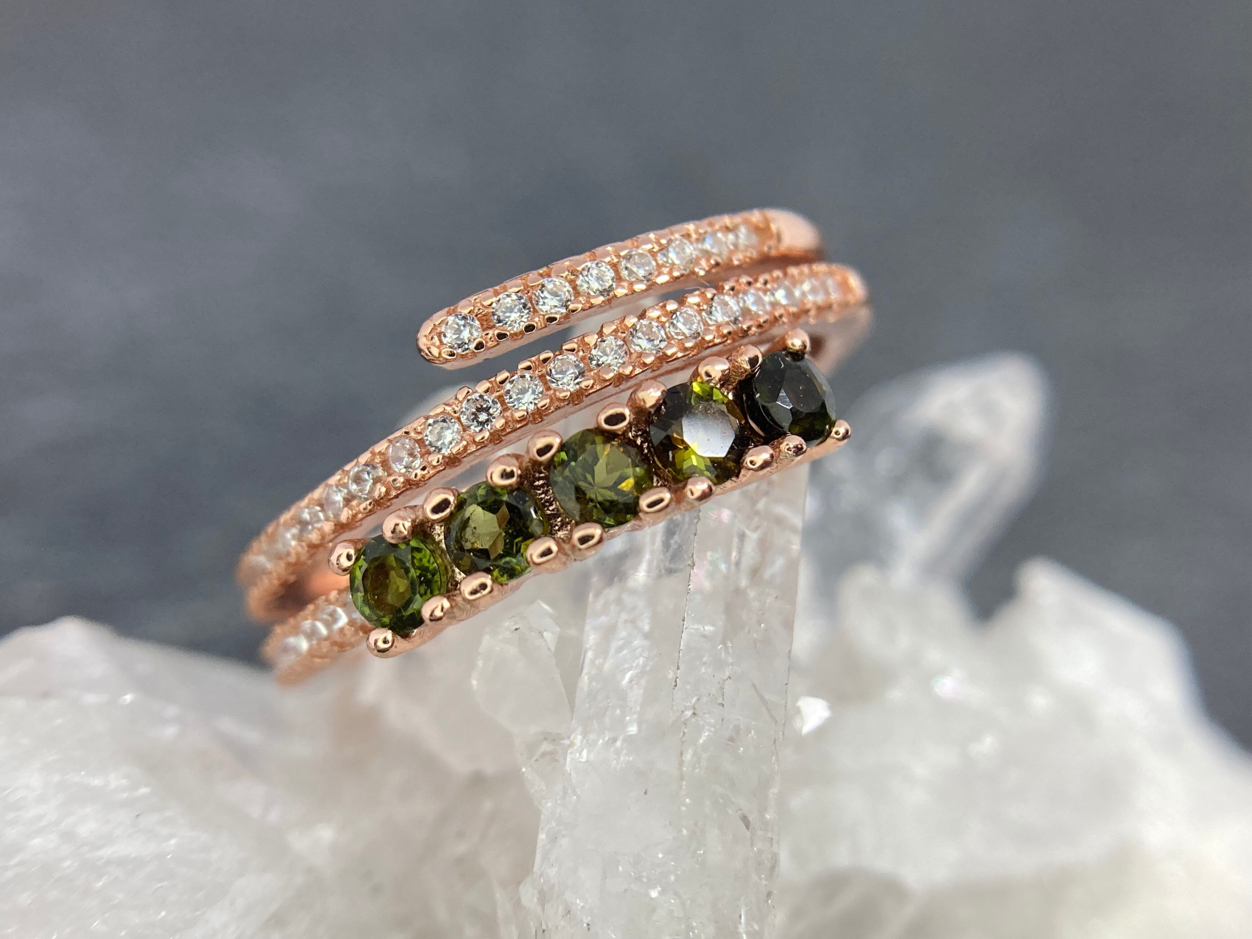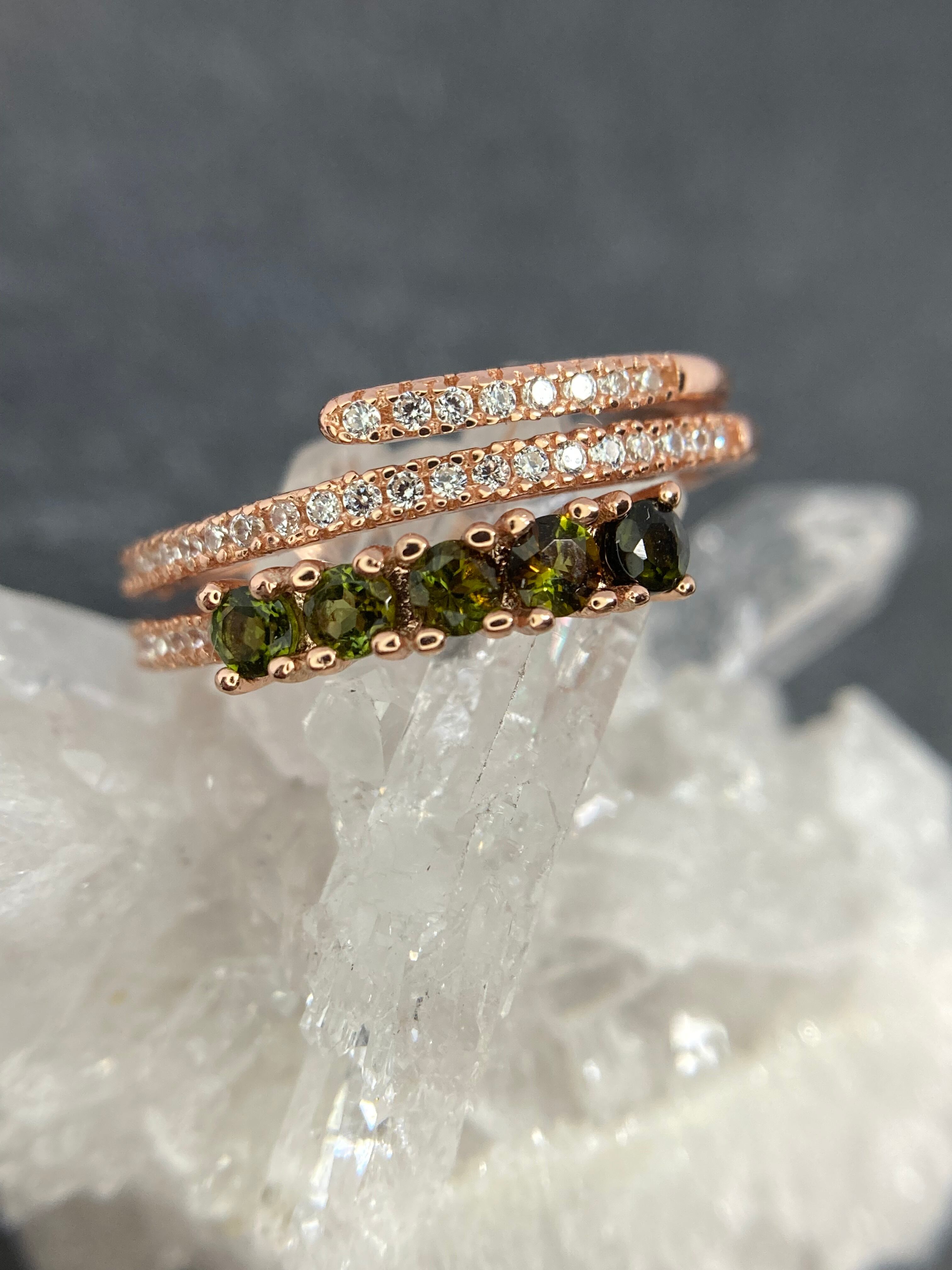 ぐるりと指を護るように重なったデザインのアームに、濃いグリーンのトルマリンが並んだ華奢ながらにインパクトのあるリングです。