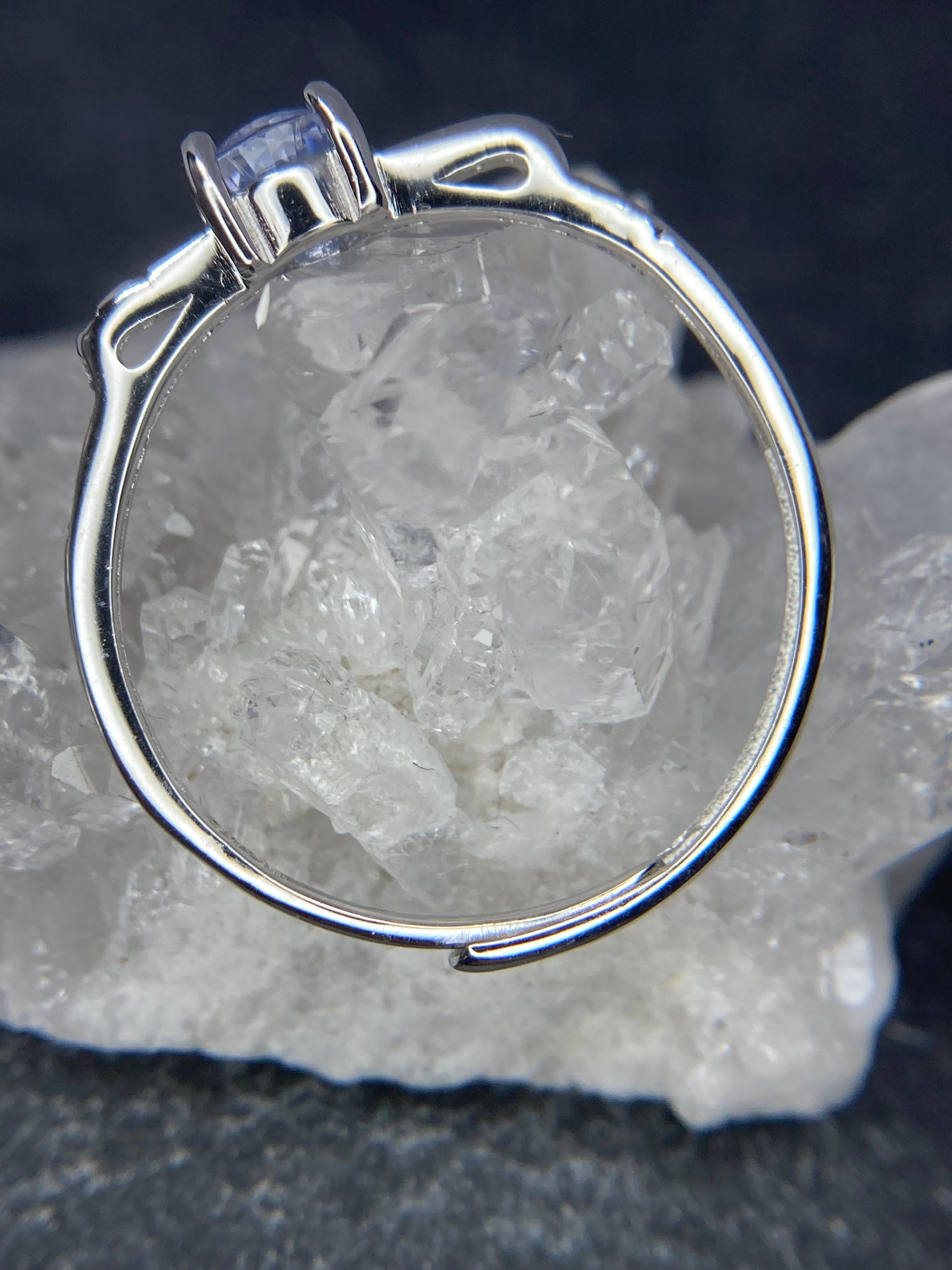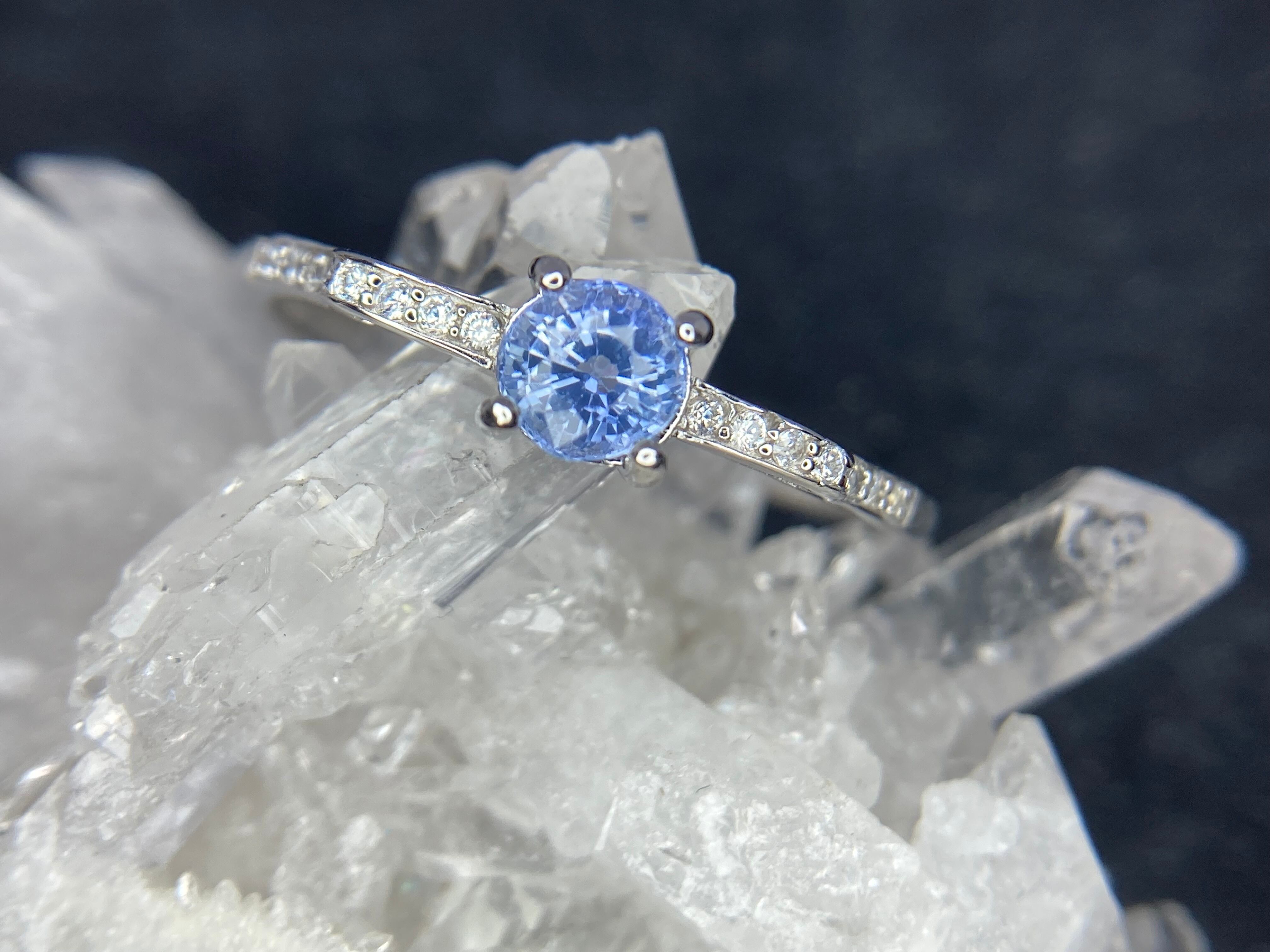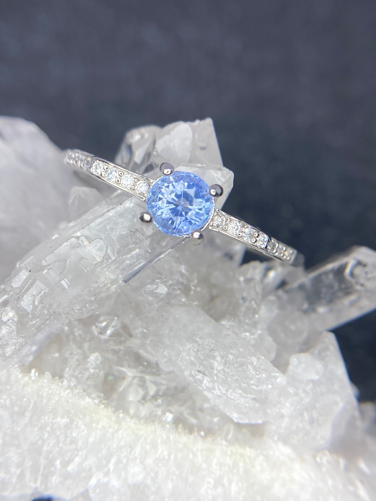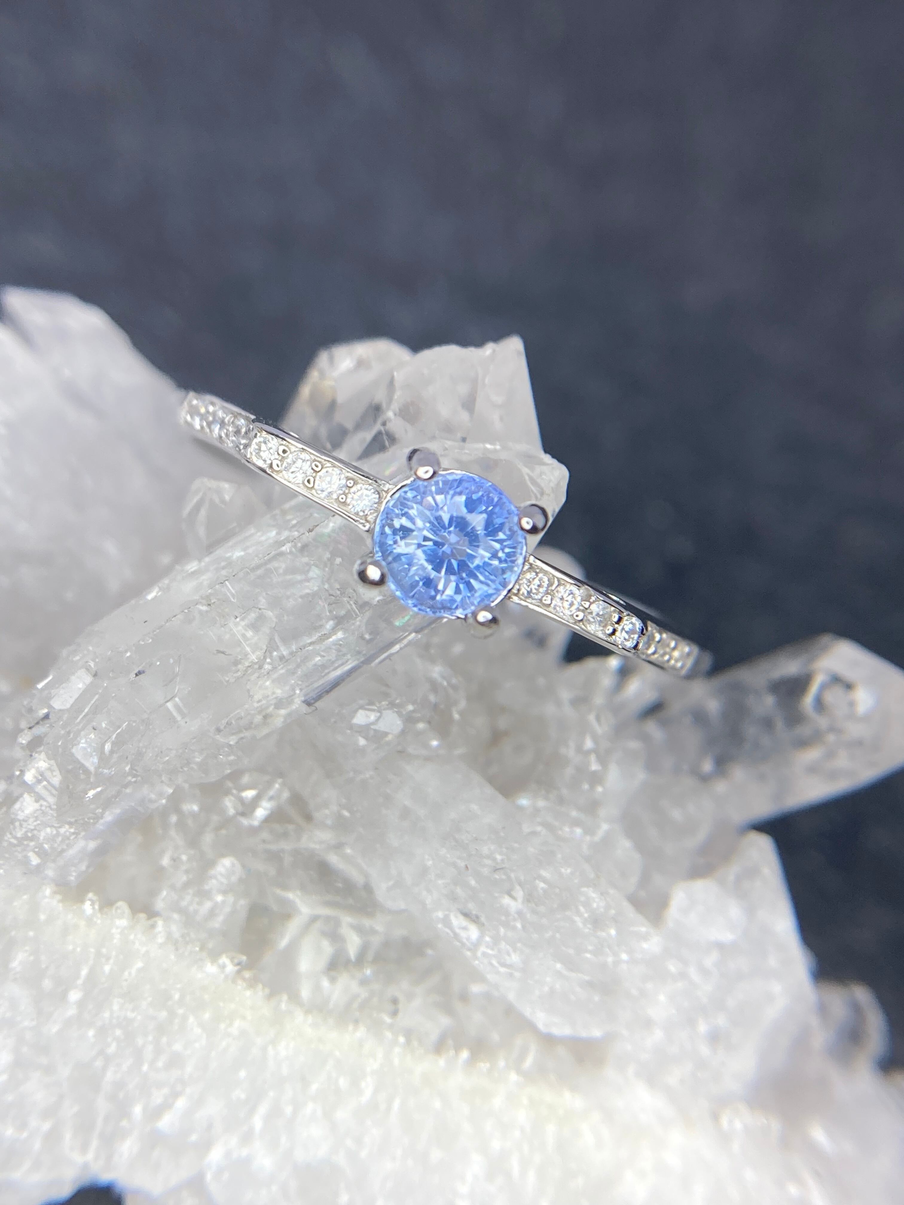 小さなジルコニアたちがサファイアの輝きを引き立てる清楚なリングです。