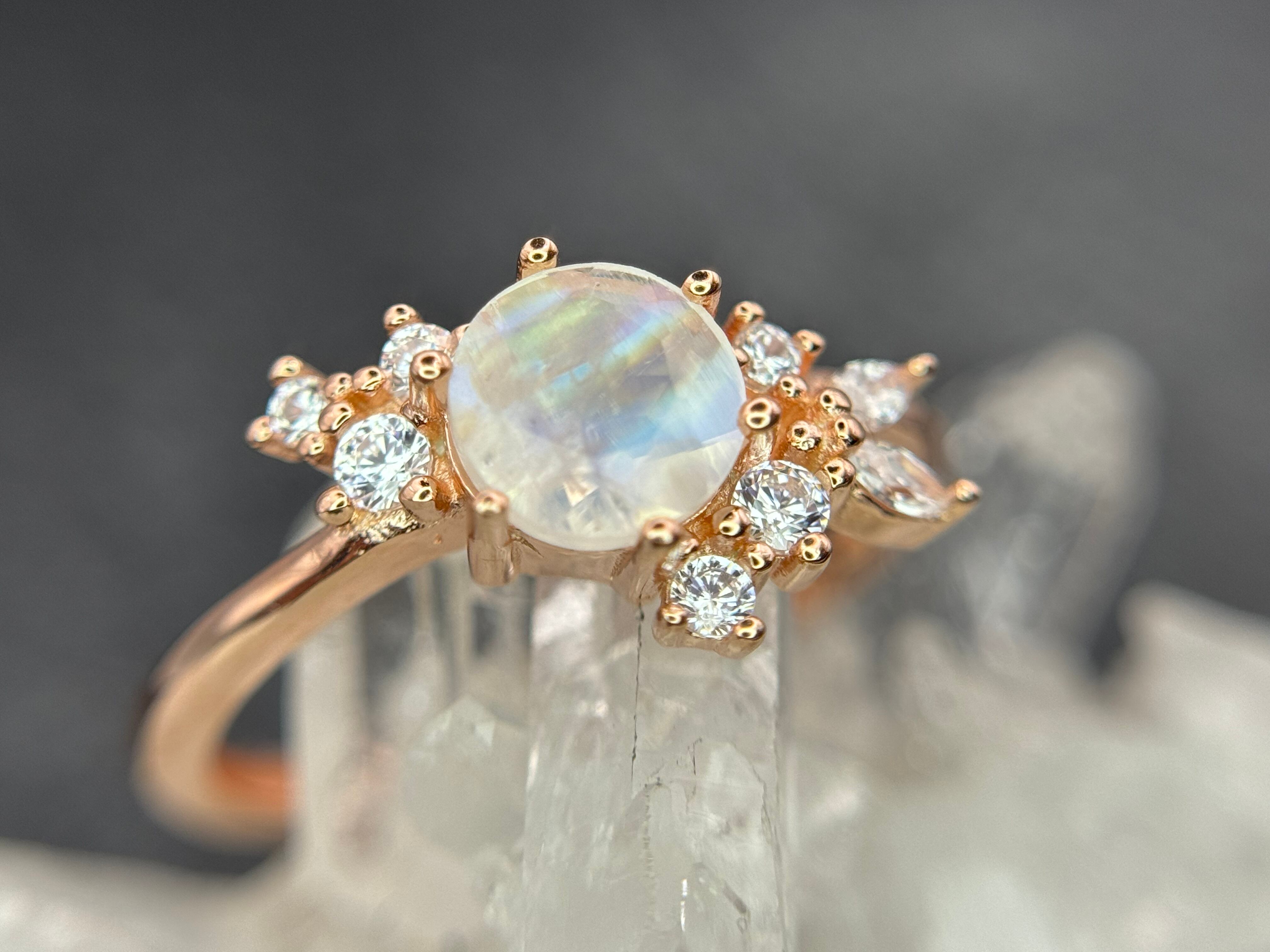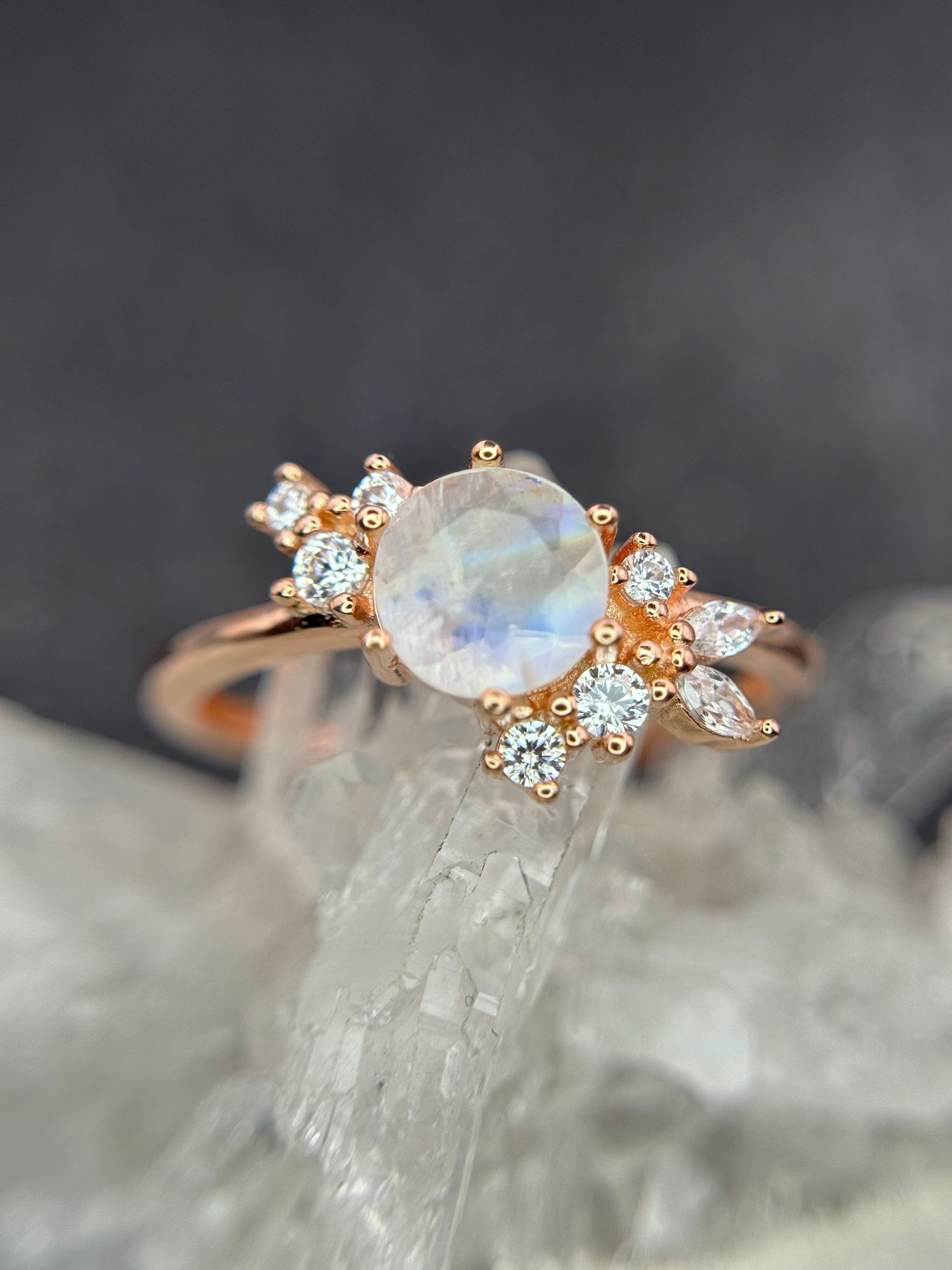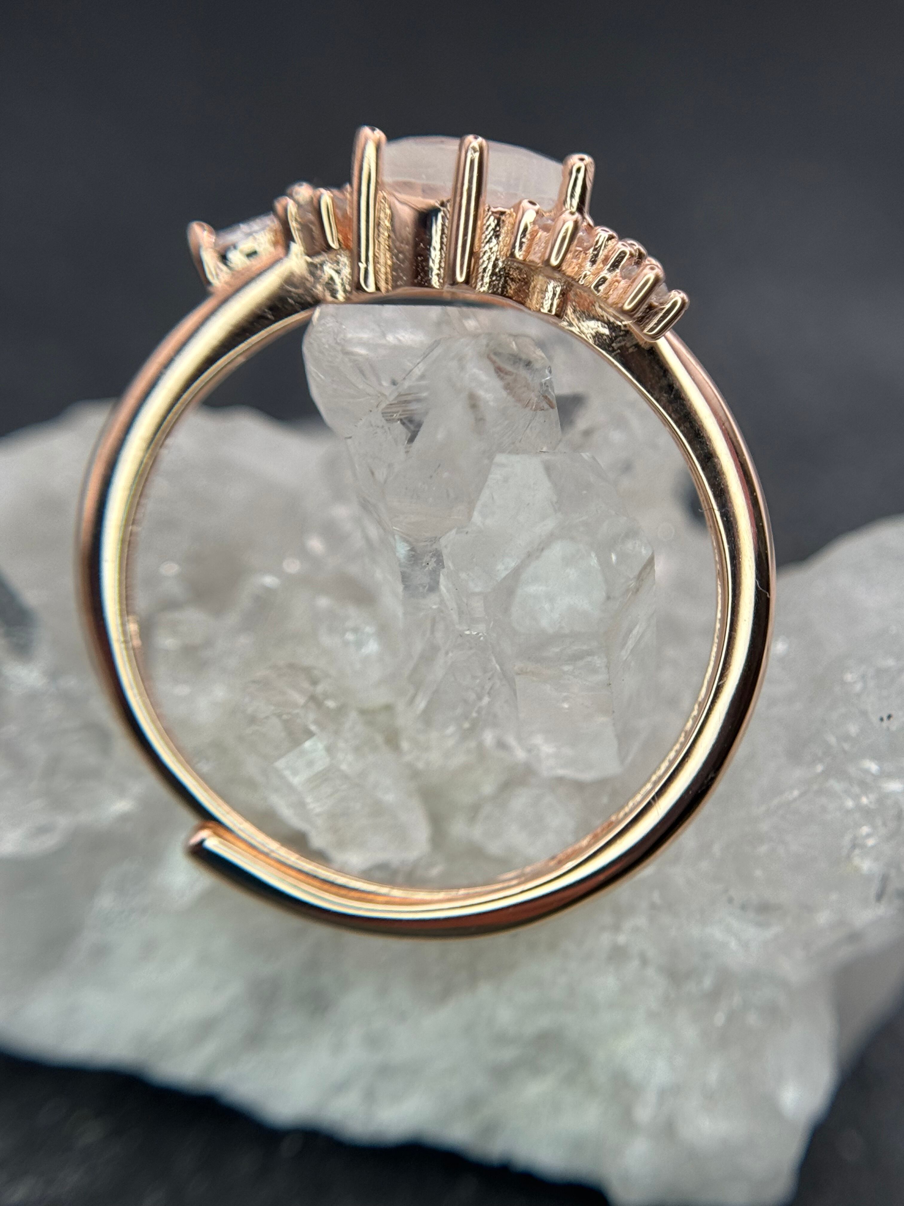 美しく包まれた花束のように並んだ小さなジルコニアたちが、トップのおおきなムーンストーン をさらに輝かせる繊細なリングです。