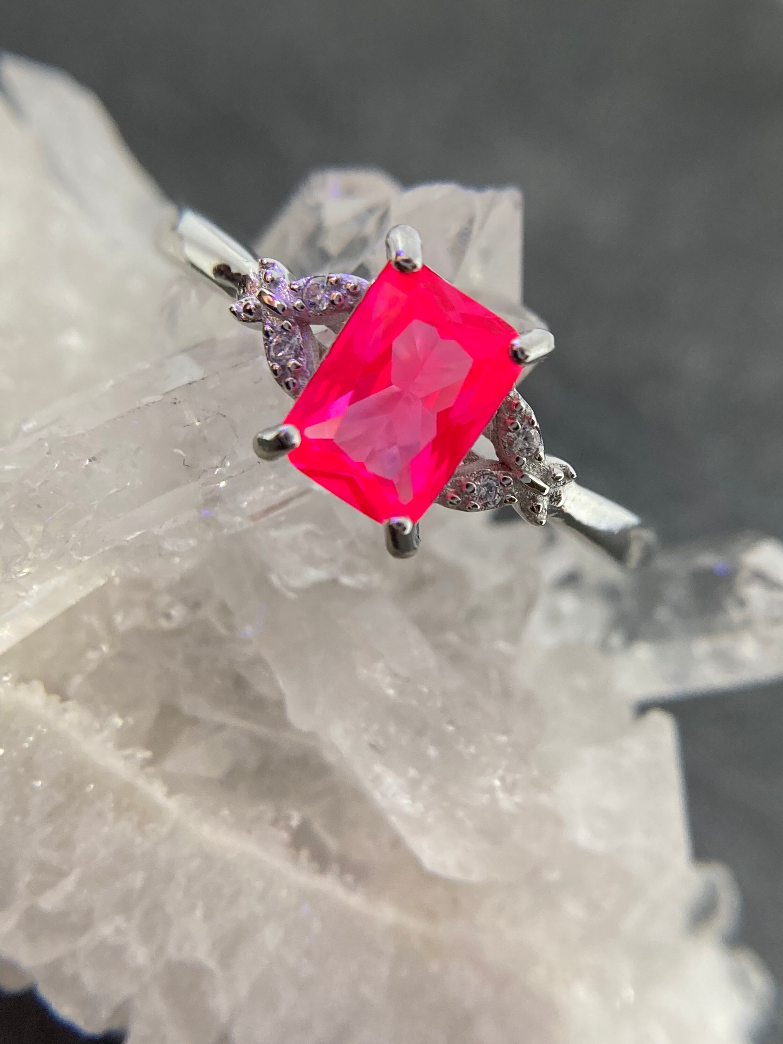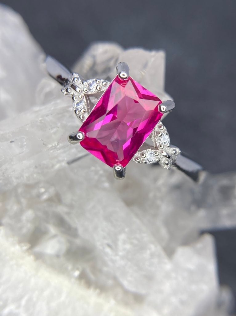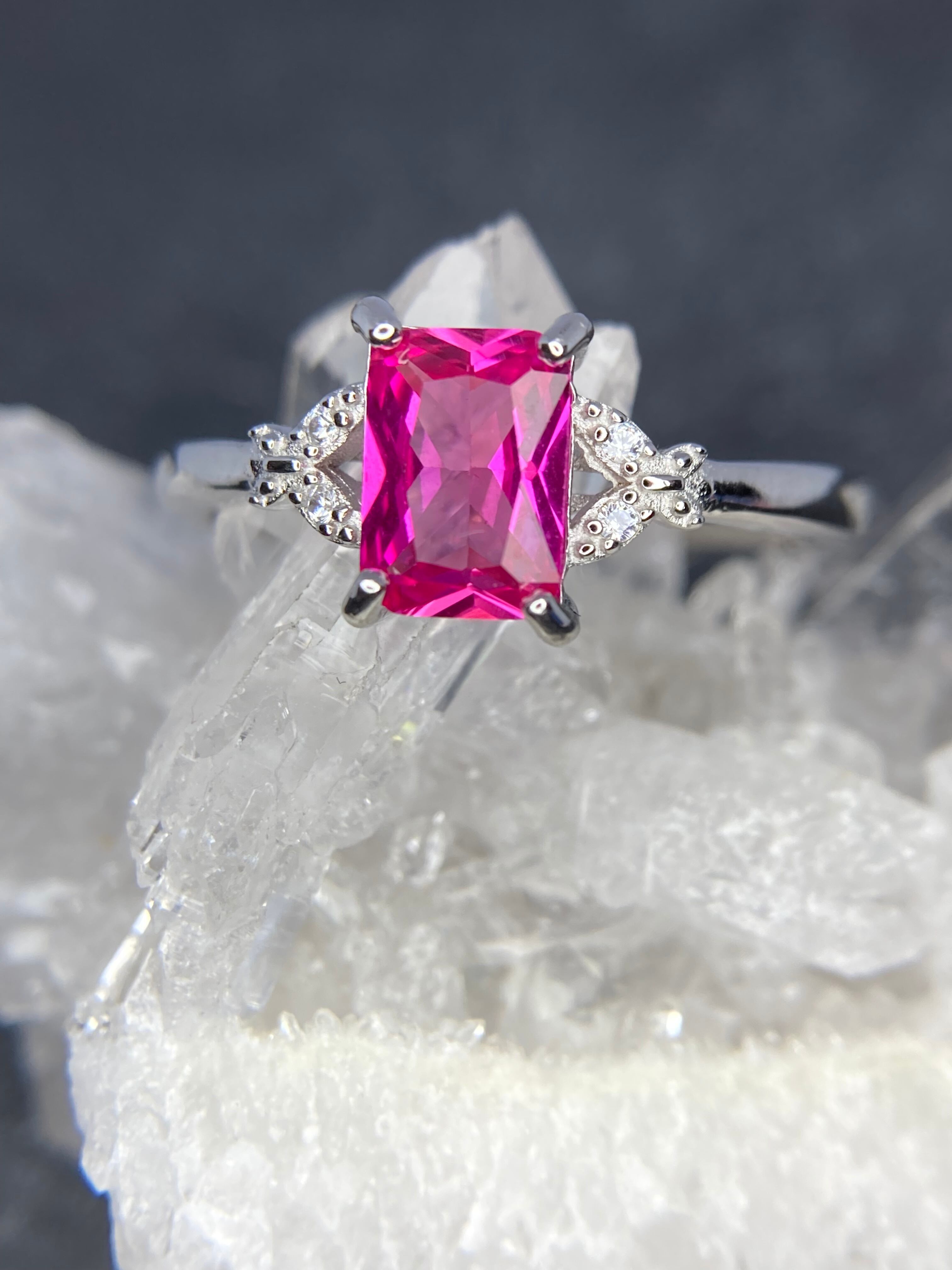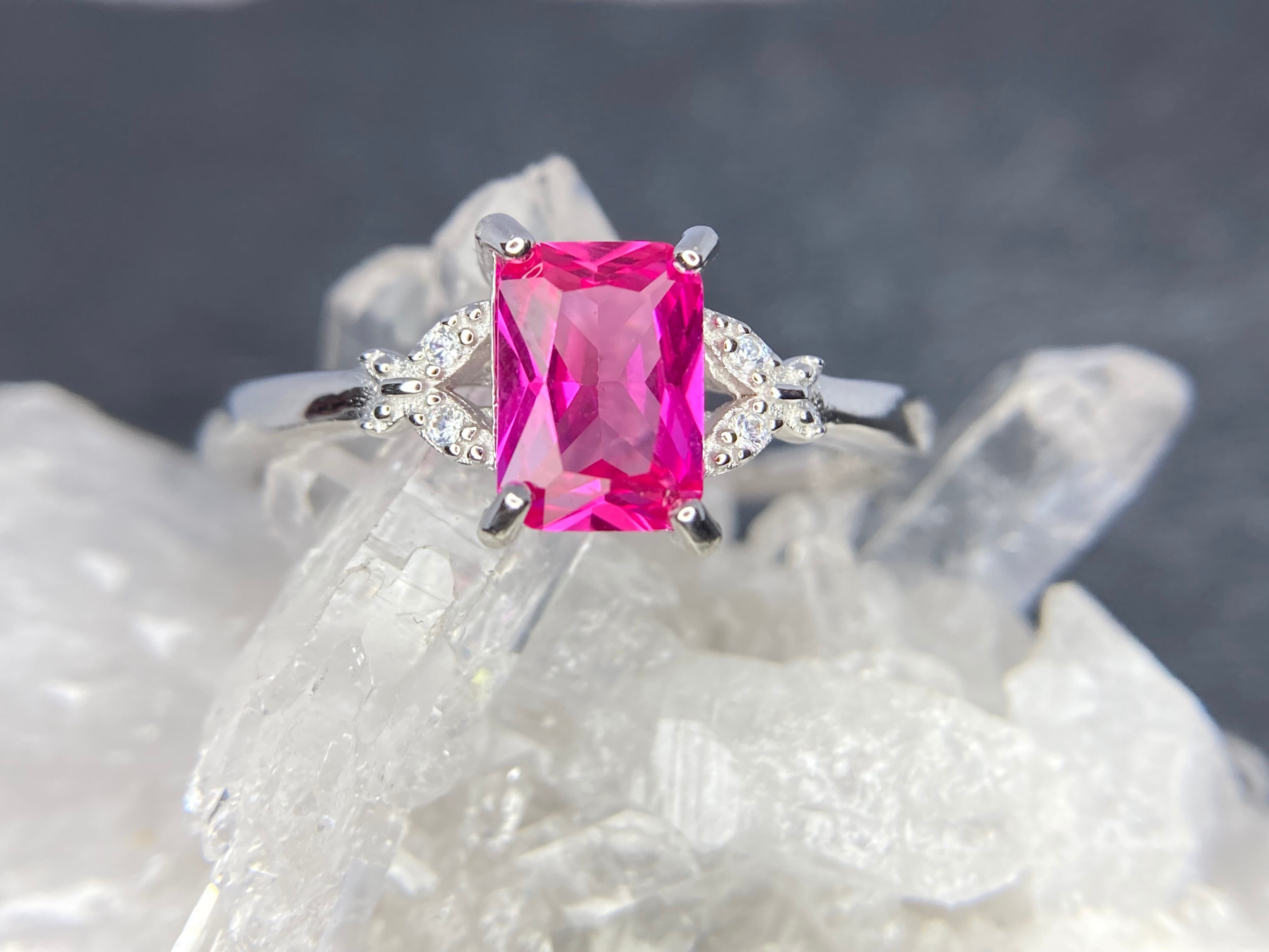 小さな蝶々たちが支える台座の中央に鎮座するのは美しい合成ピンクサファイア。