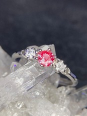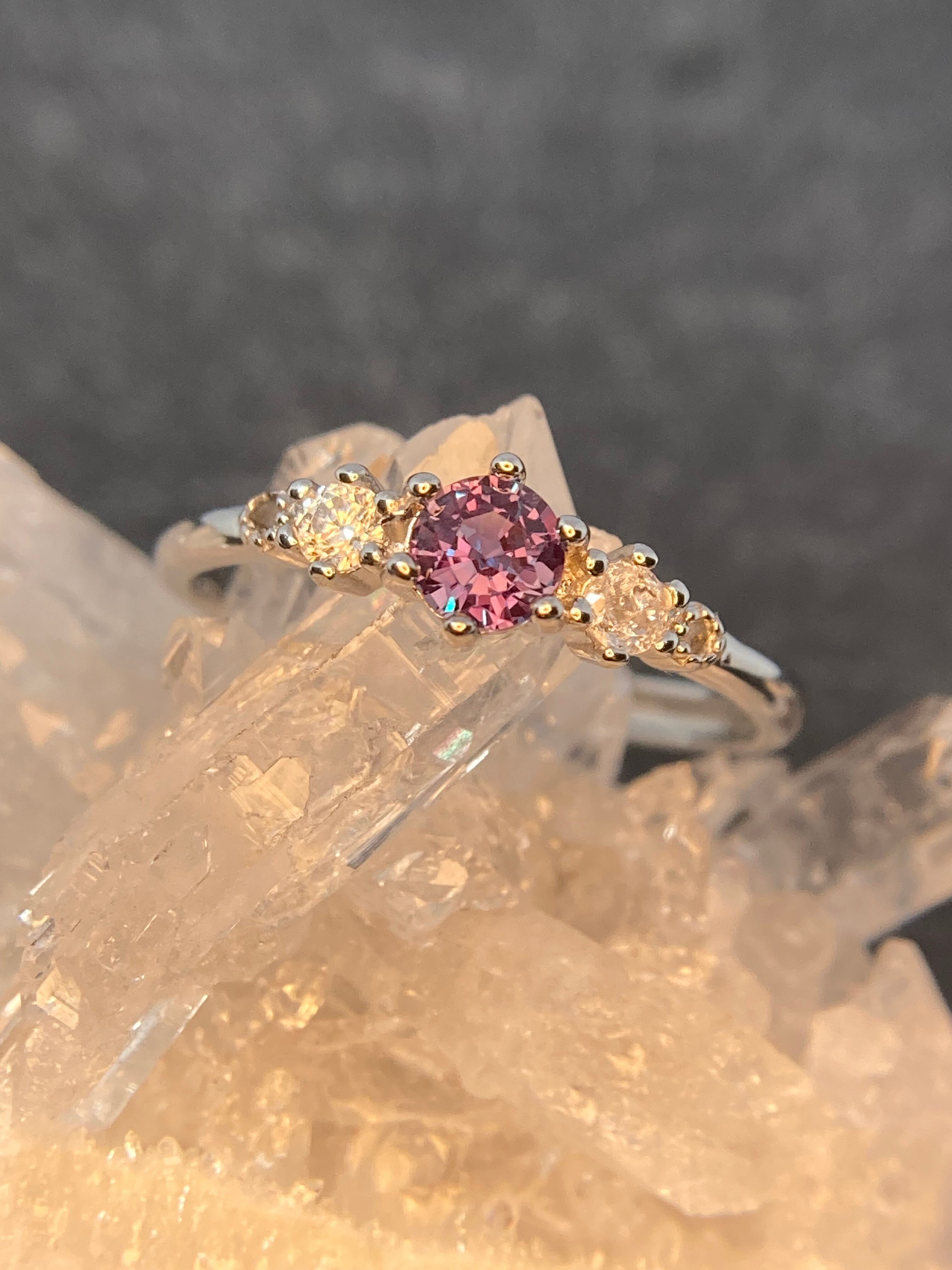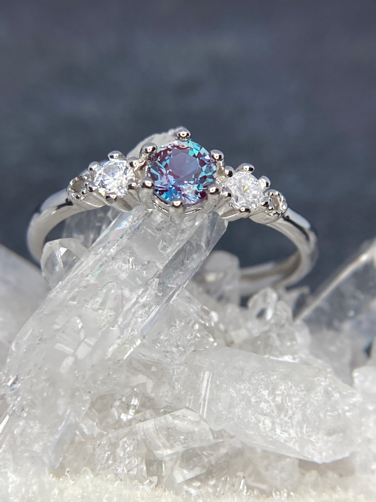 紫陽花の様に寄り添い合って並んだジルコニアたちのトップに輝くのは、美しい合成アレキサンドライト 。