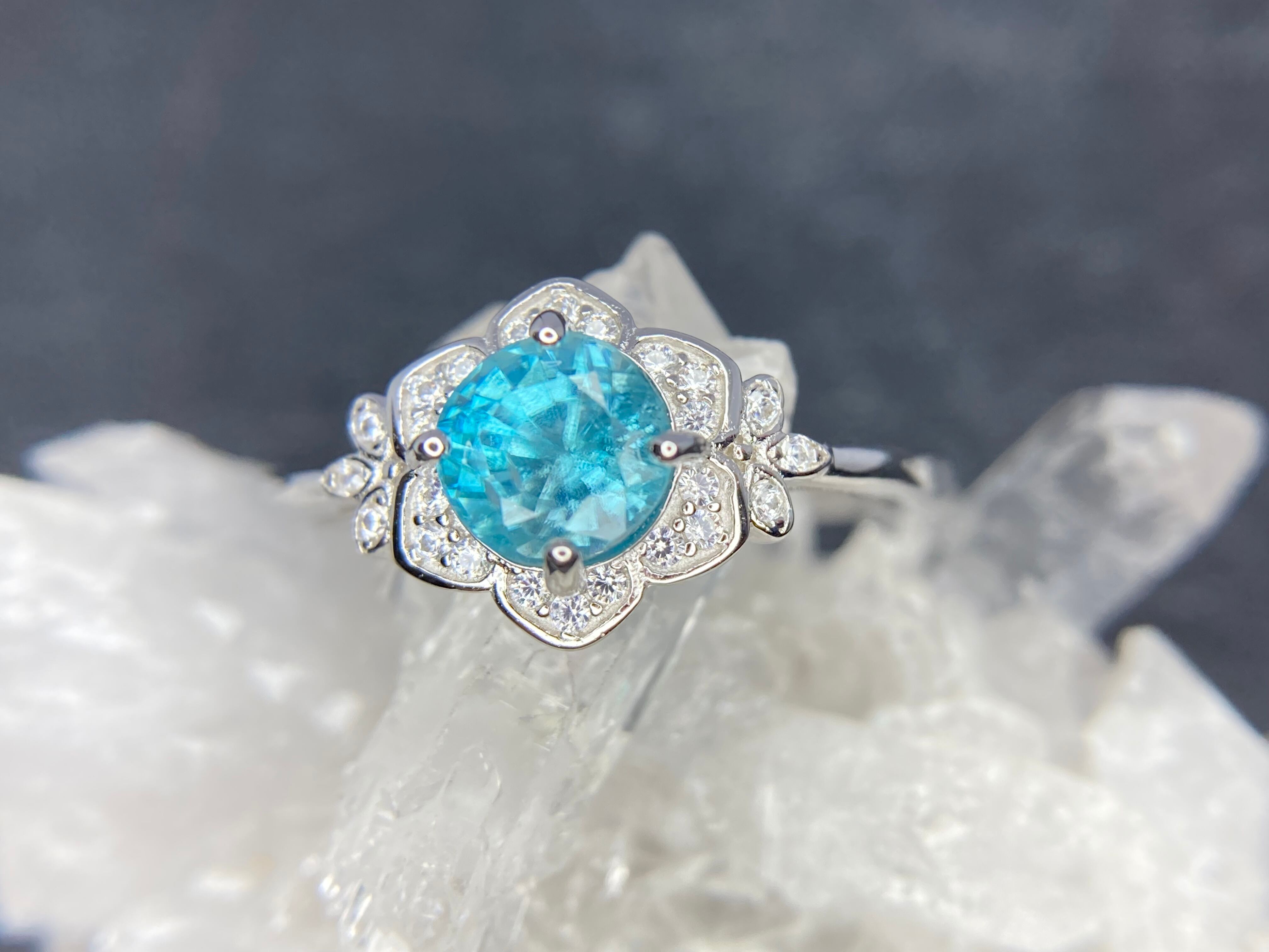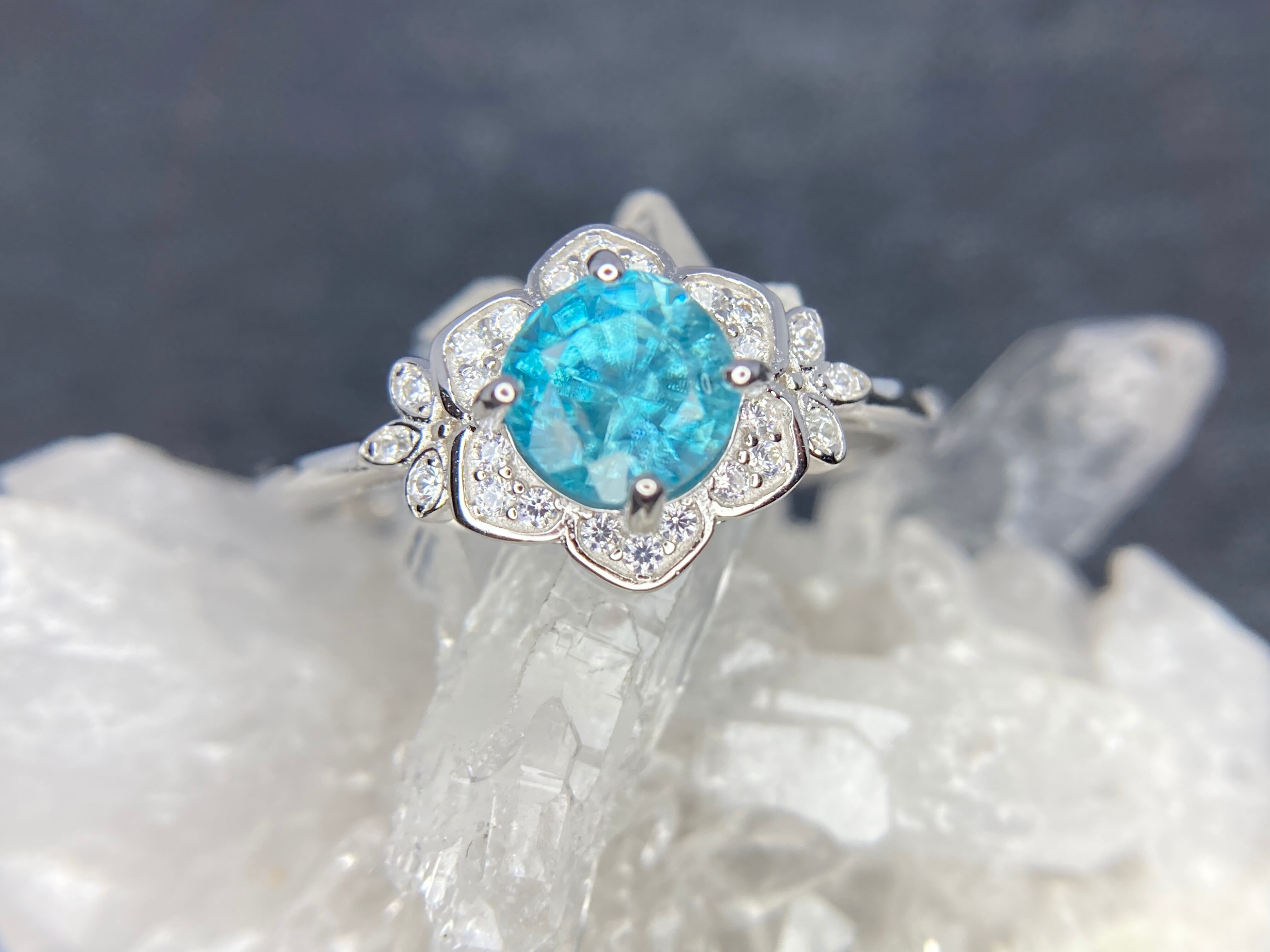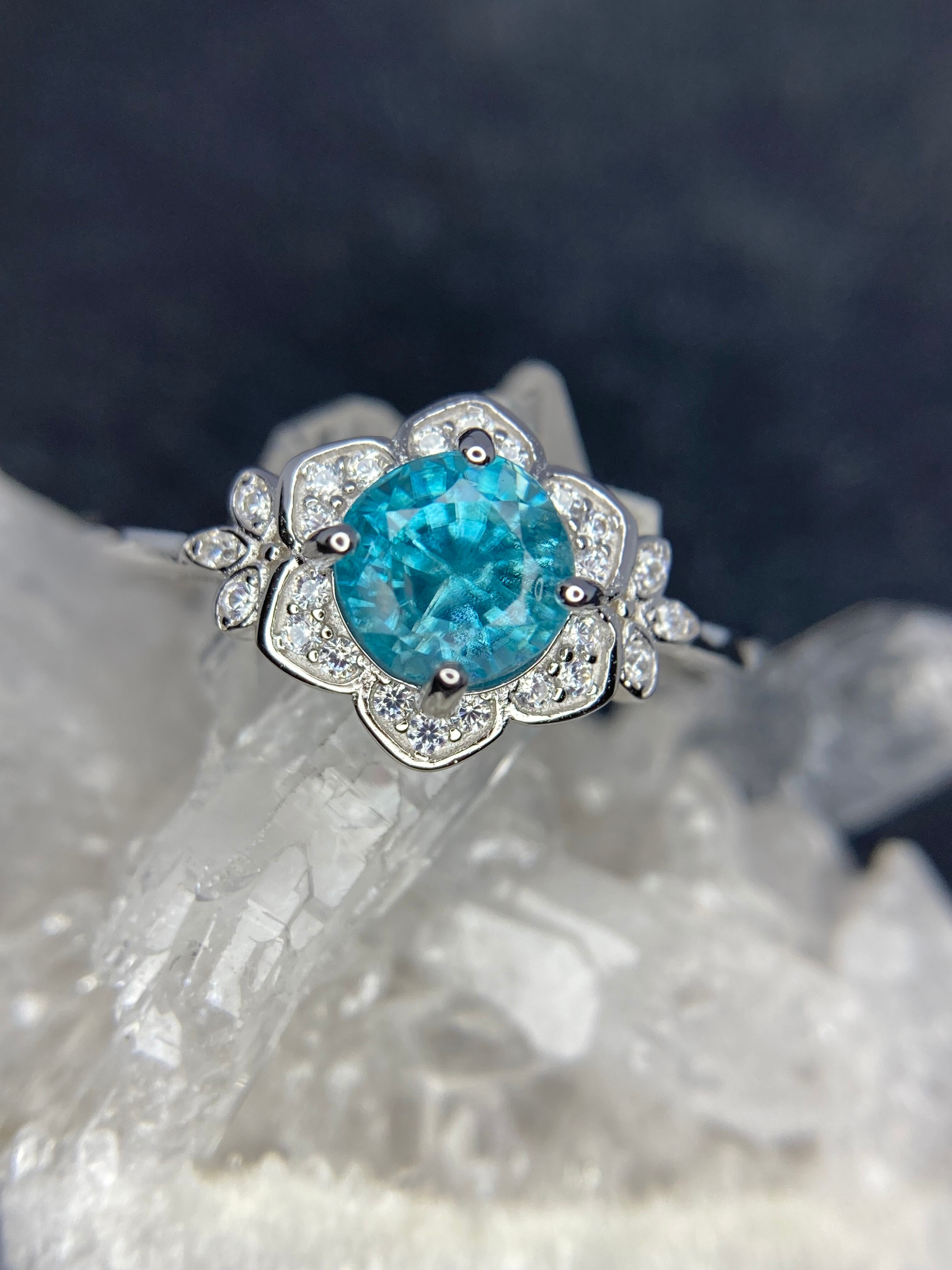 桔梗の花びらの中央に咲き誇る美しいラタナキリブルージルコン。