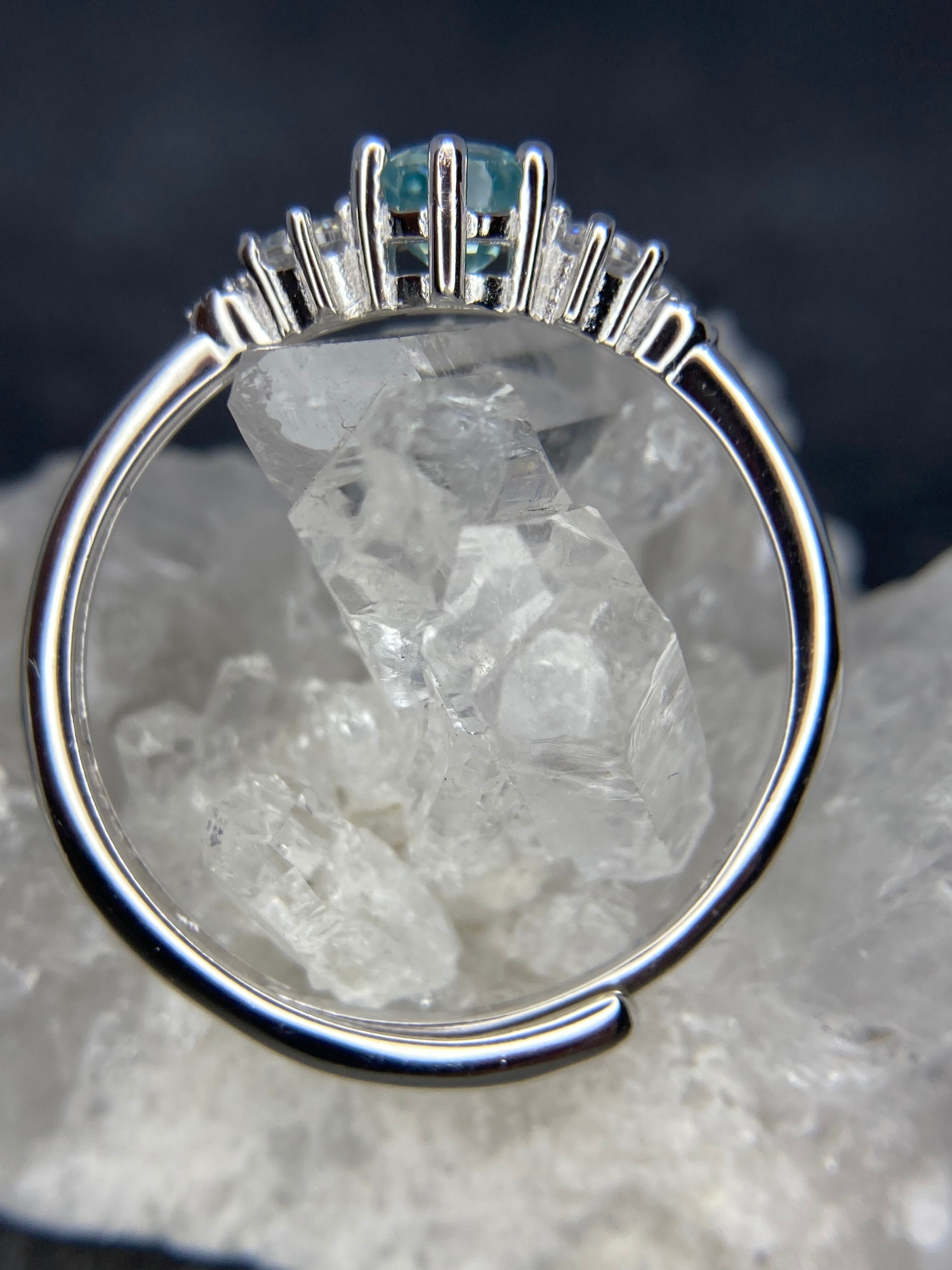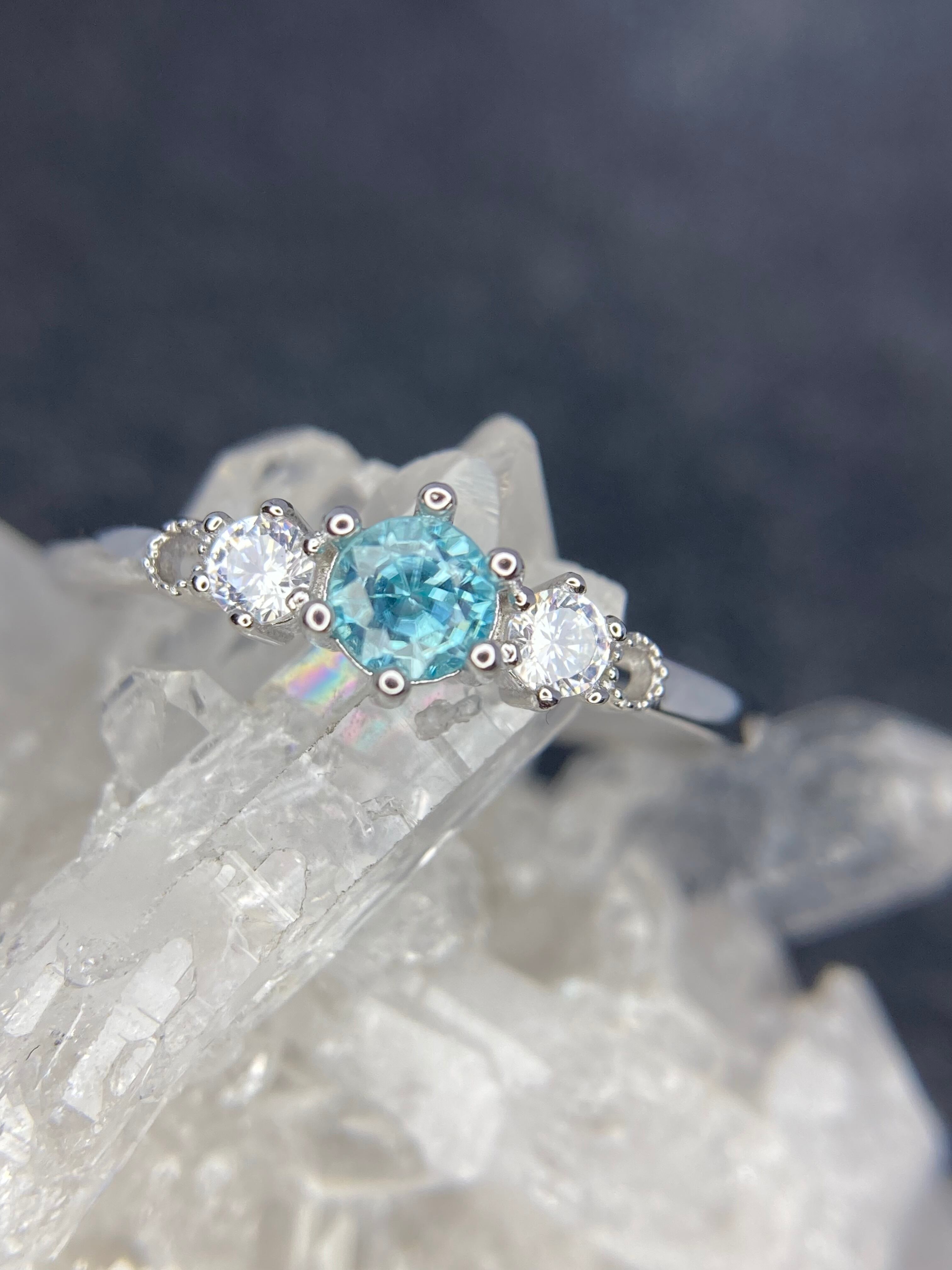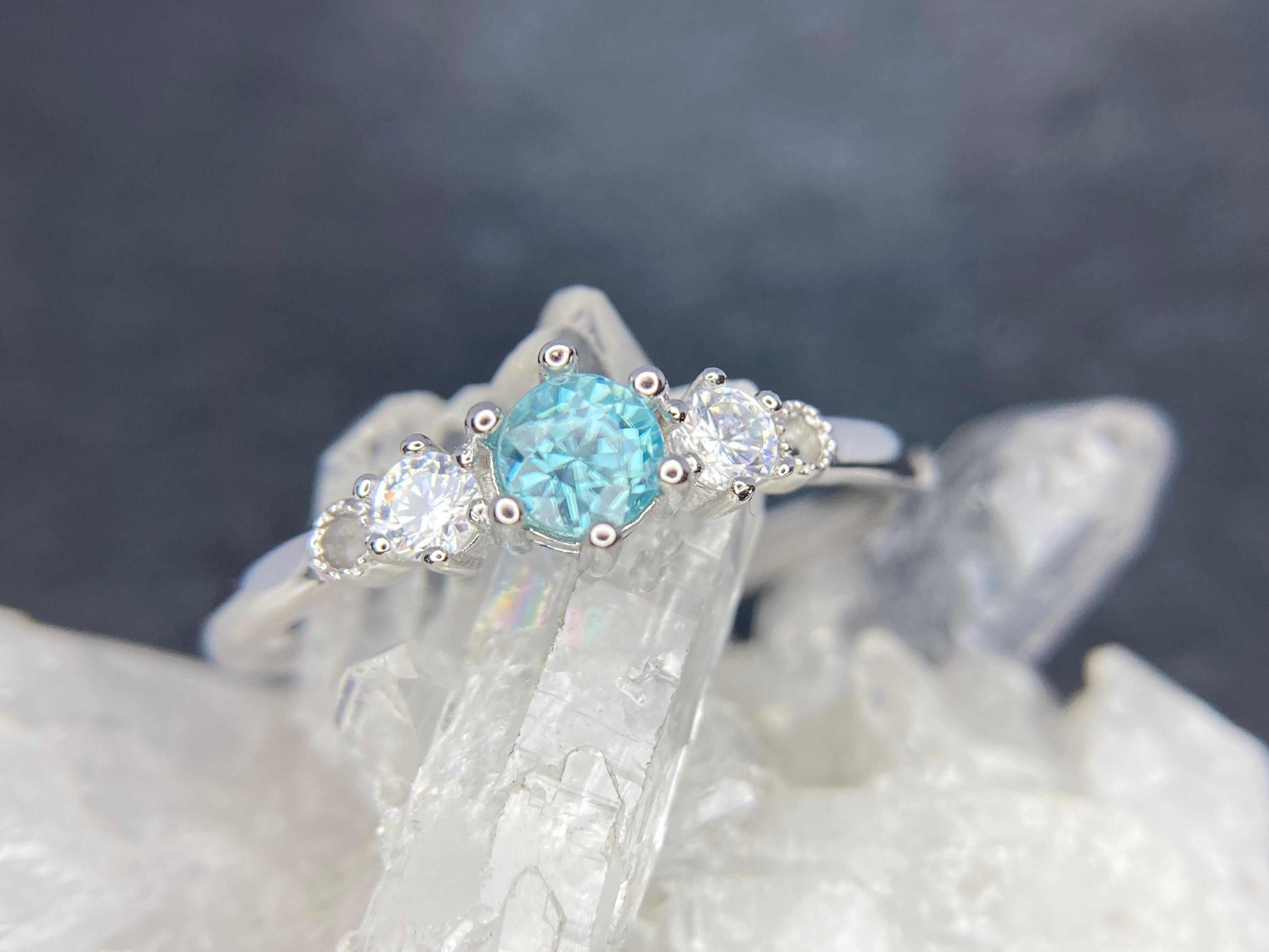 紫陽花の様に寄り添い合って並んだジルコニアたちのトップに輝くのは、美しいラタナキリブルージルコン。
