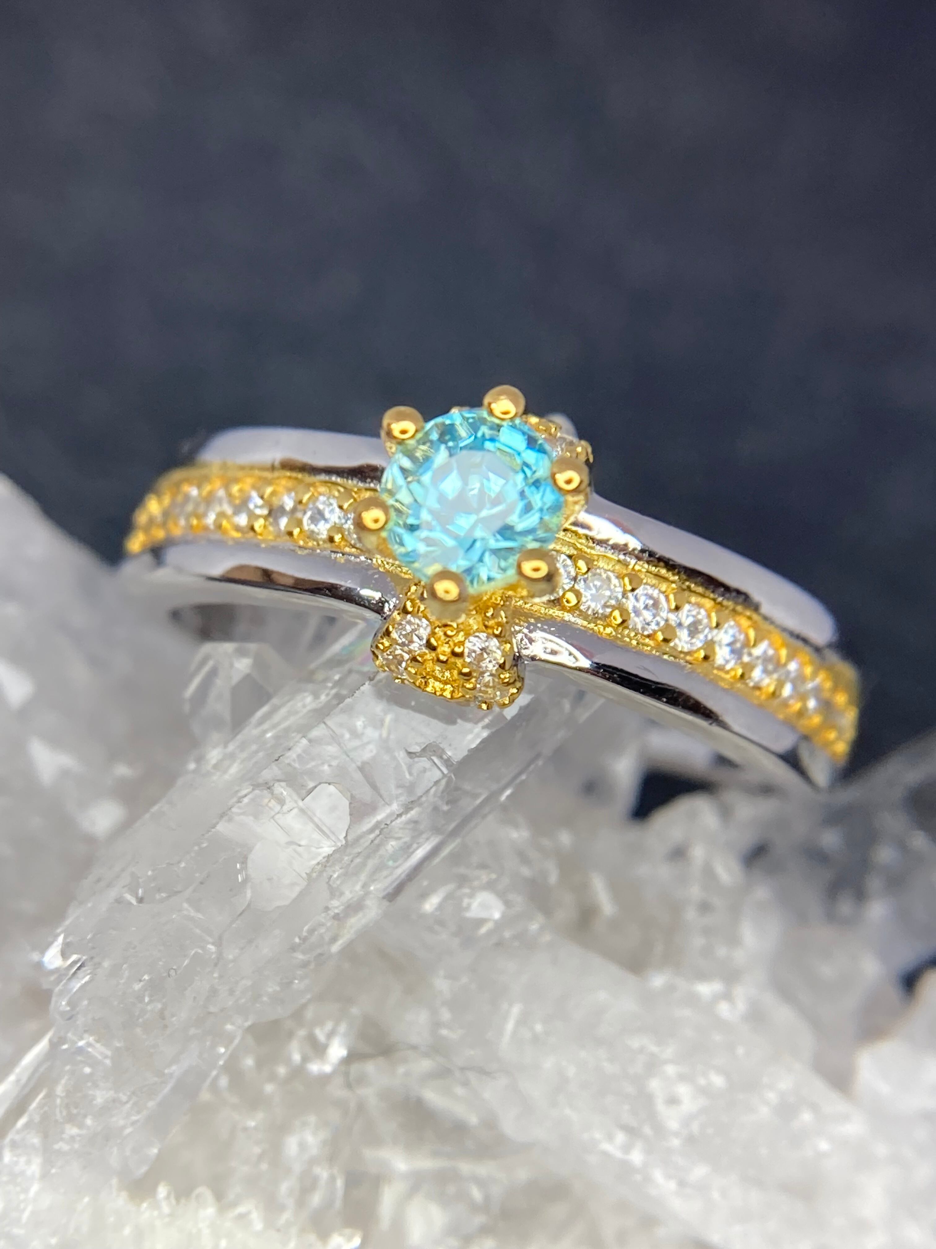 コンビカラーの中央に並んだジルコニアたちのトップに輝くのは、美しいラタナキリブルージルコン。