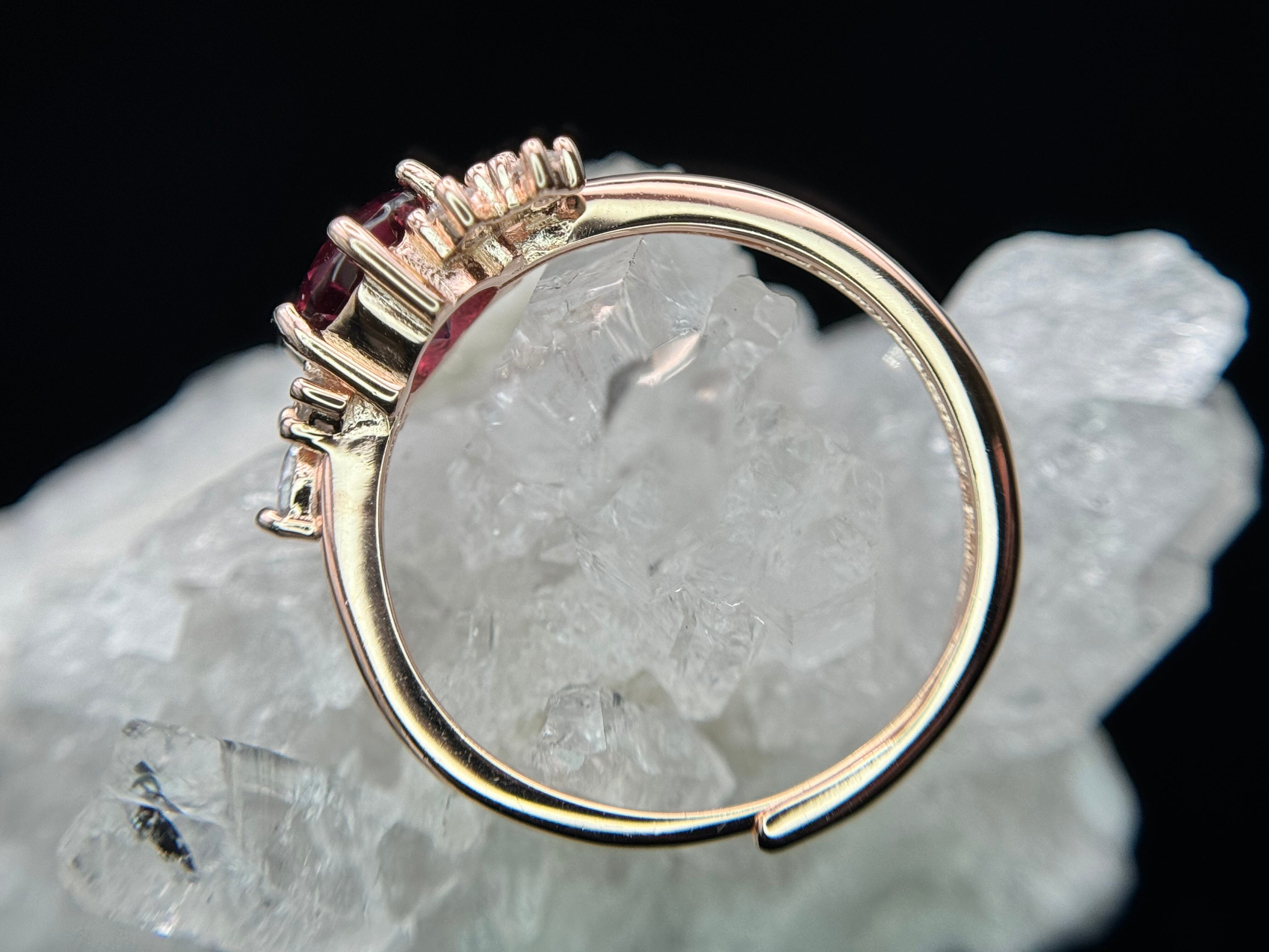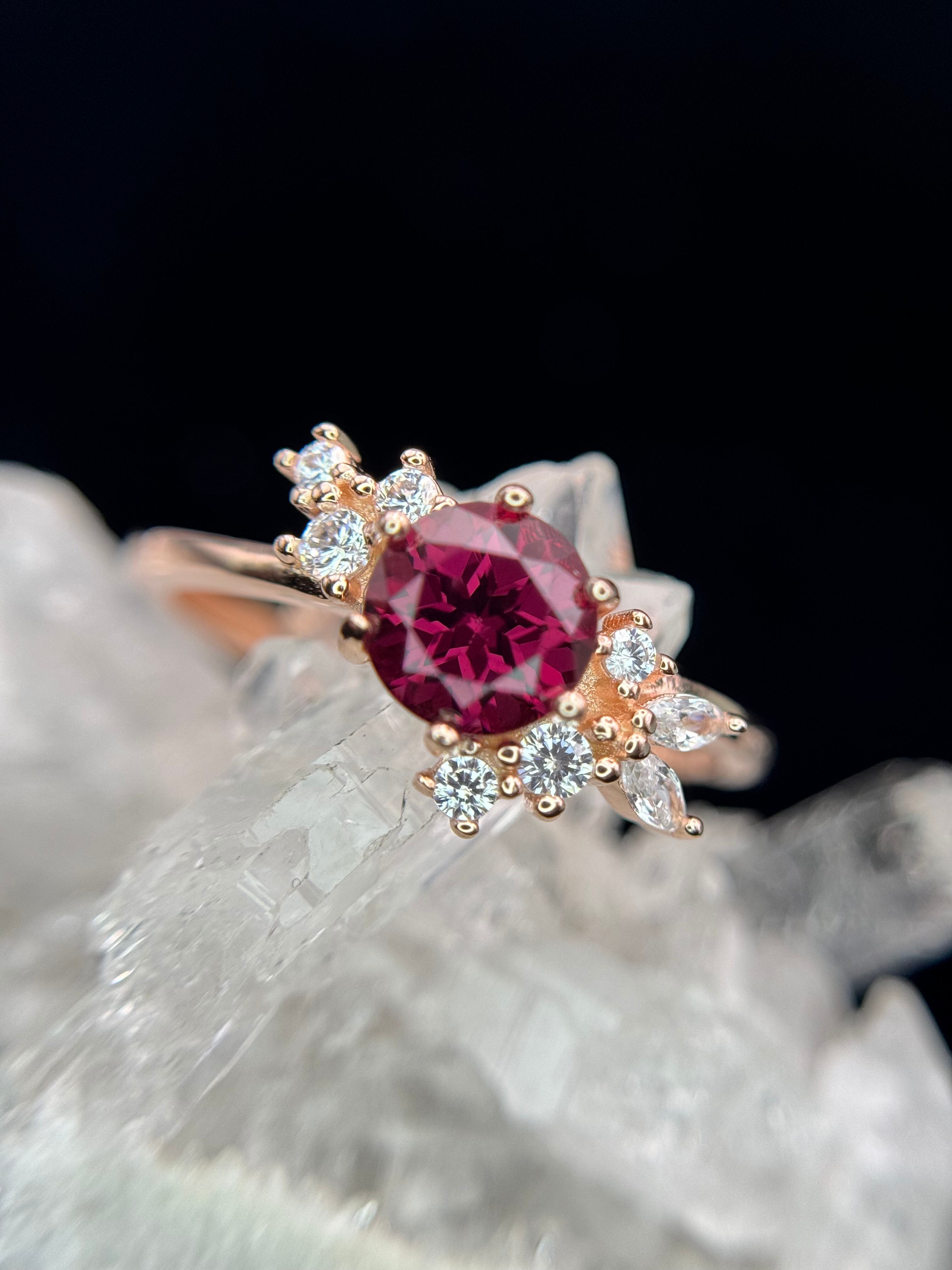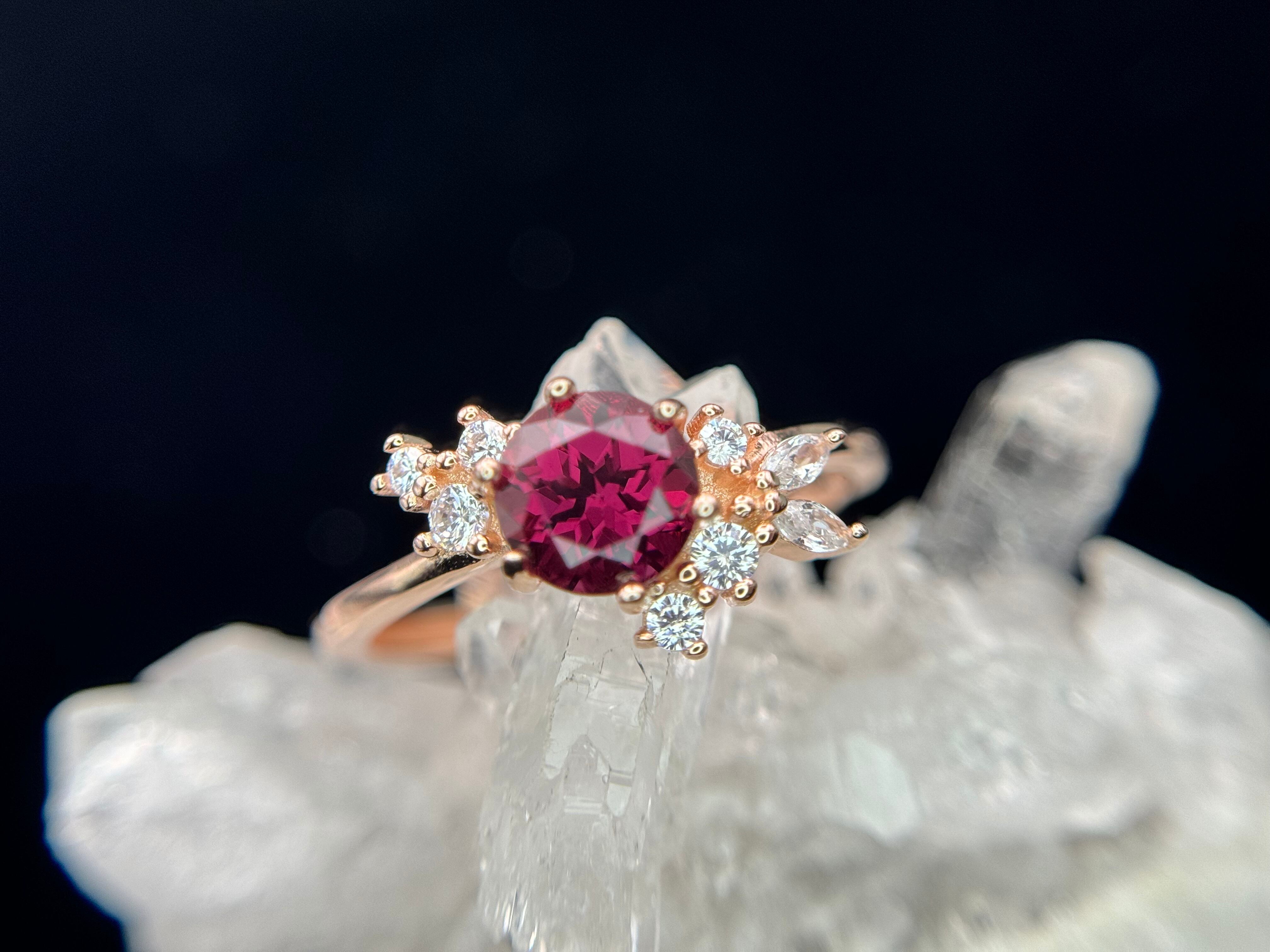美しく包まれた花束のように並んだ小さなジルコニアたちが、とろりとした色合いのロードライトガーネットをさらに輝かせる繊細なリングです。