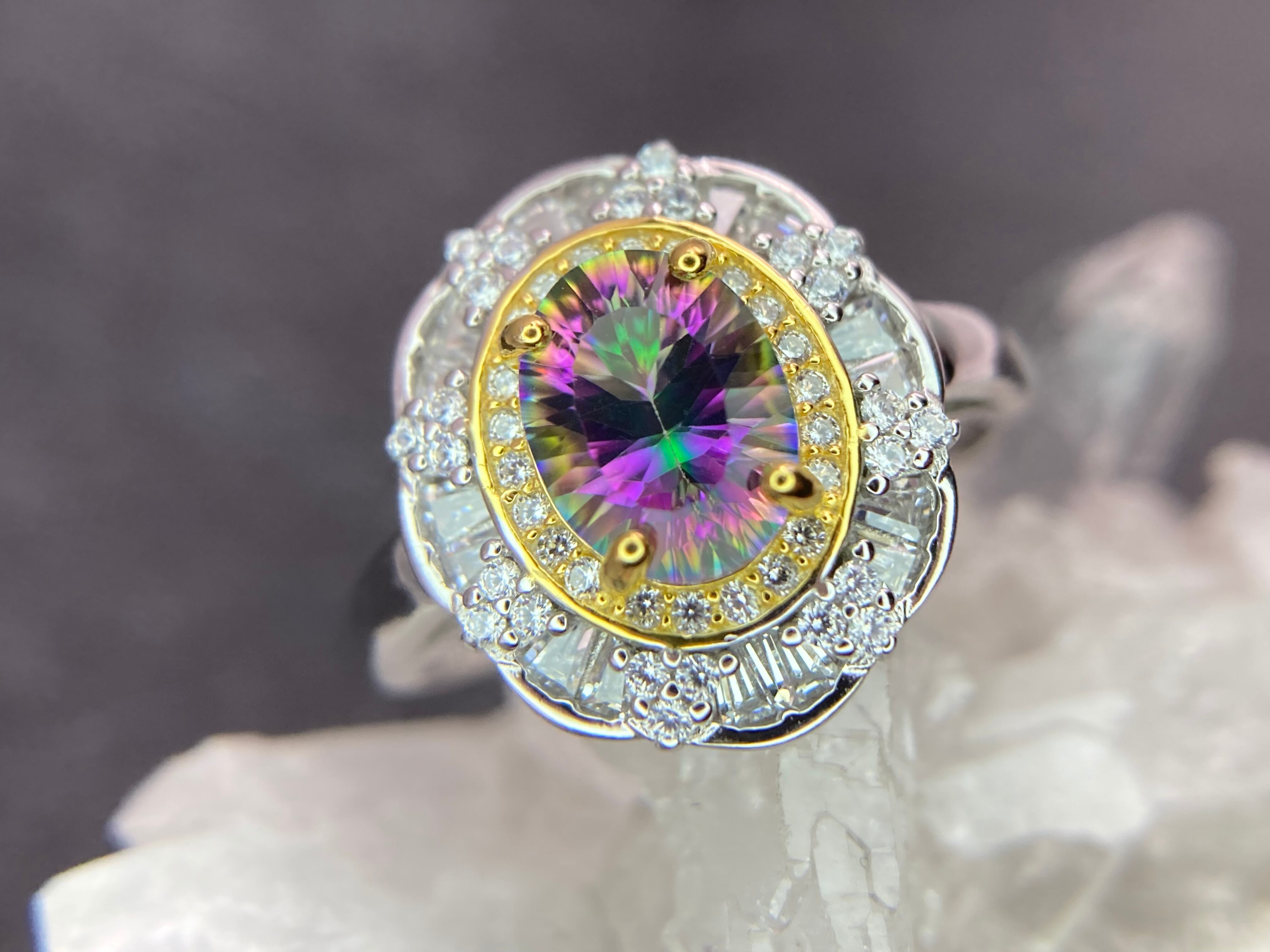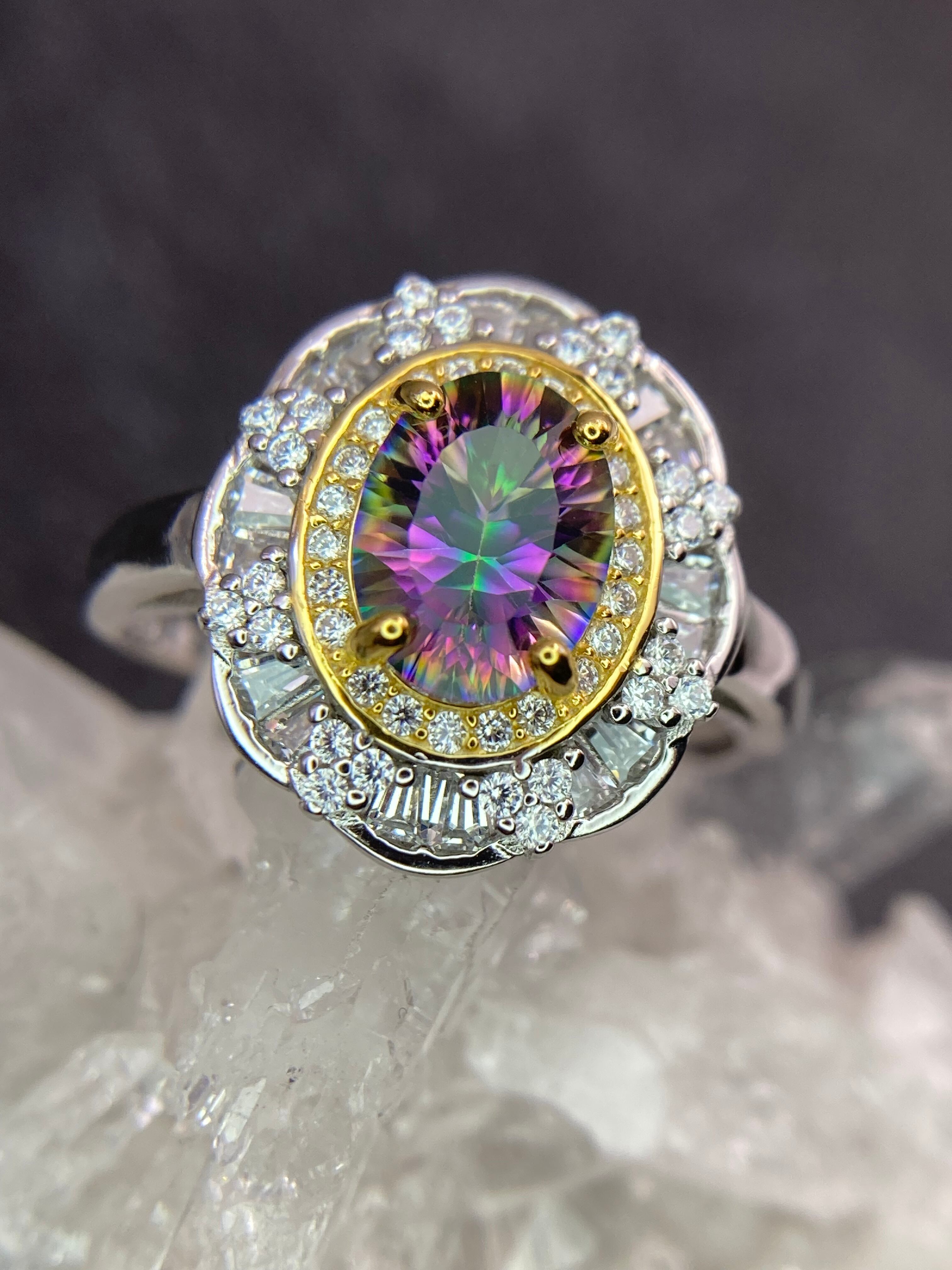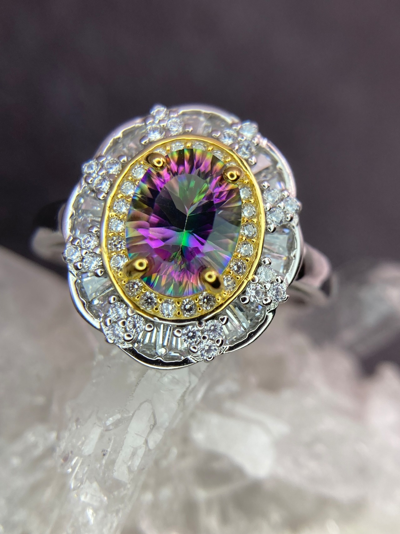 まるで宇宙空間の様に美しいコンケーブカットのミスティックトパーズが中央に鎮座したゴージャスなリングです。
