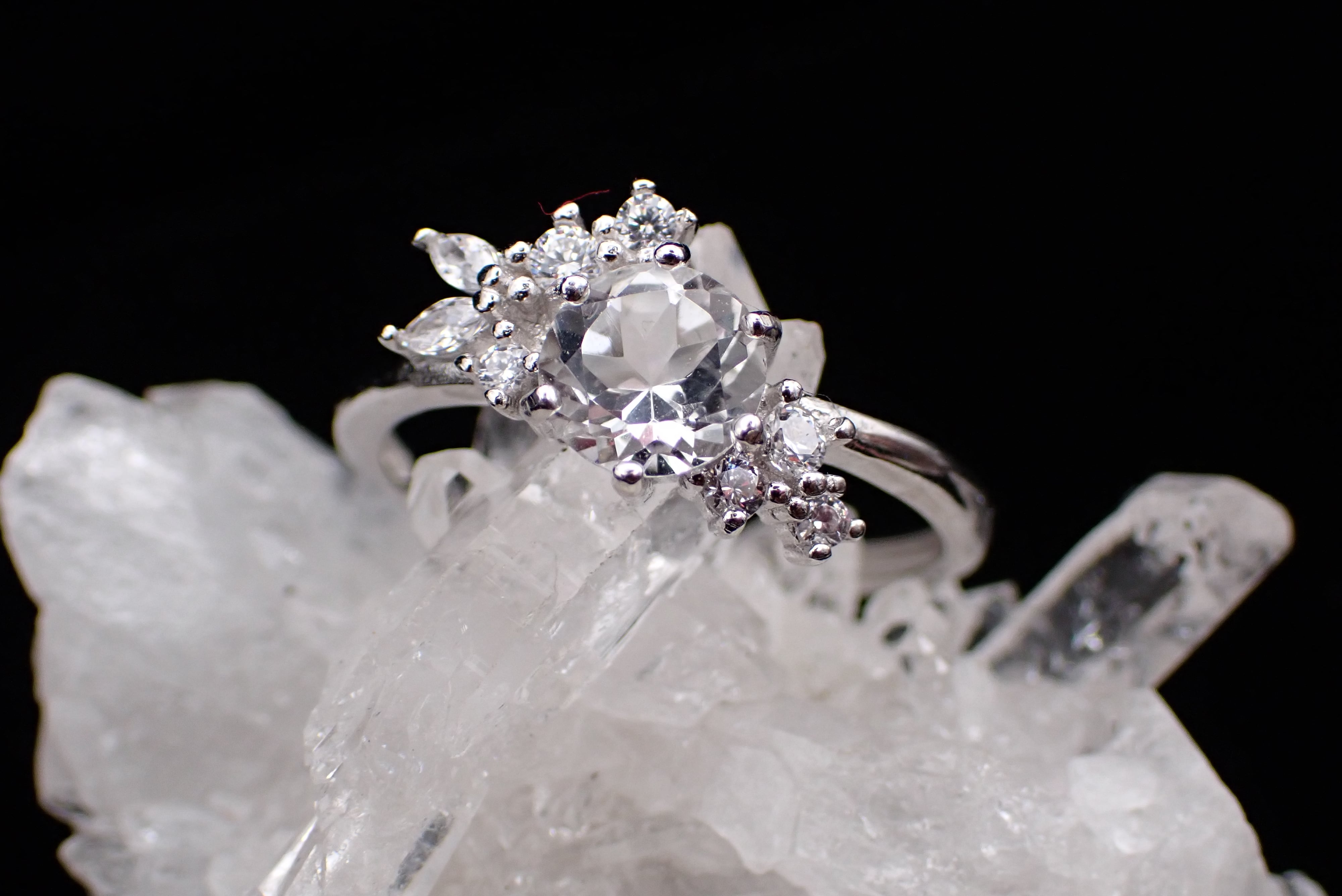 美しく包まれた花束のように並んだ小さなジルコニアたちが、可憐なホワイトトパーズをさらに輝かせる繊細なリングです。