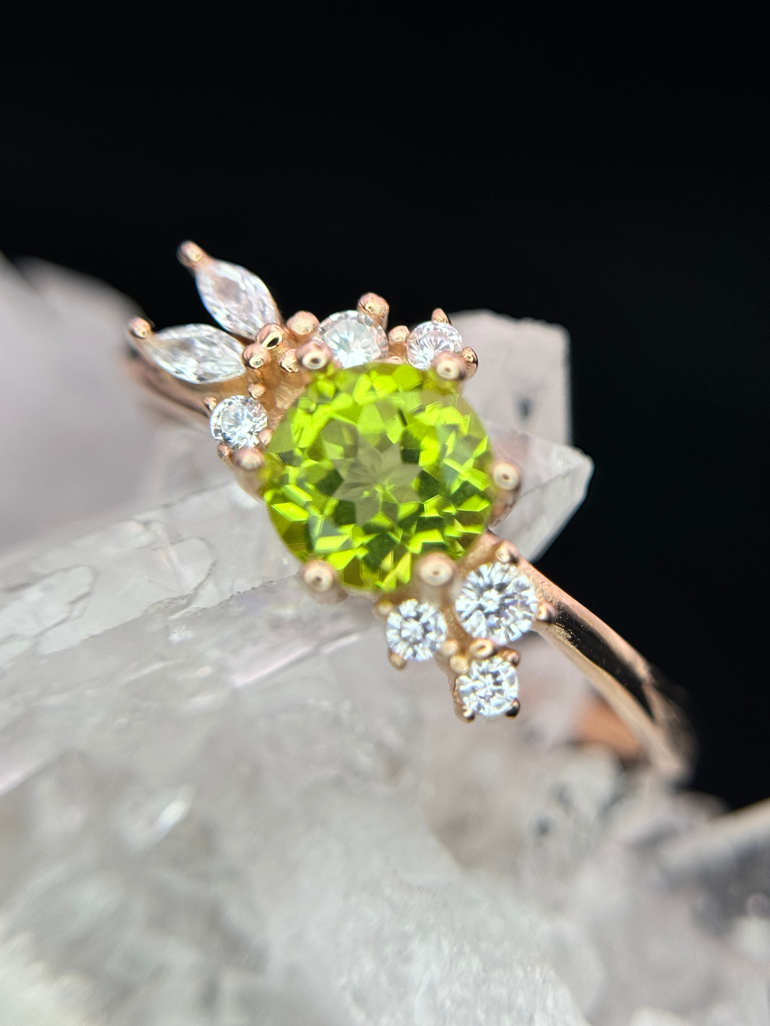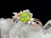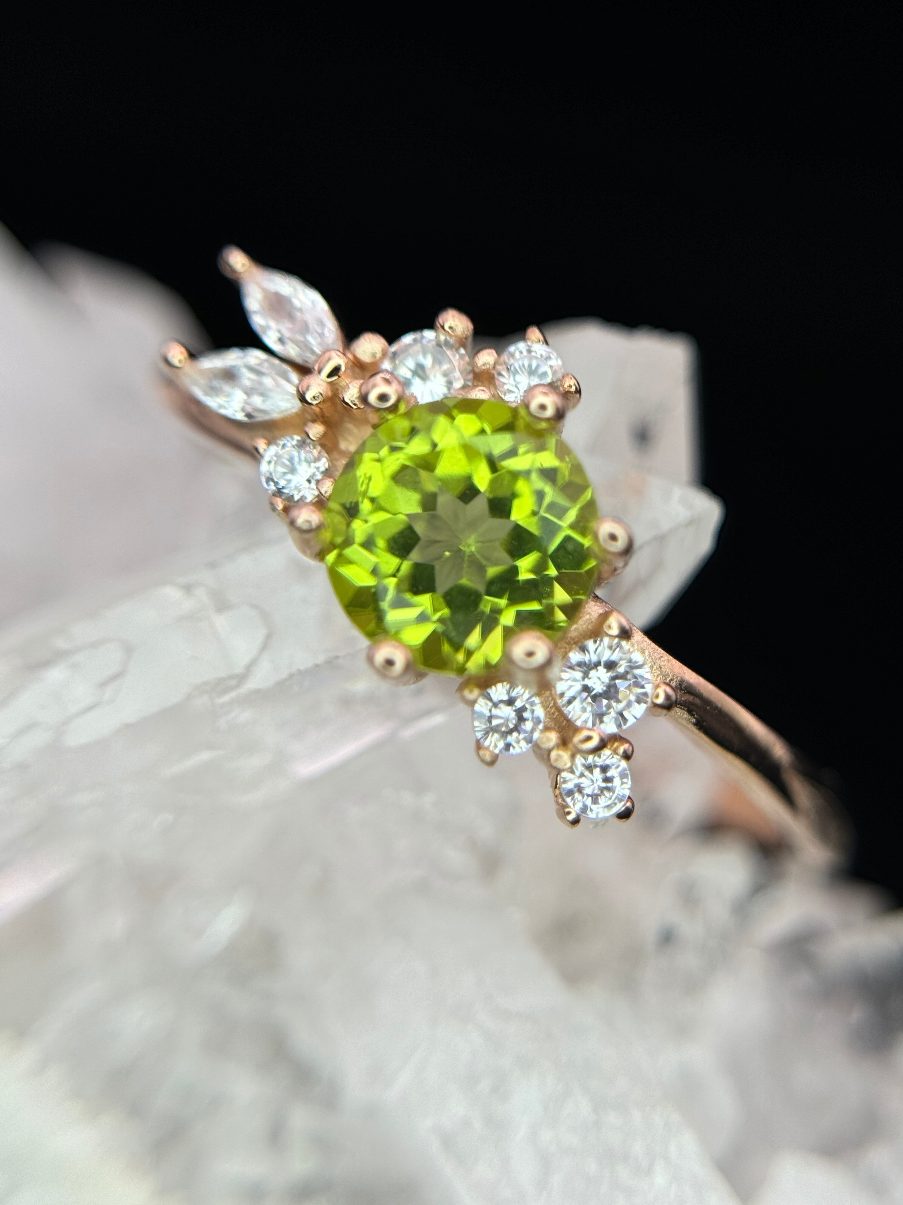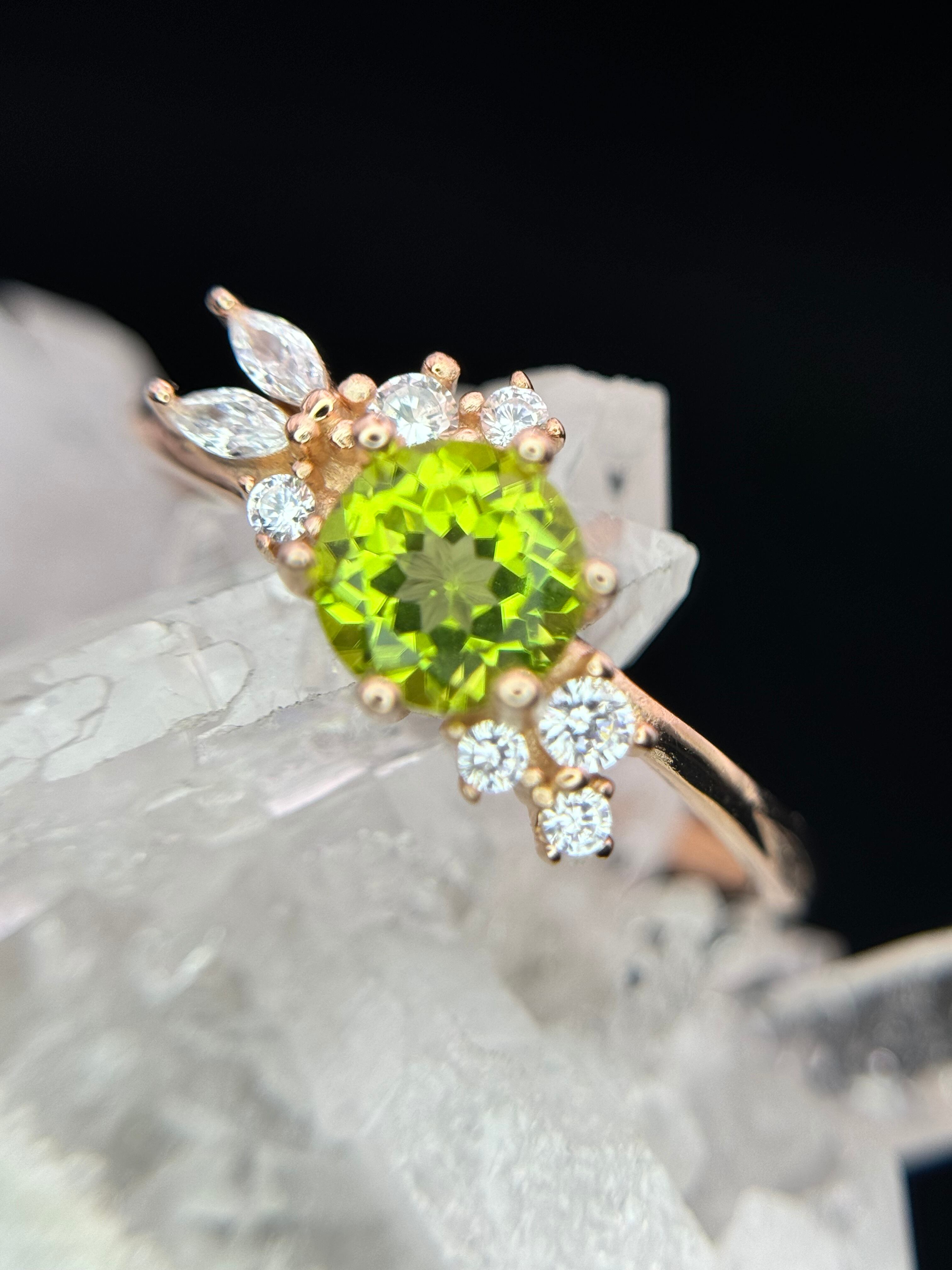 美しく包まれた花束のように並んだ小さなジルコニアたちが、ビタミンカラーペリドットをさらに輝かせる繊細なリングです。