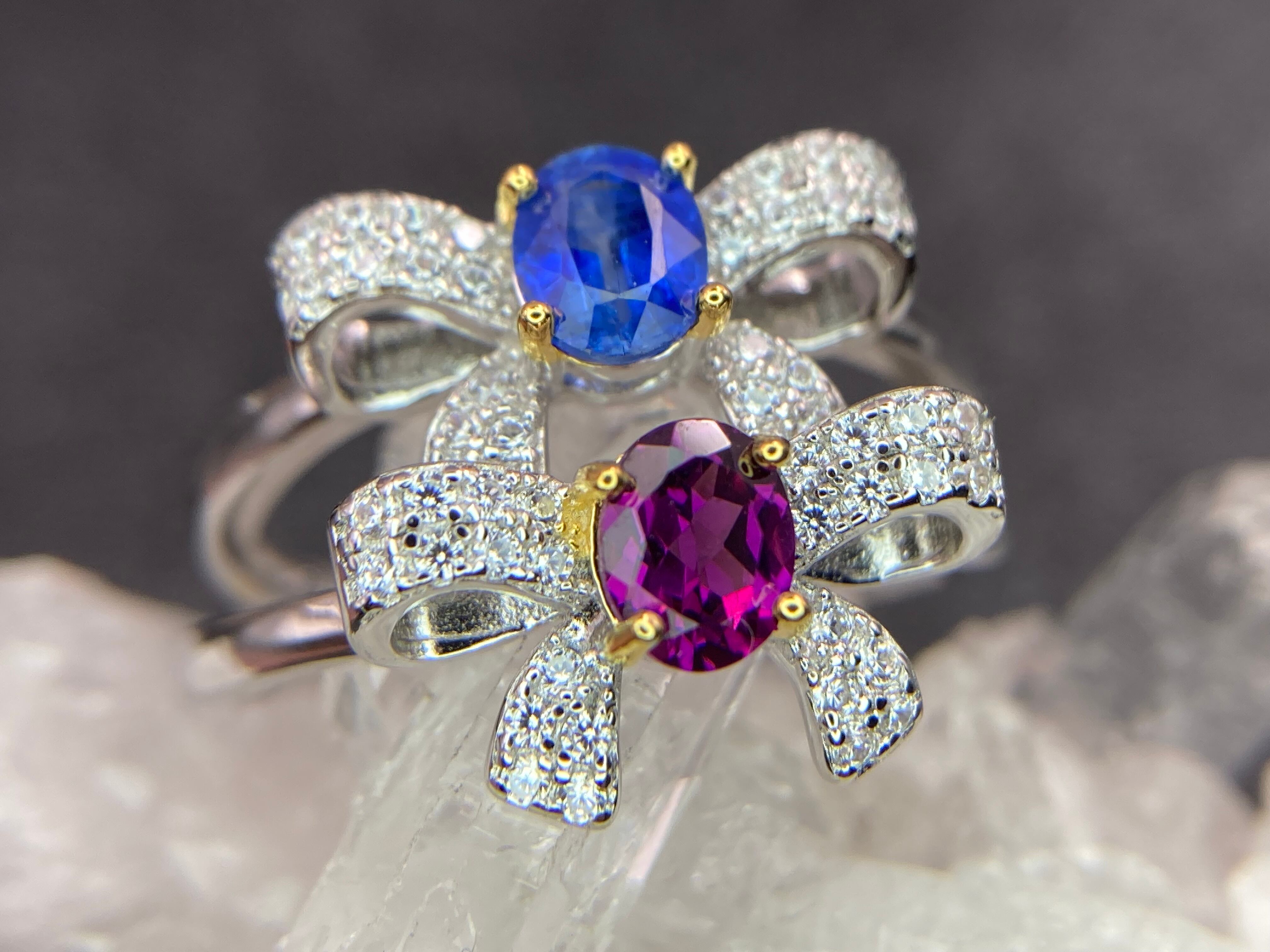 中央に美しいカイヤナイトとロードライトガーネットをセッティングしたふわりとしたリボンモチーフのリングです。