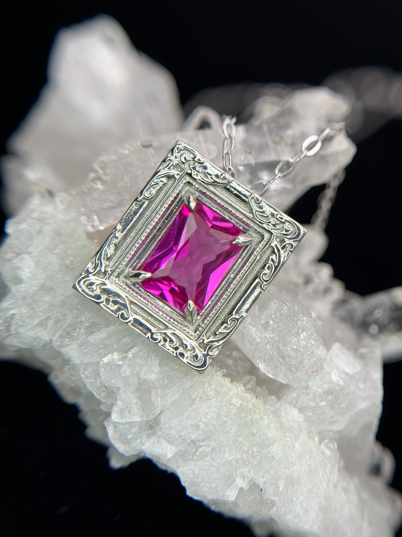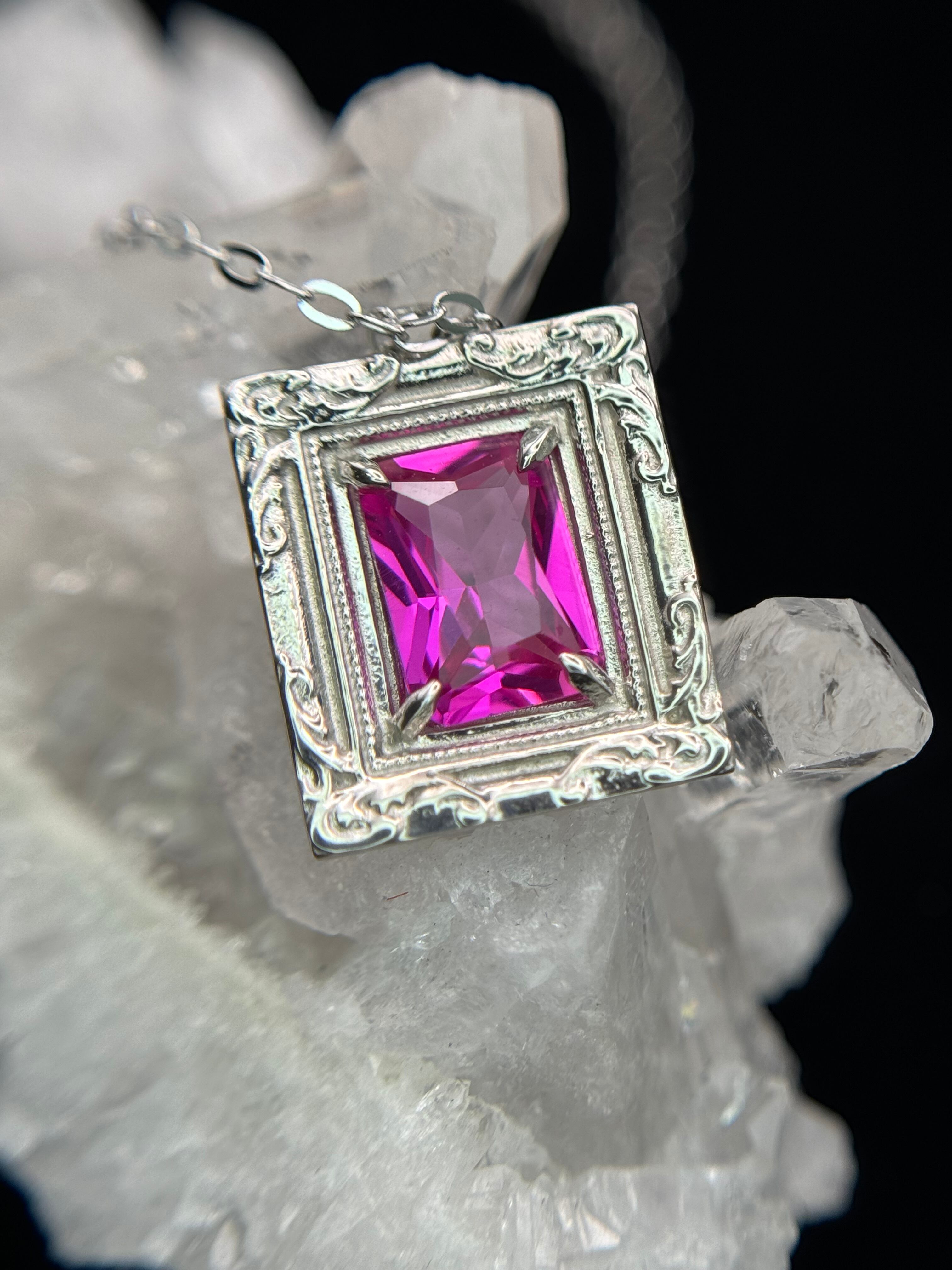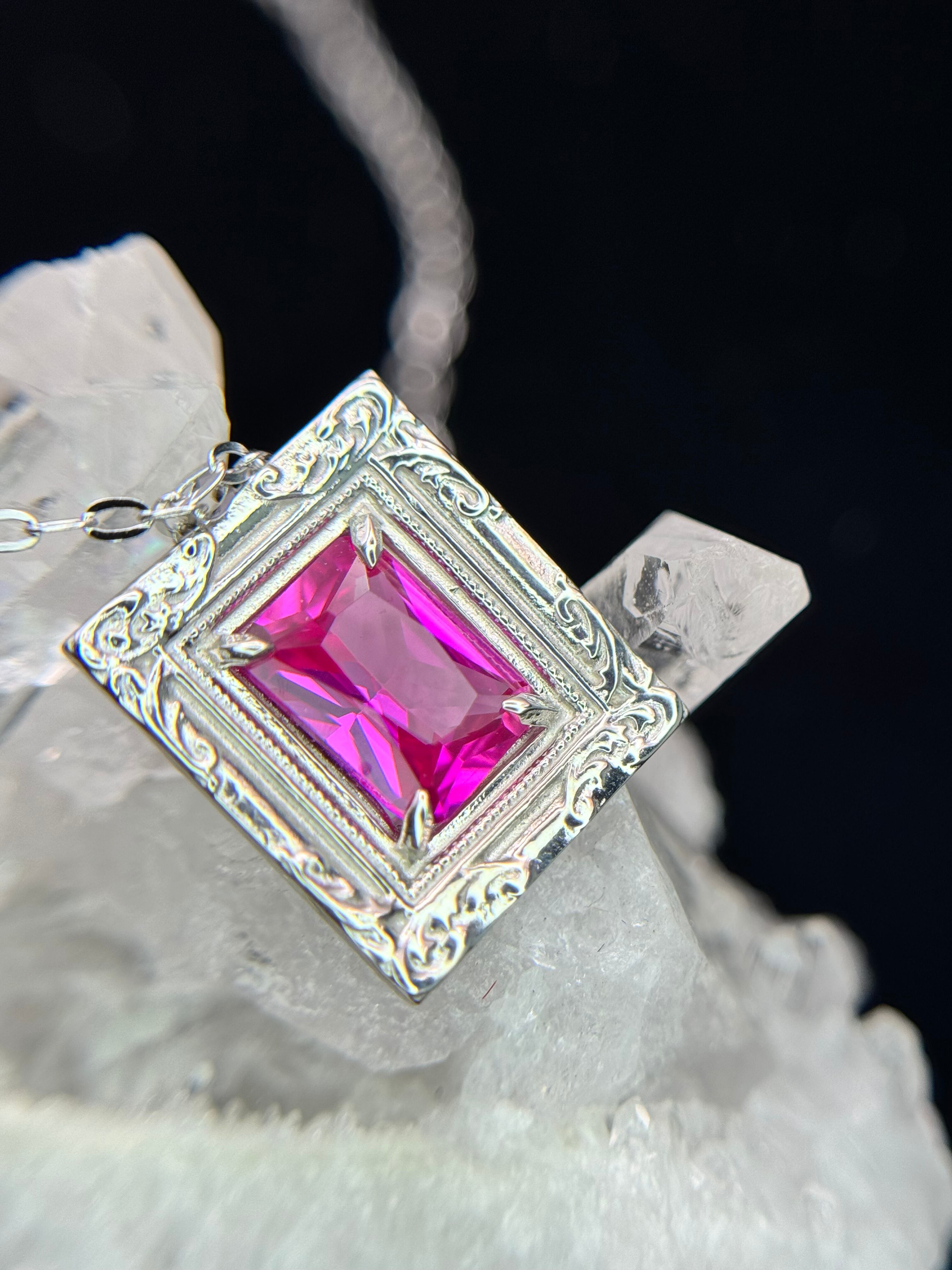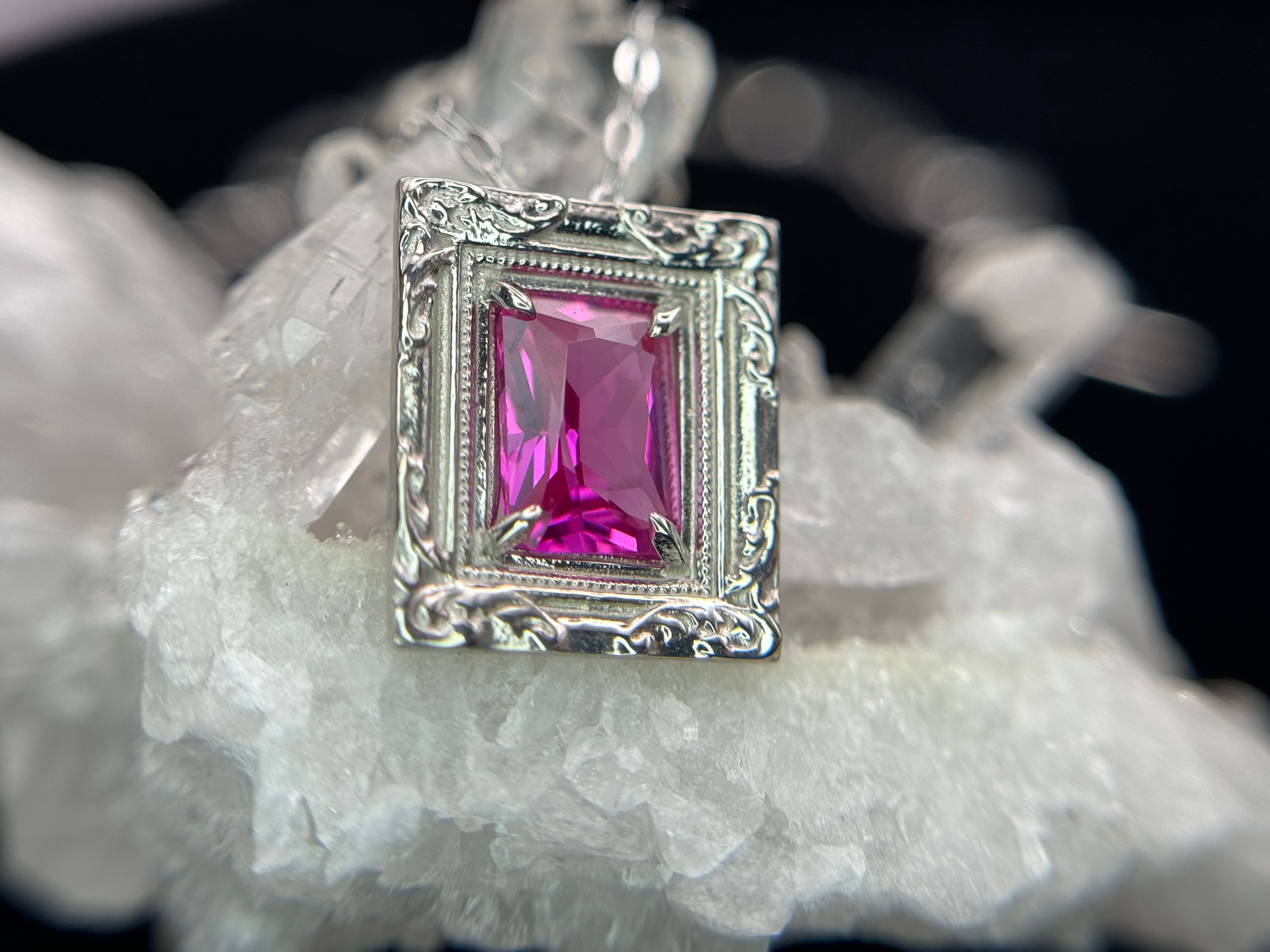 合成ピンクサファイアを絵画のように、美しい額縁の中へ納めました。