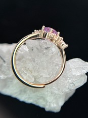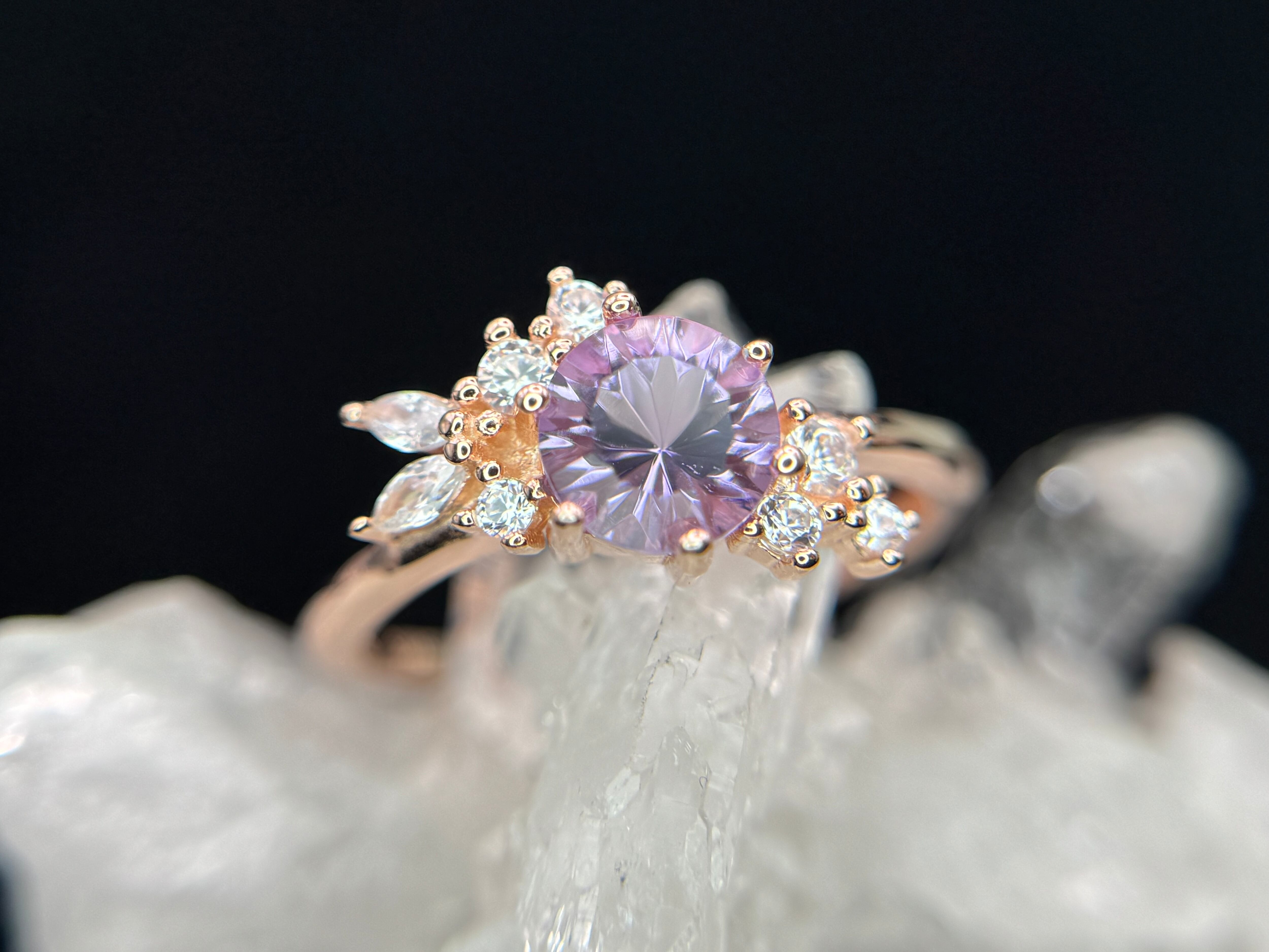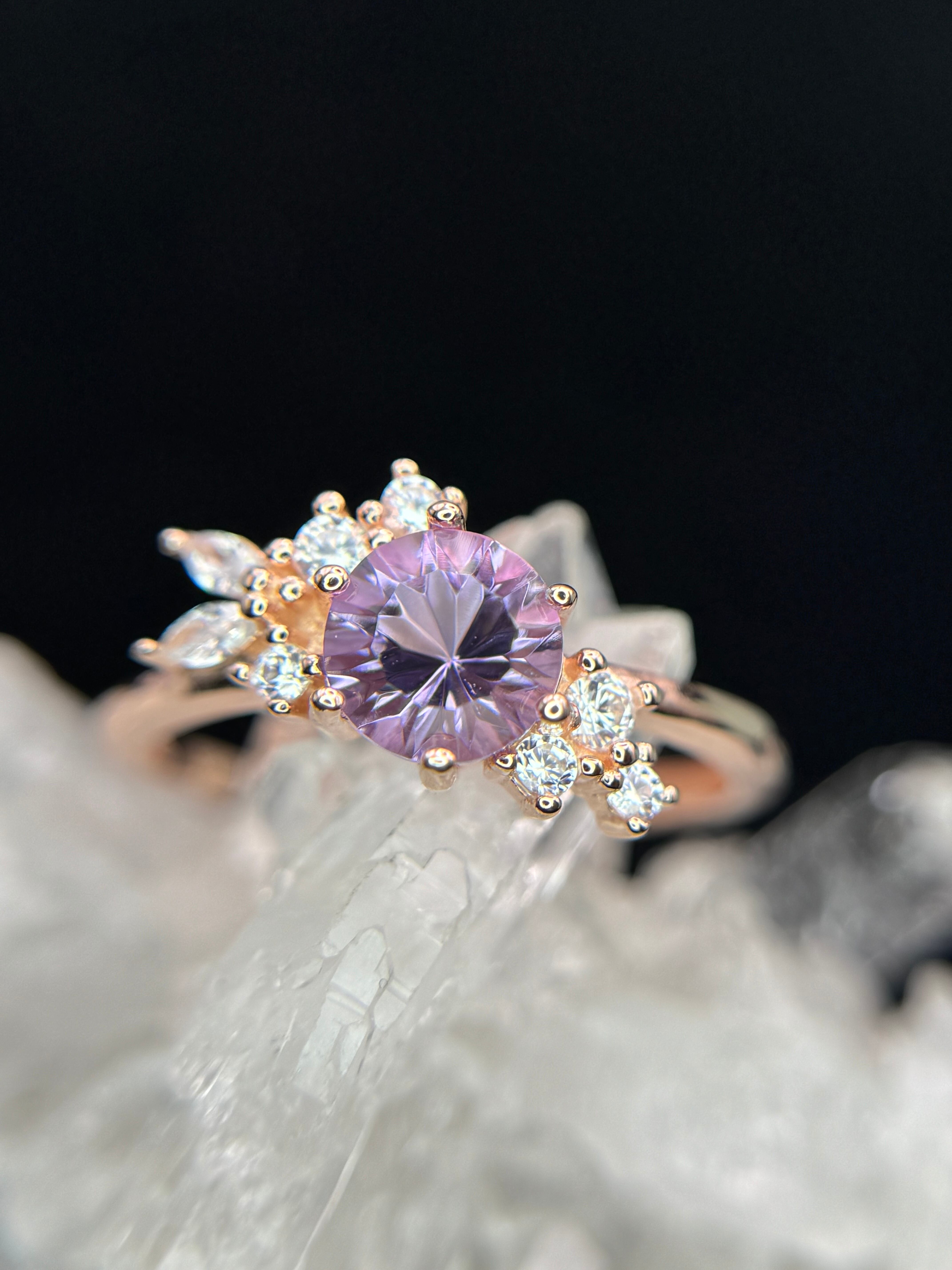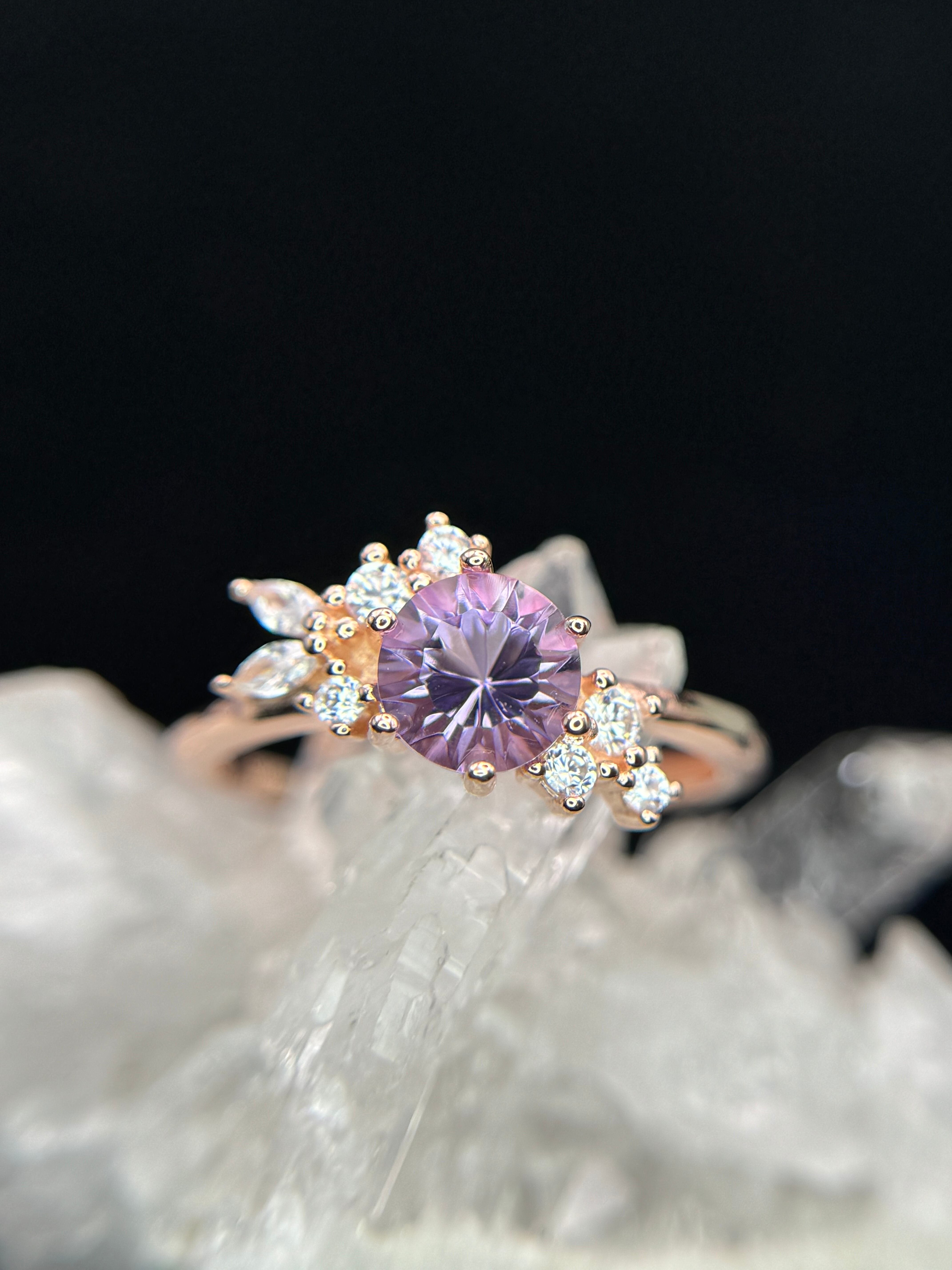 美しく包まれた花束のように並んだ小さなジルコニアたちが、美しくカットされたアメジストをさらに輝かせる繊細なリングです。