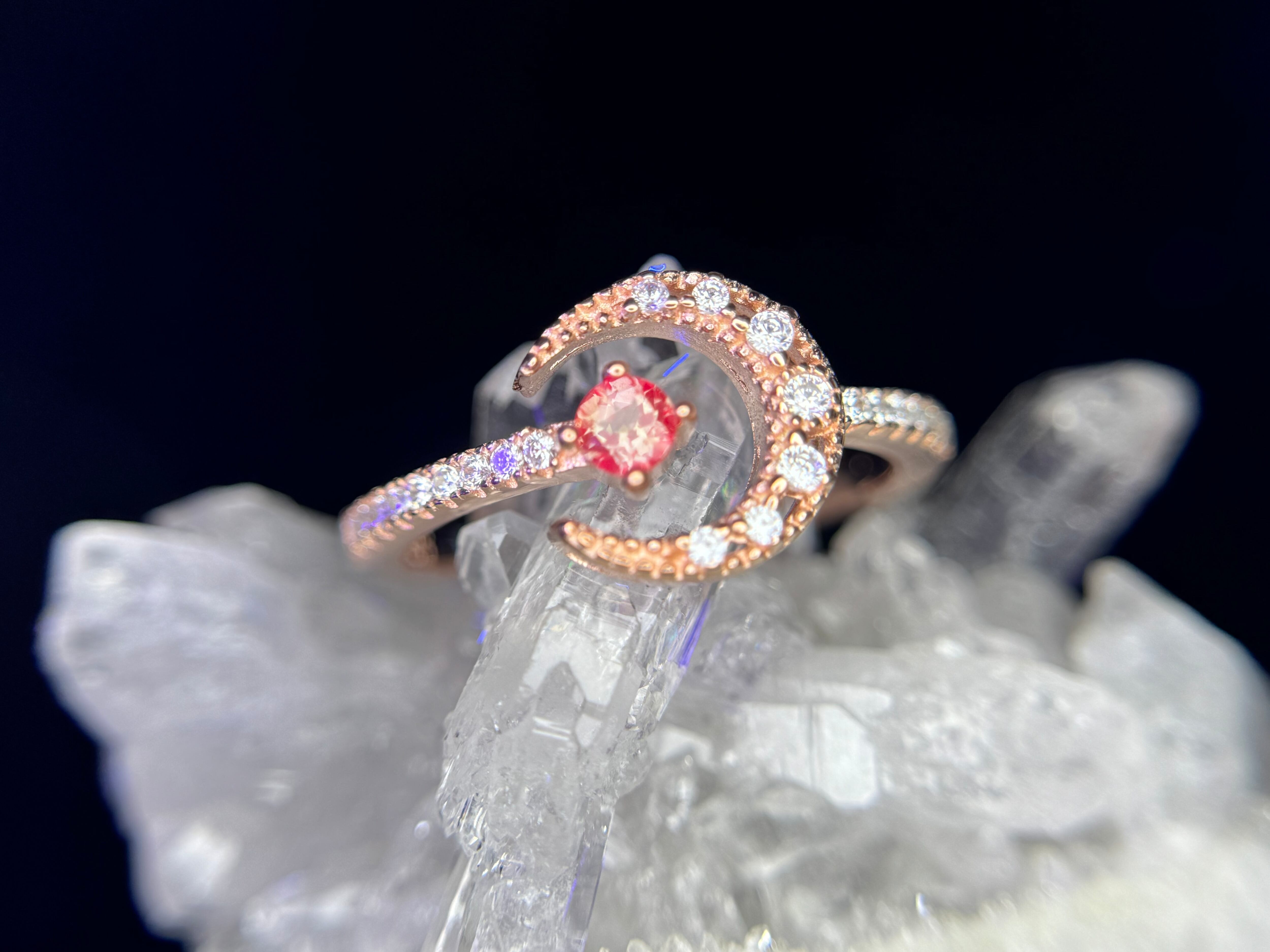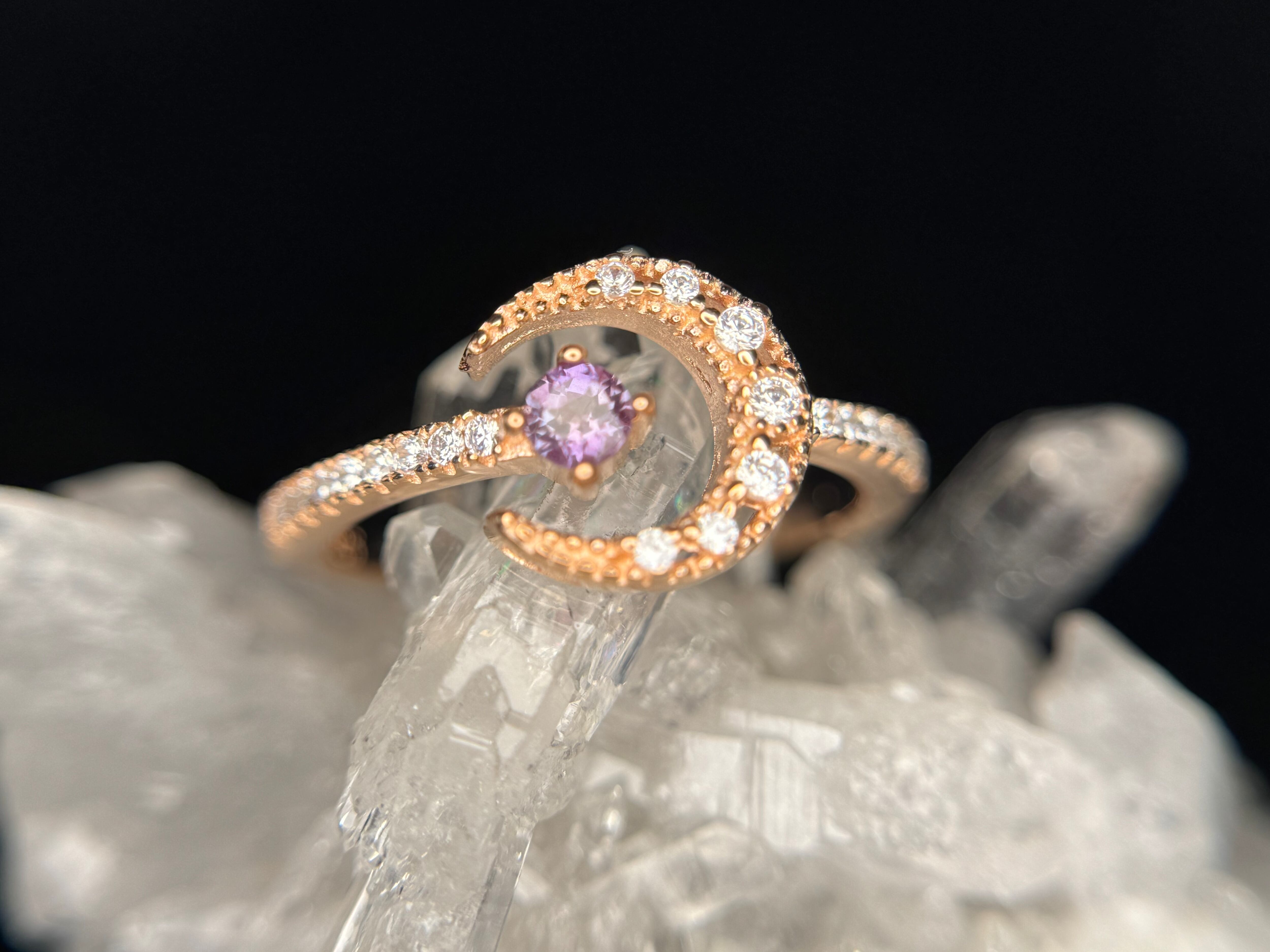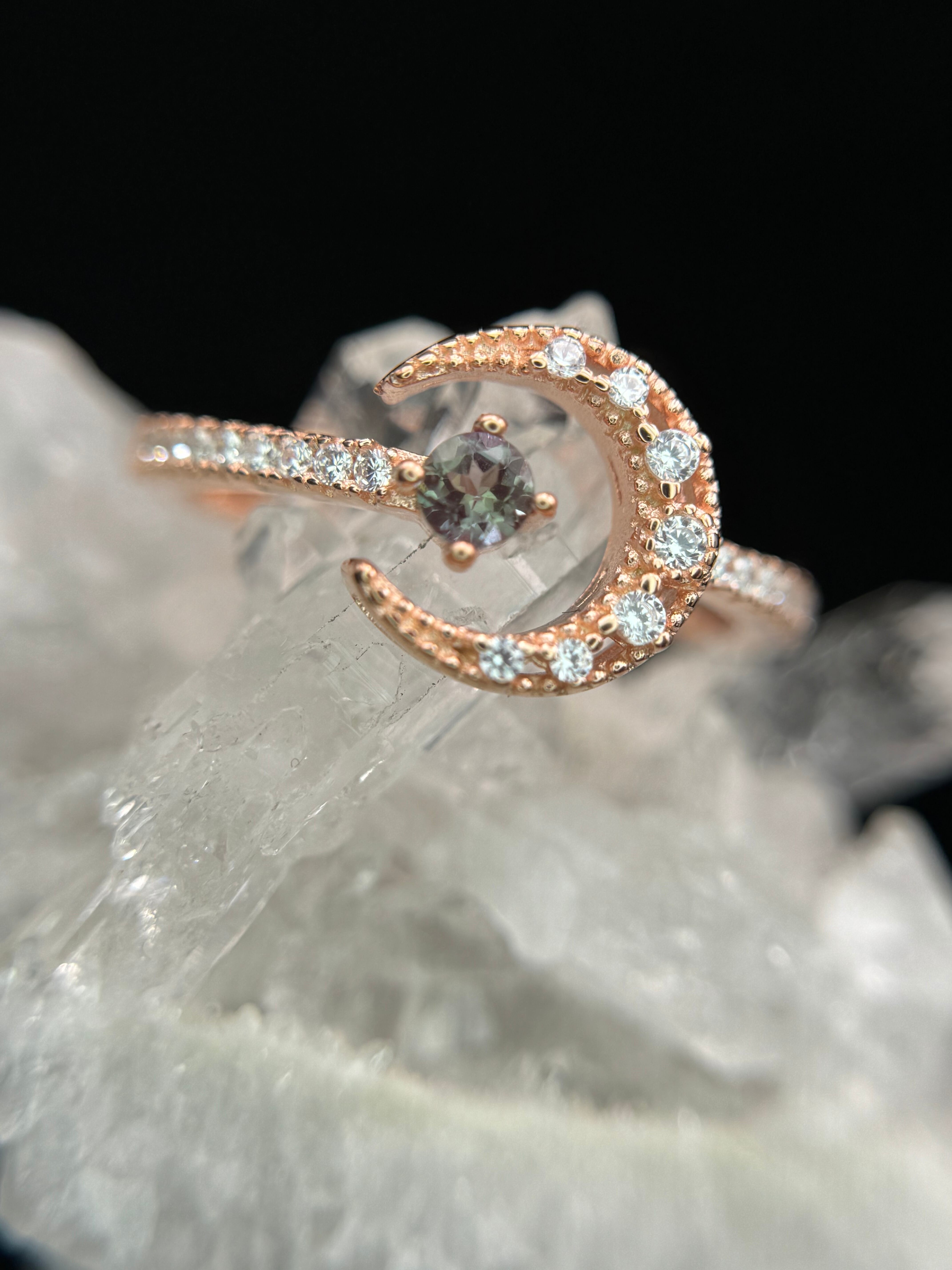 キラキラ煌めく三日月の真ん中には、美しい合成アレキサンドライトが輝きます。