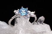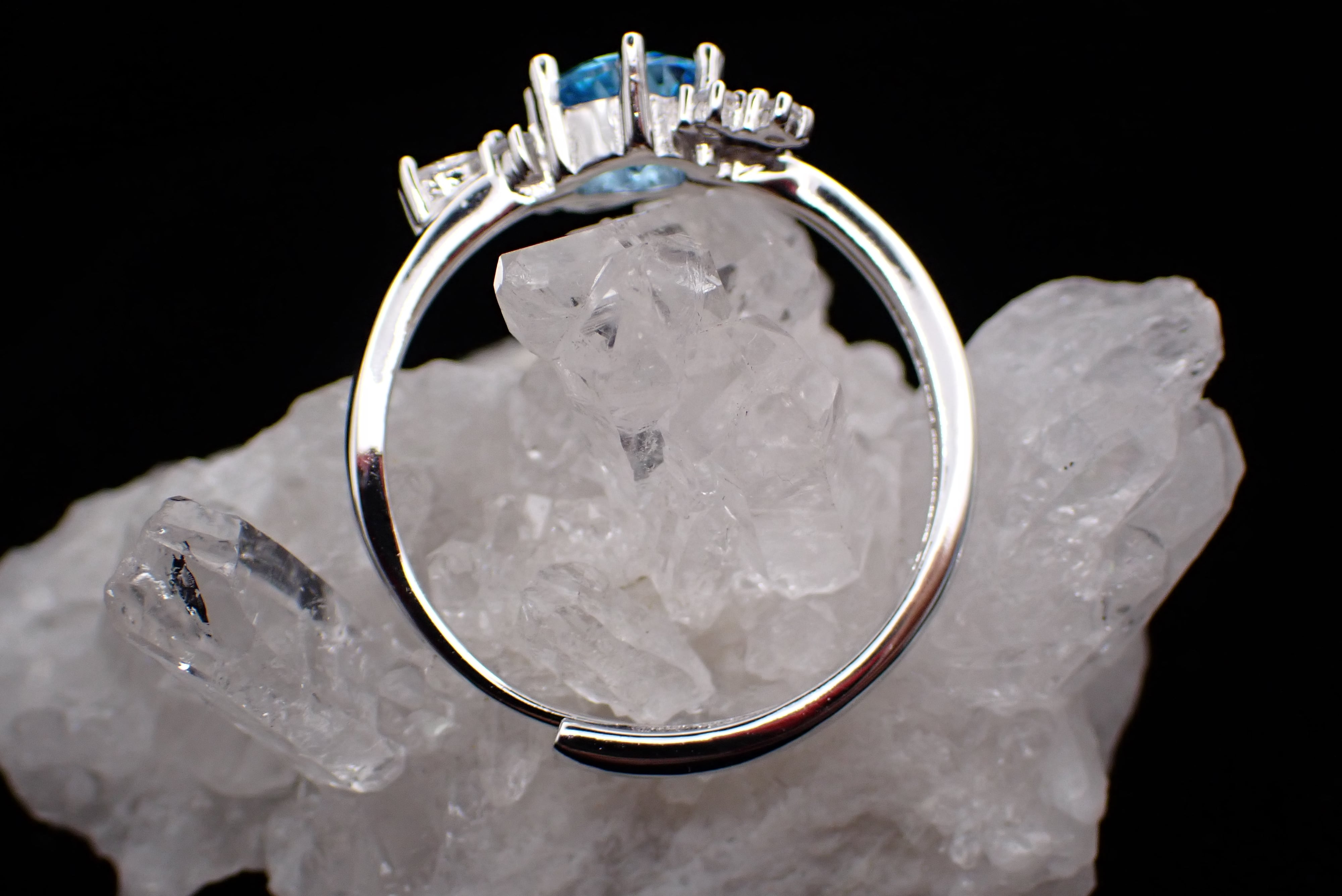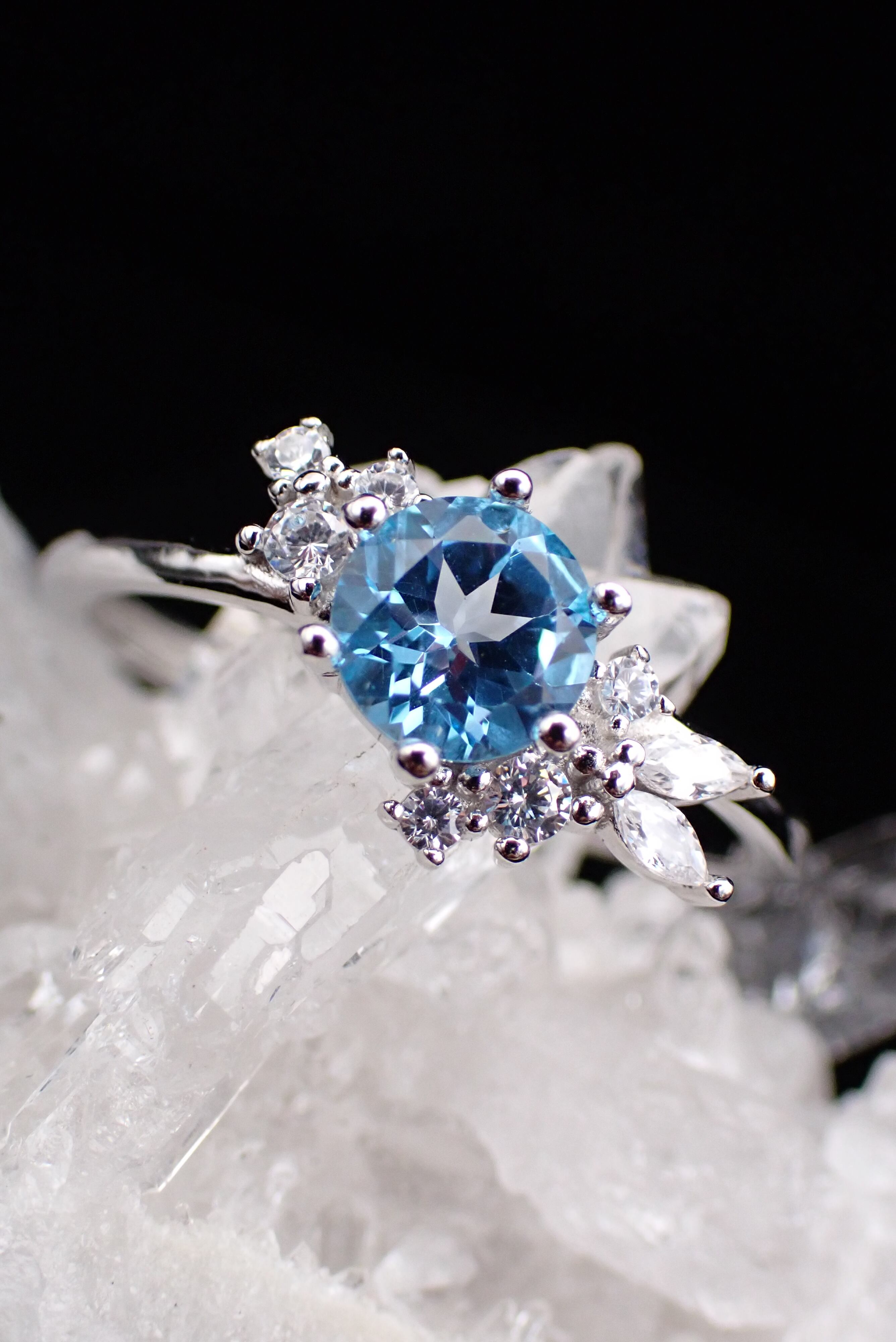 美しく包まれた花束のように並んだ小さなジルコニアたちが、美しくカットされたブルートパーズをさらに輝かせる繊細なリングです。
