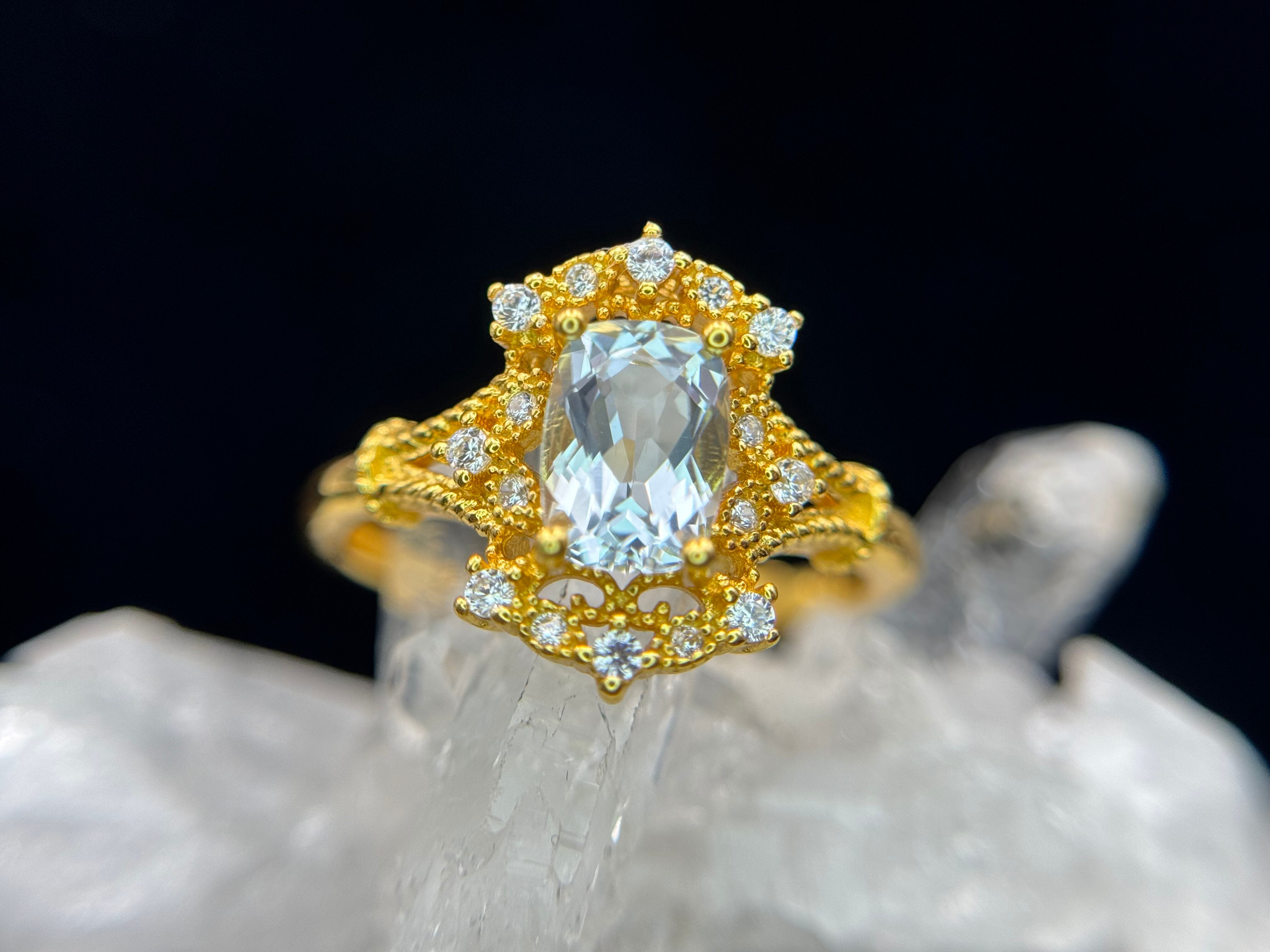 取り巻きのジルコニアたちがキラキラと輝き、アクアマリンの美しい輝きを引き立てます。