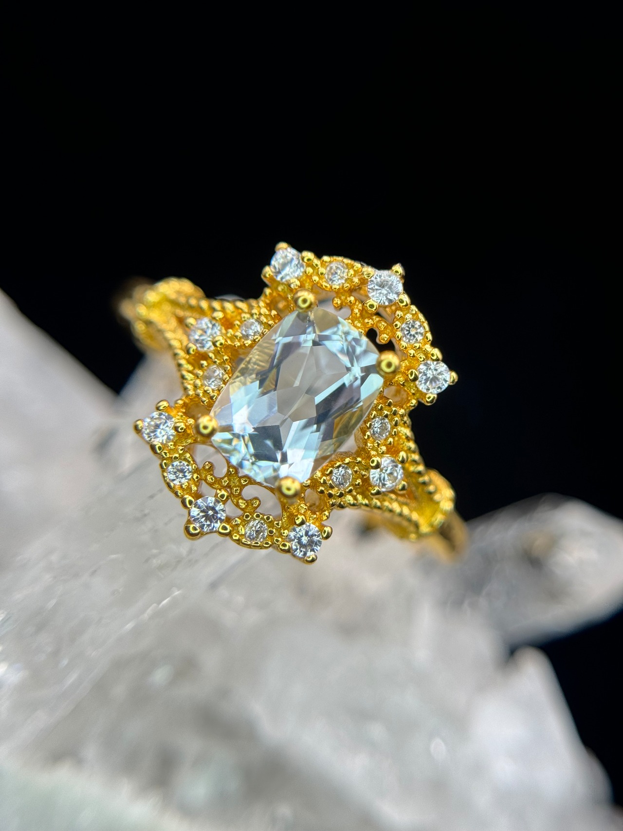 白雪姫に登場する魔法の鏡のようなデザインに、やわらかながら水のように煌めくアクアマリンが輝く神秘的なリングです。