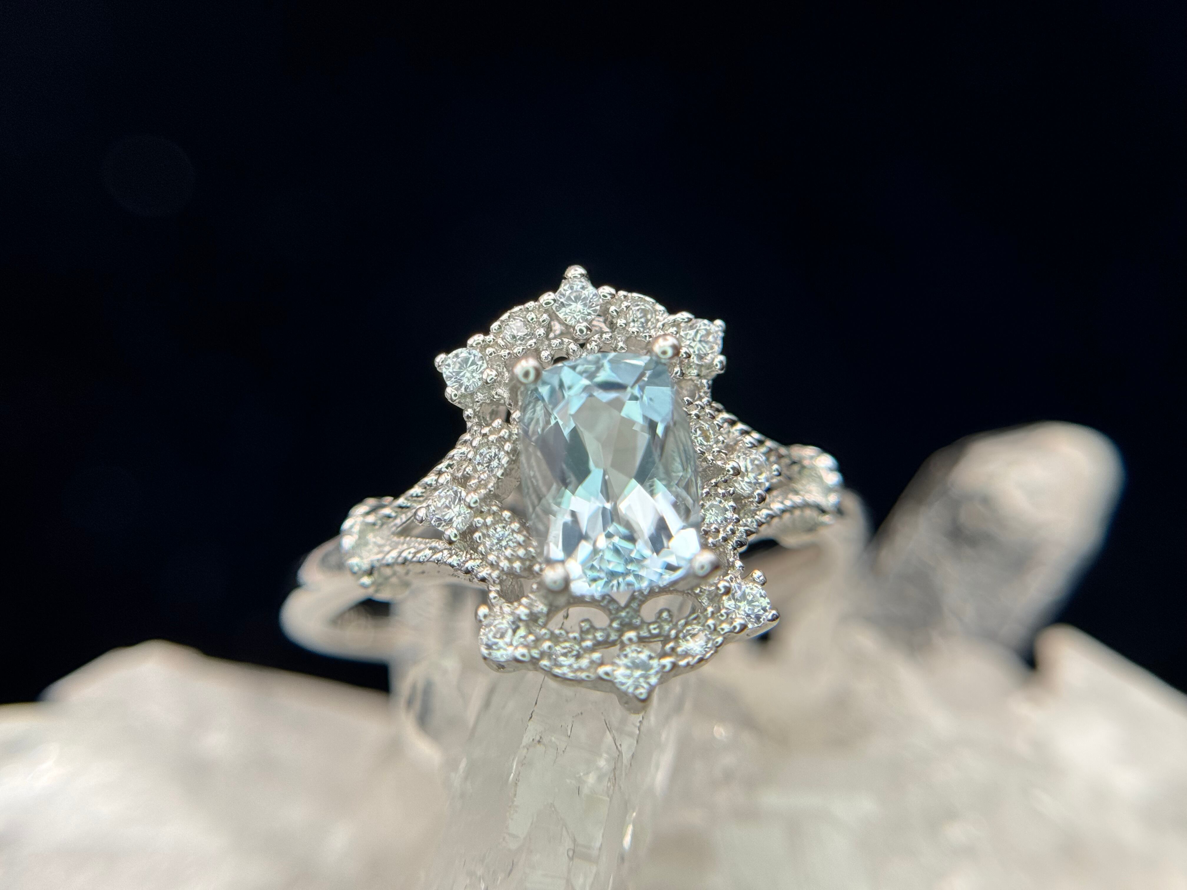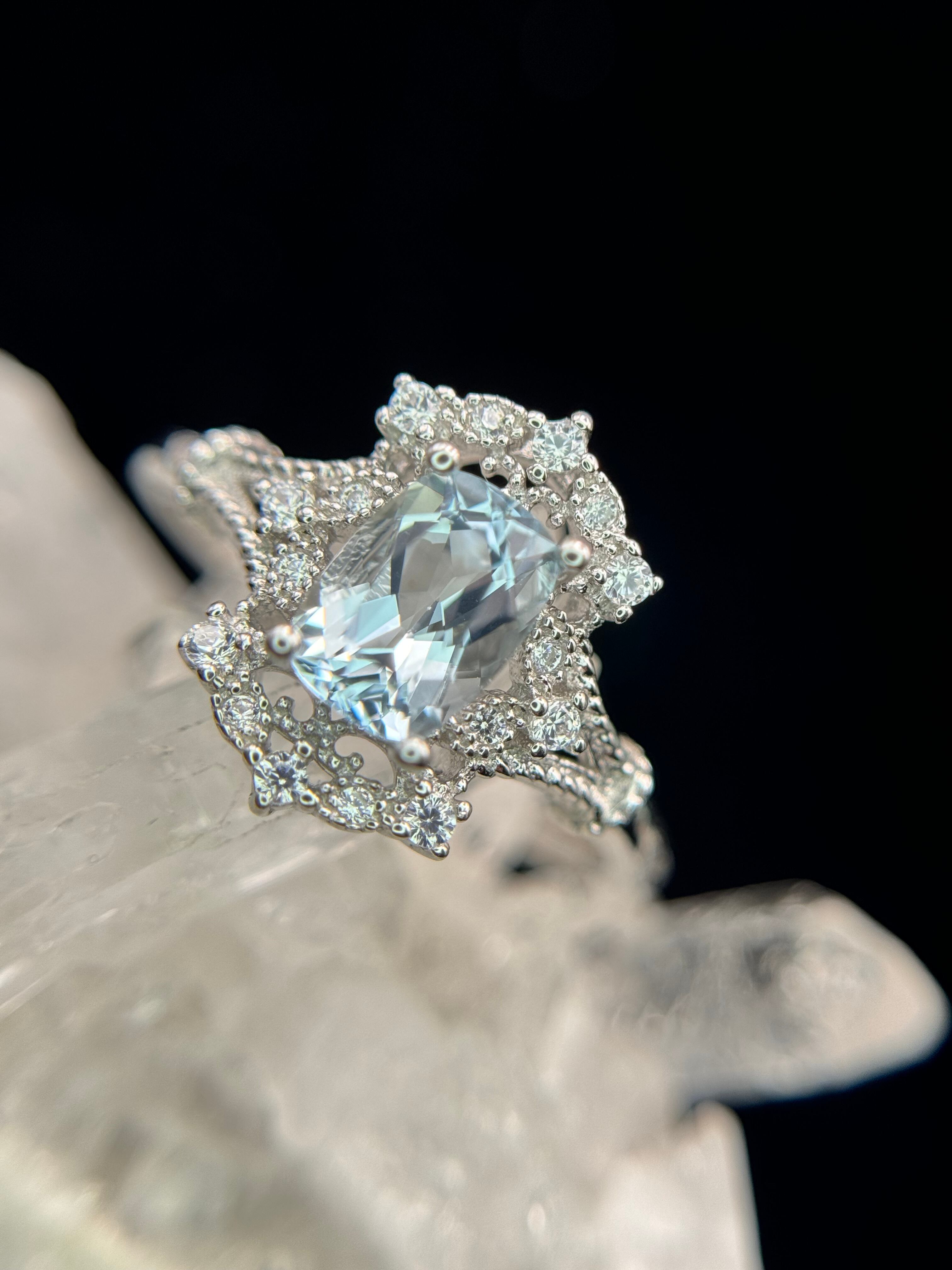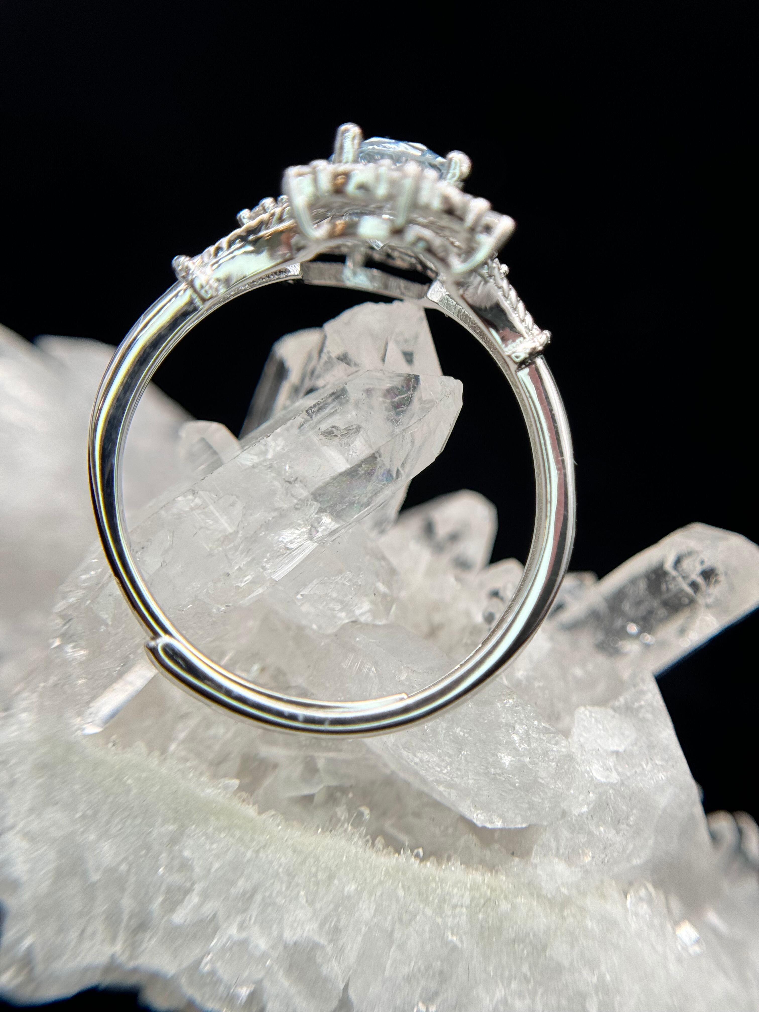 取り巻きのジルコニアたちがキラキラと輝き、アクアマリンの美しい輝きを引き立てます。