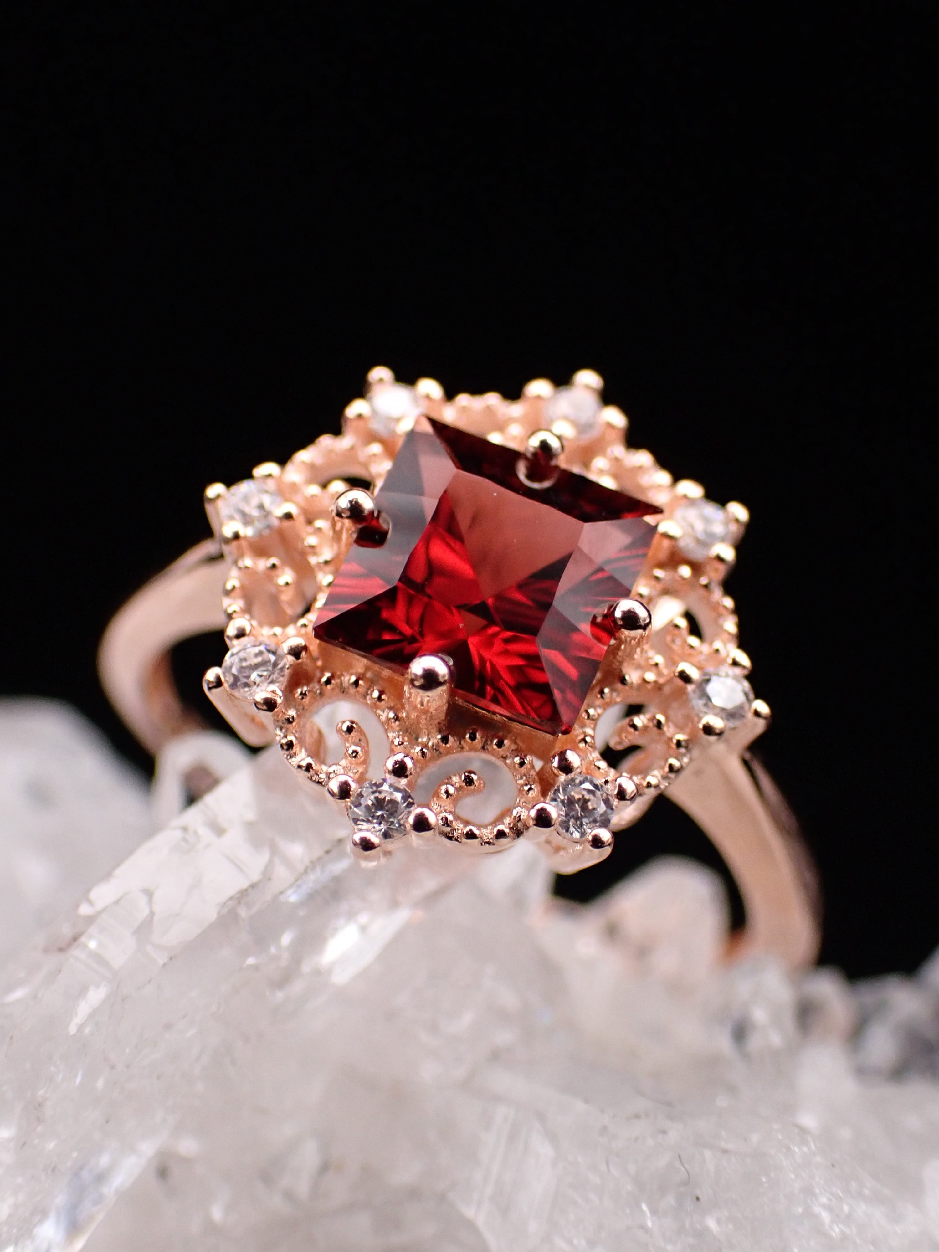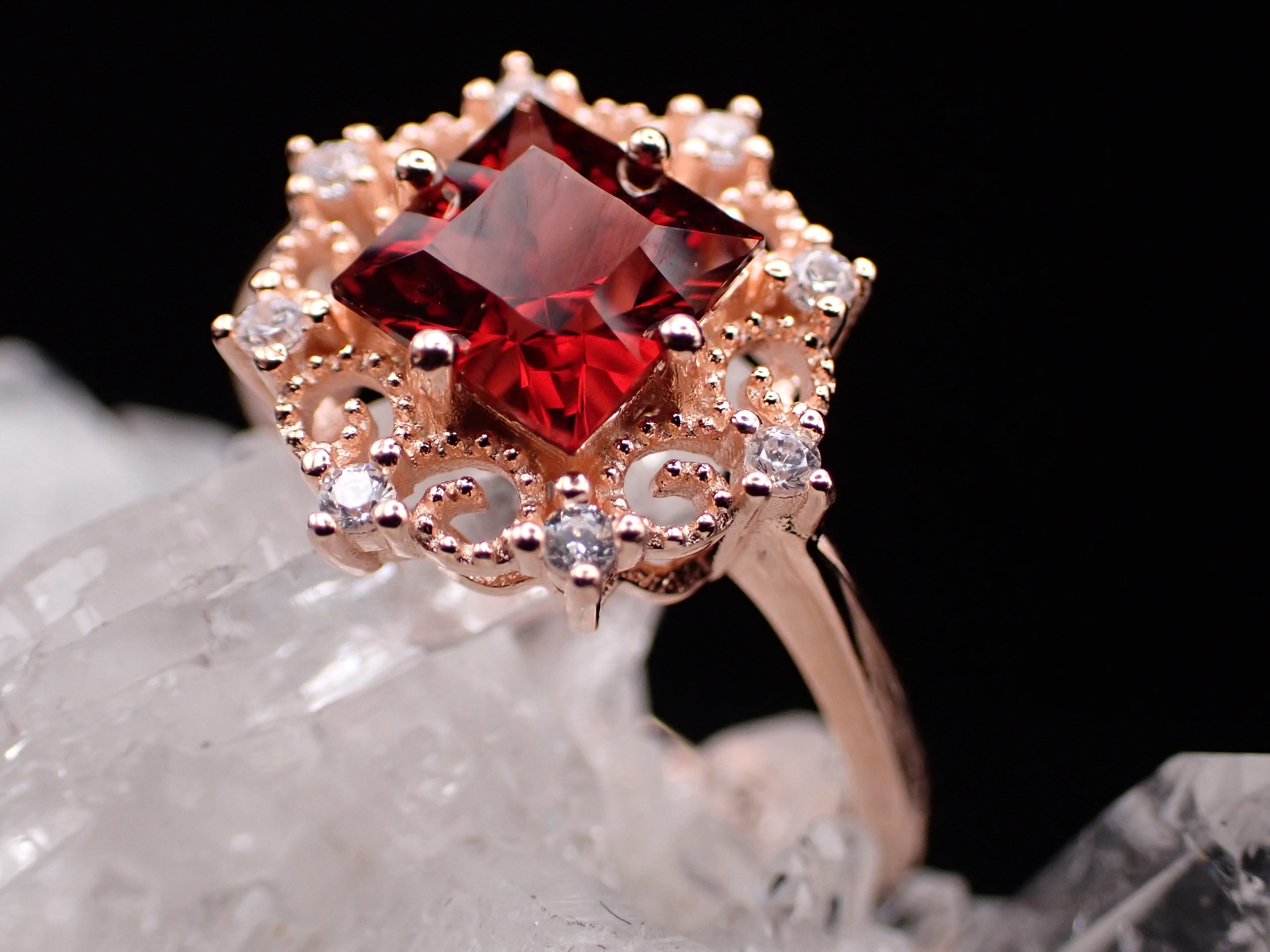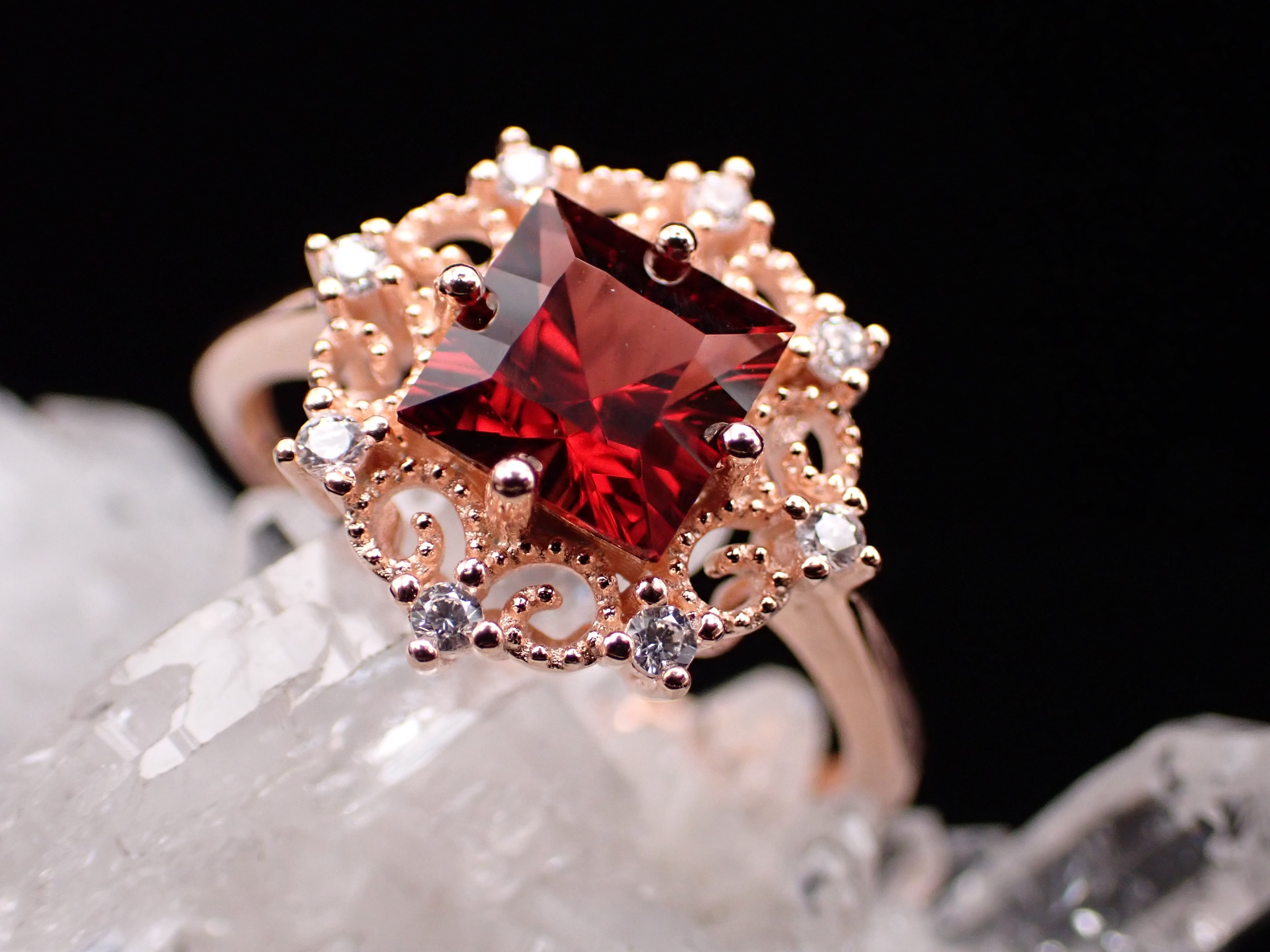 真っ赤なガーネットが中央に輝く雪の結晶のリングです。