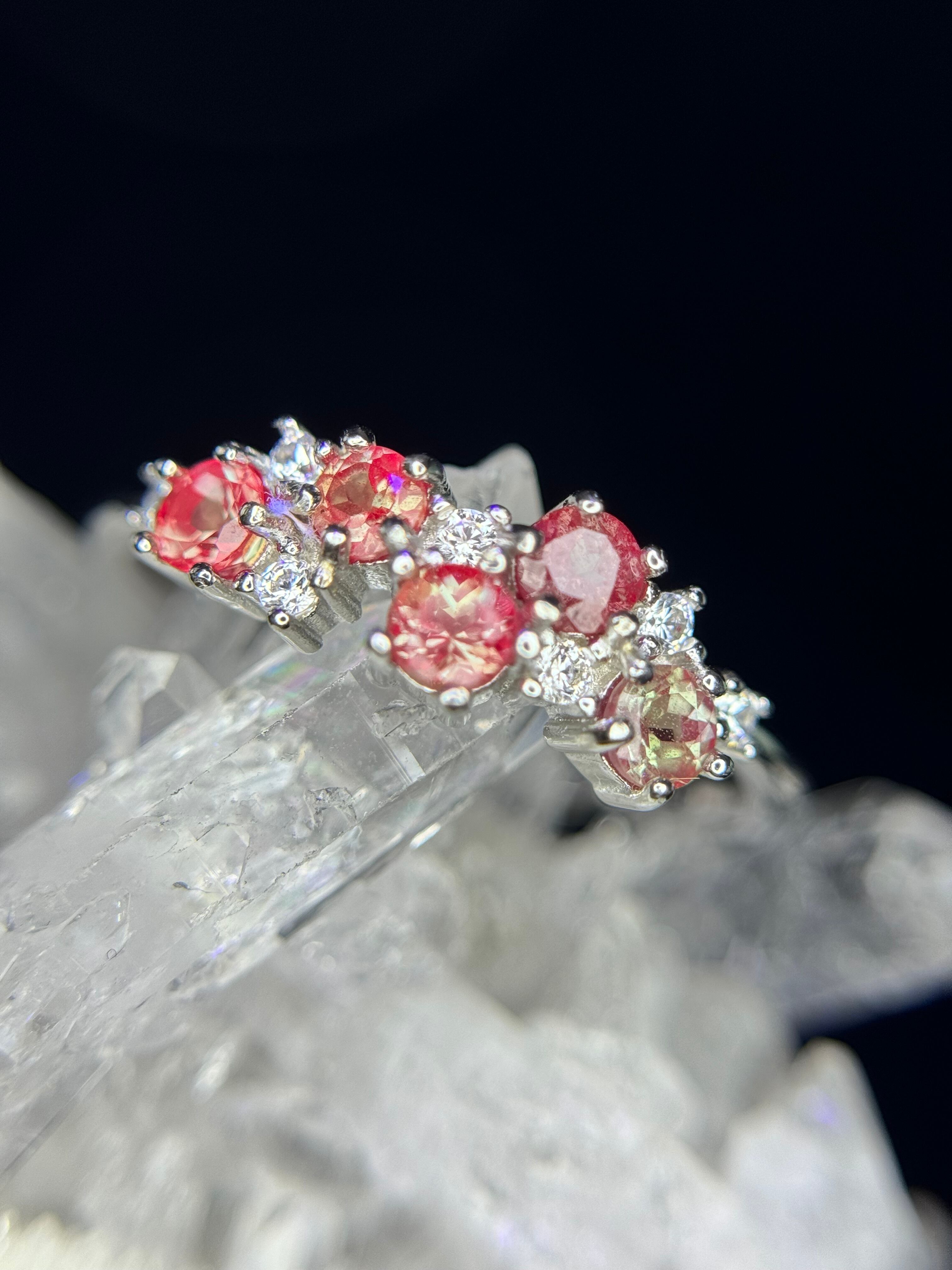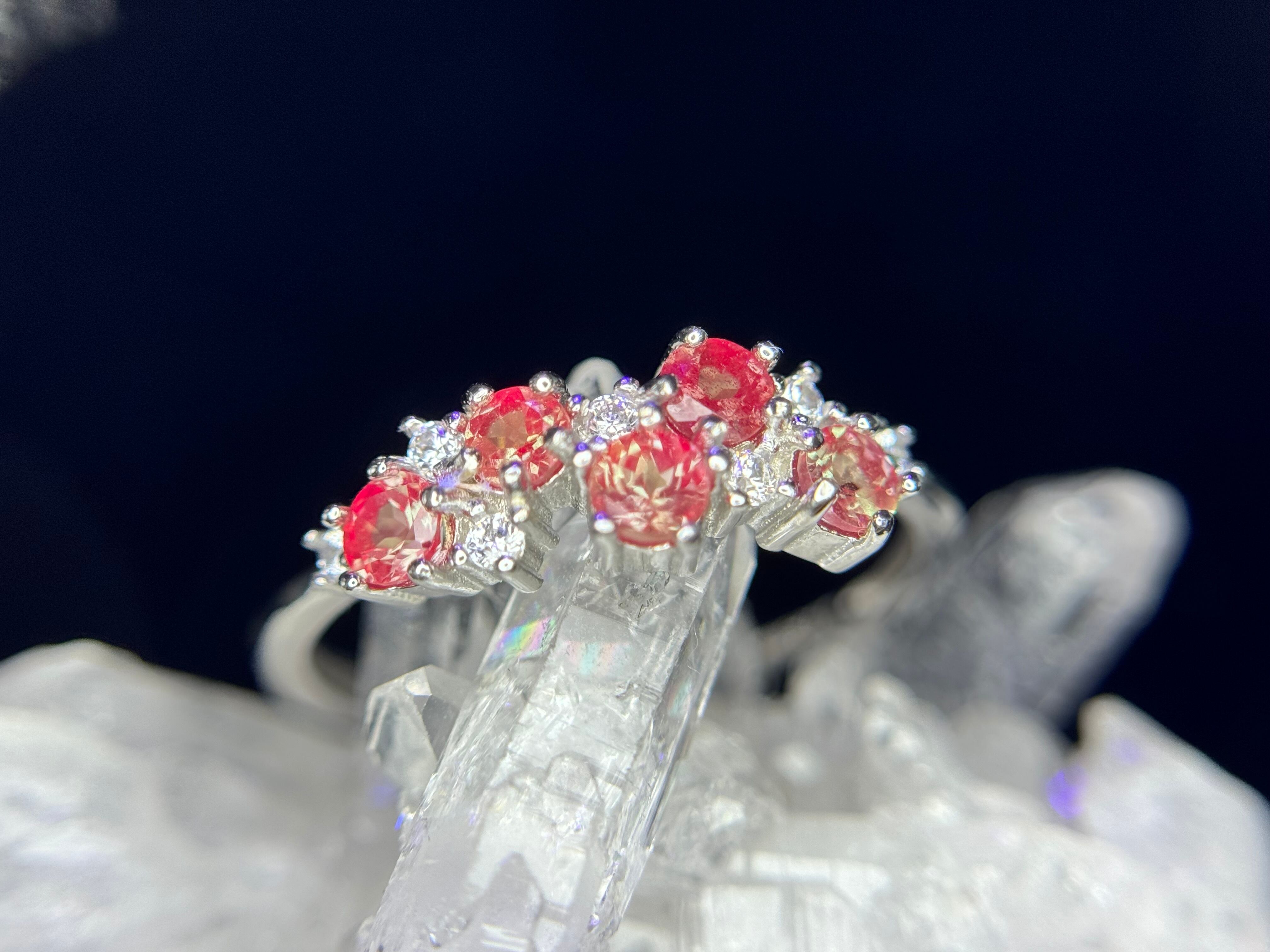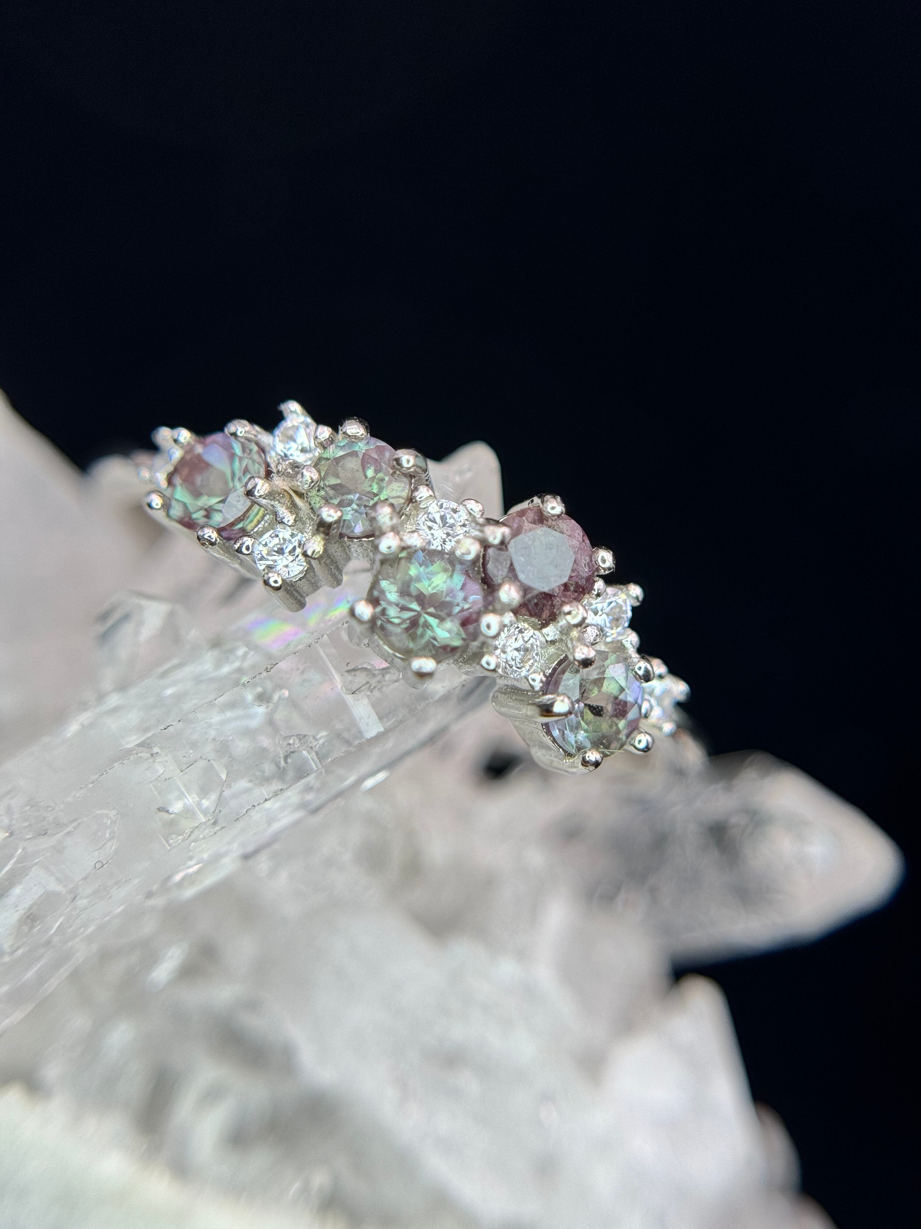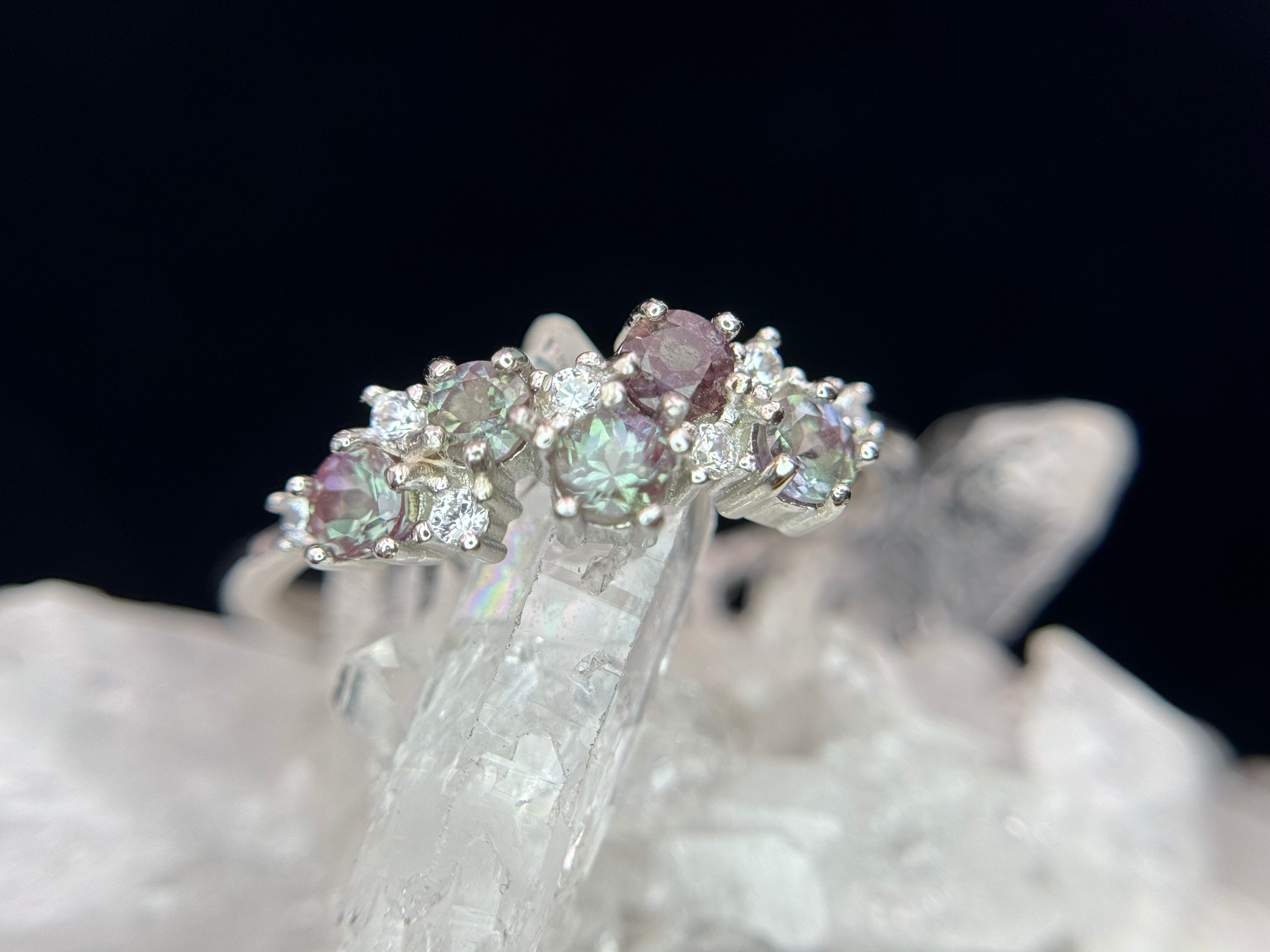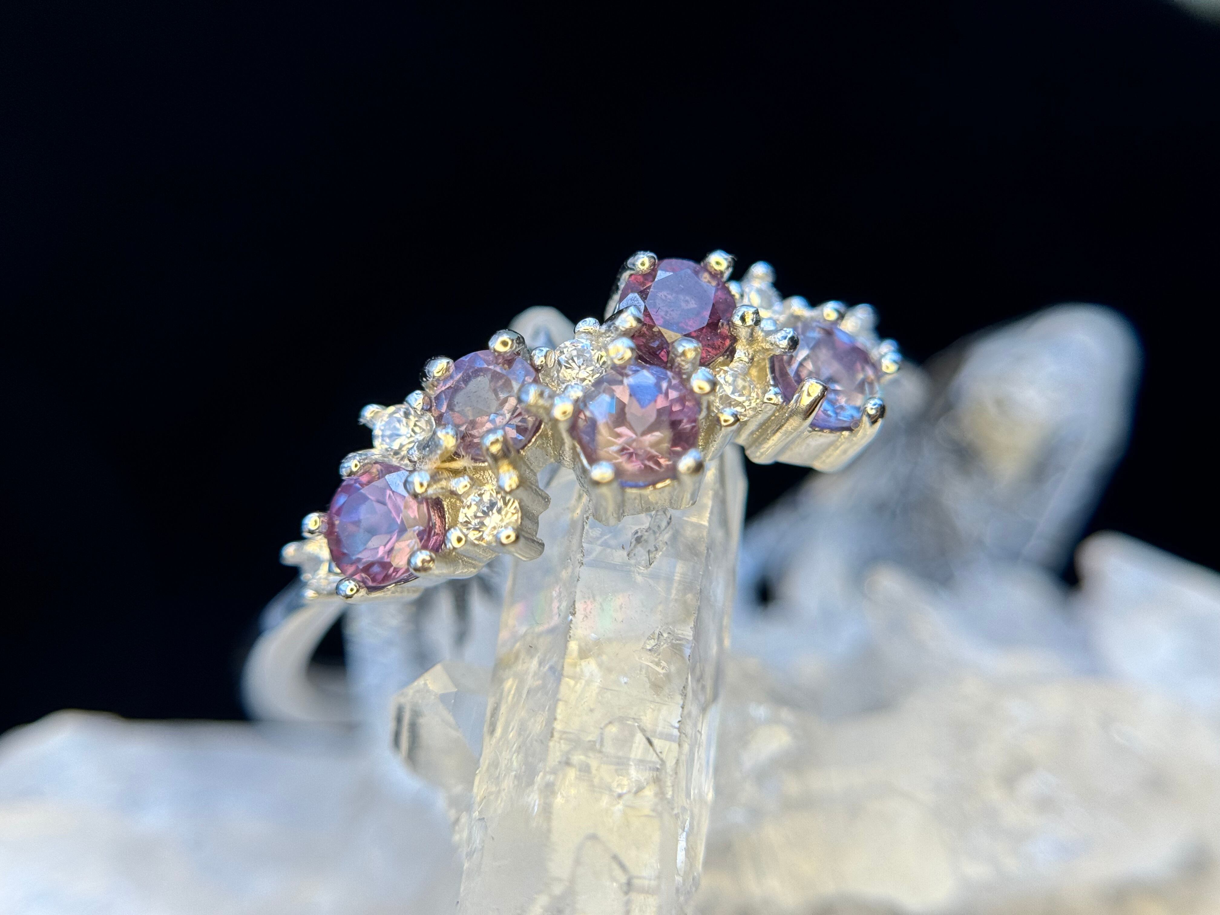 花かんむりのように配置された合成アレキサンドライトたちが並んで咲いています。