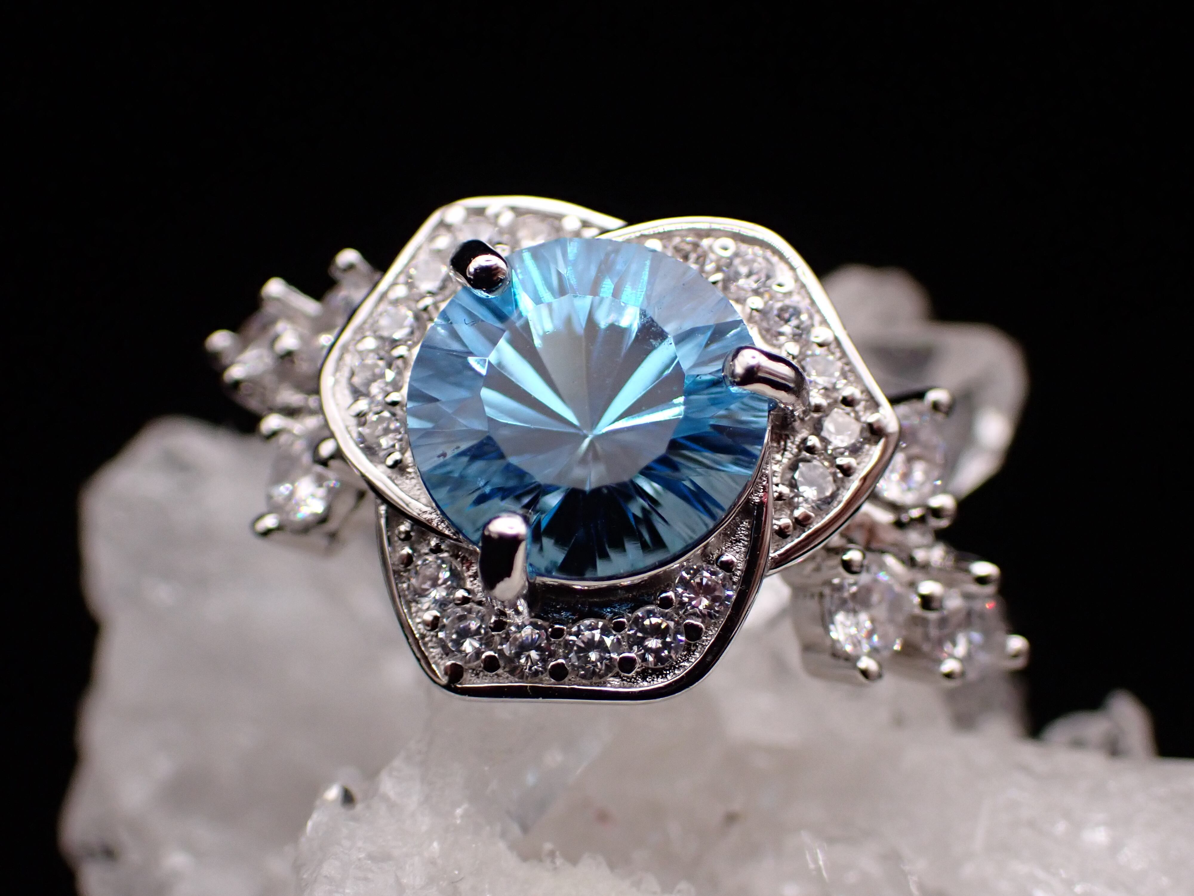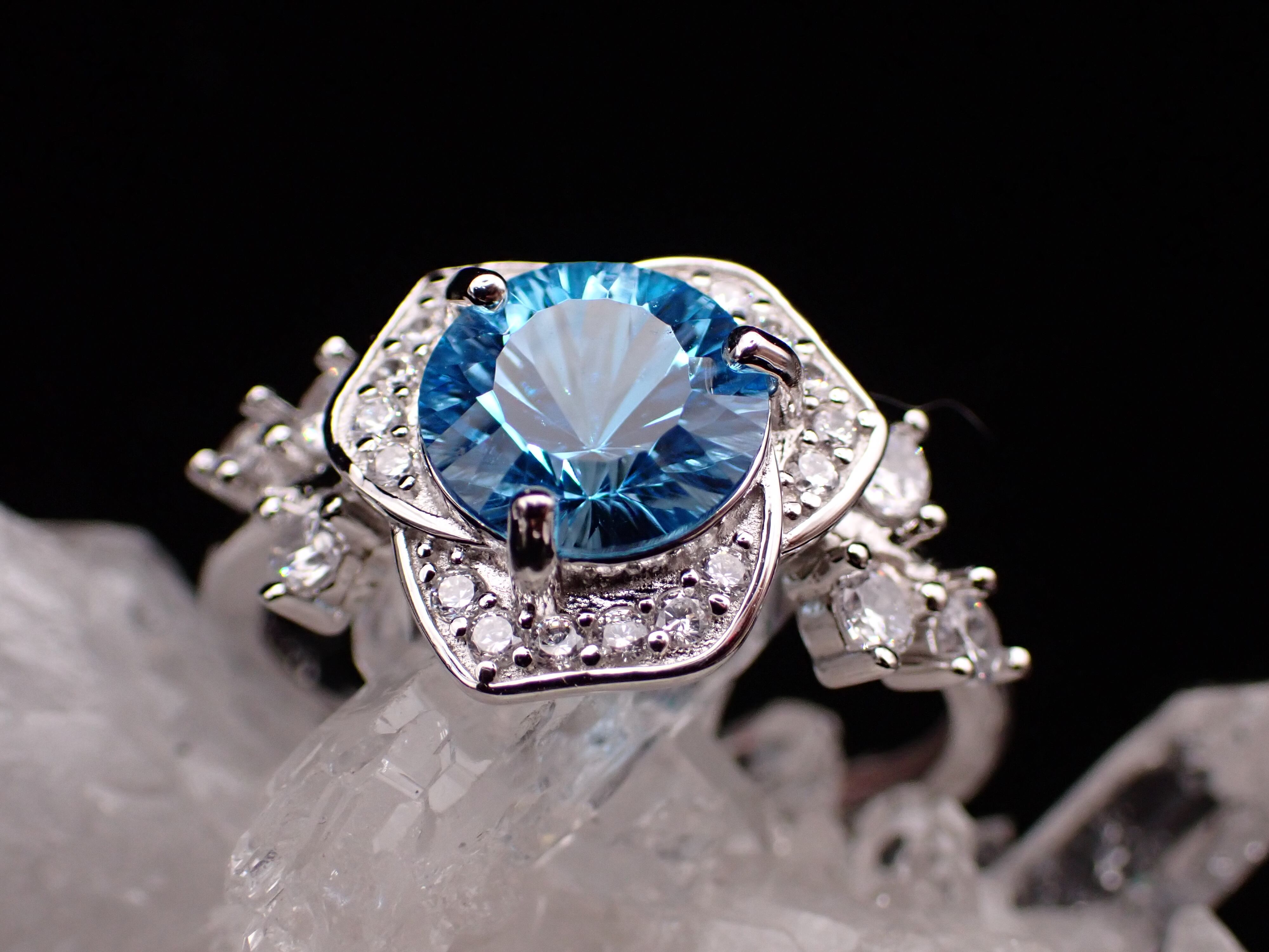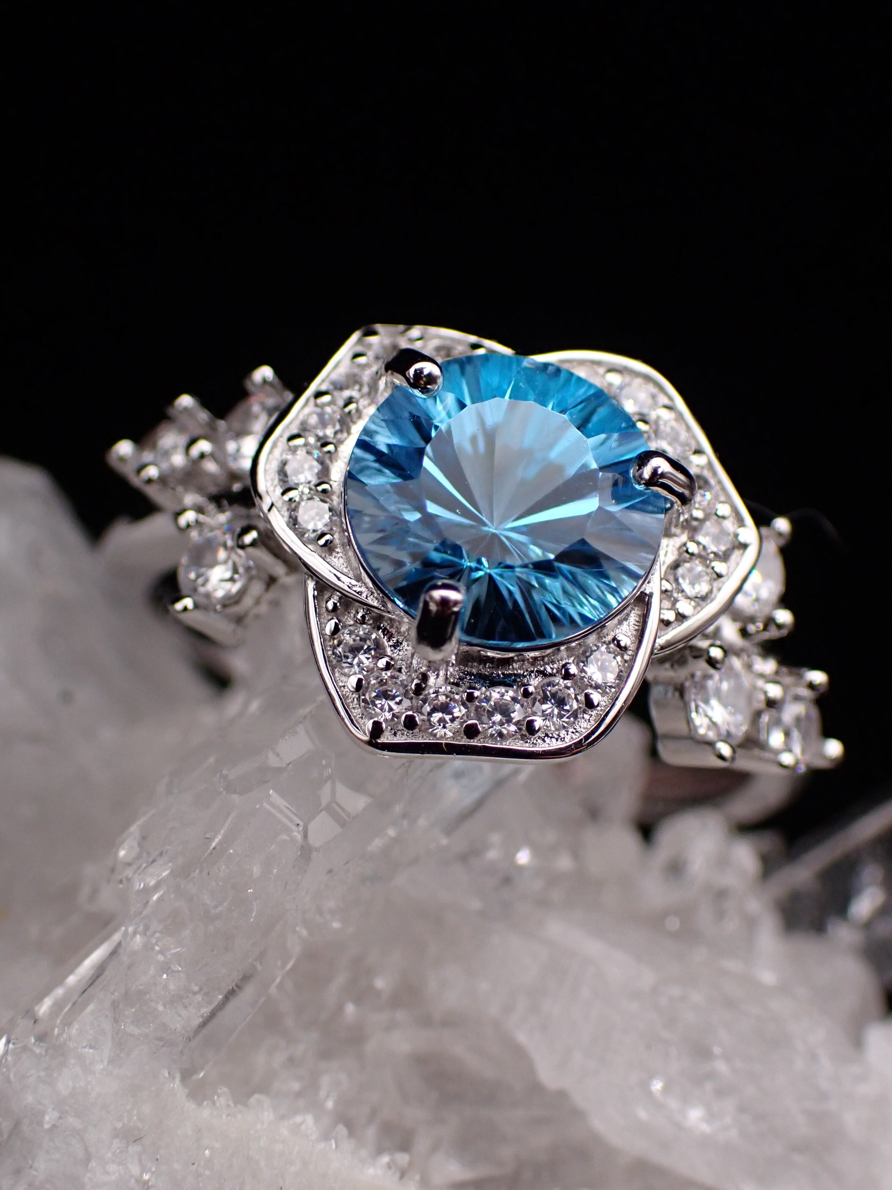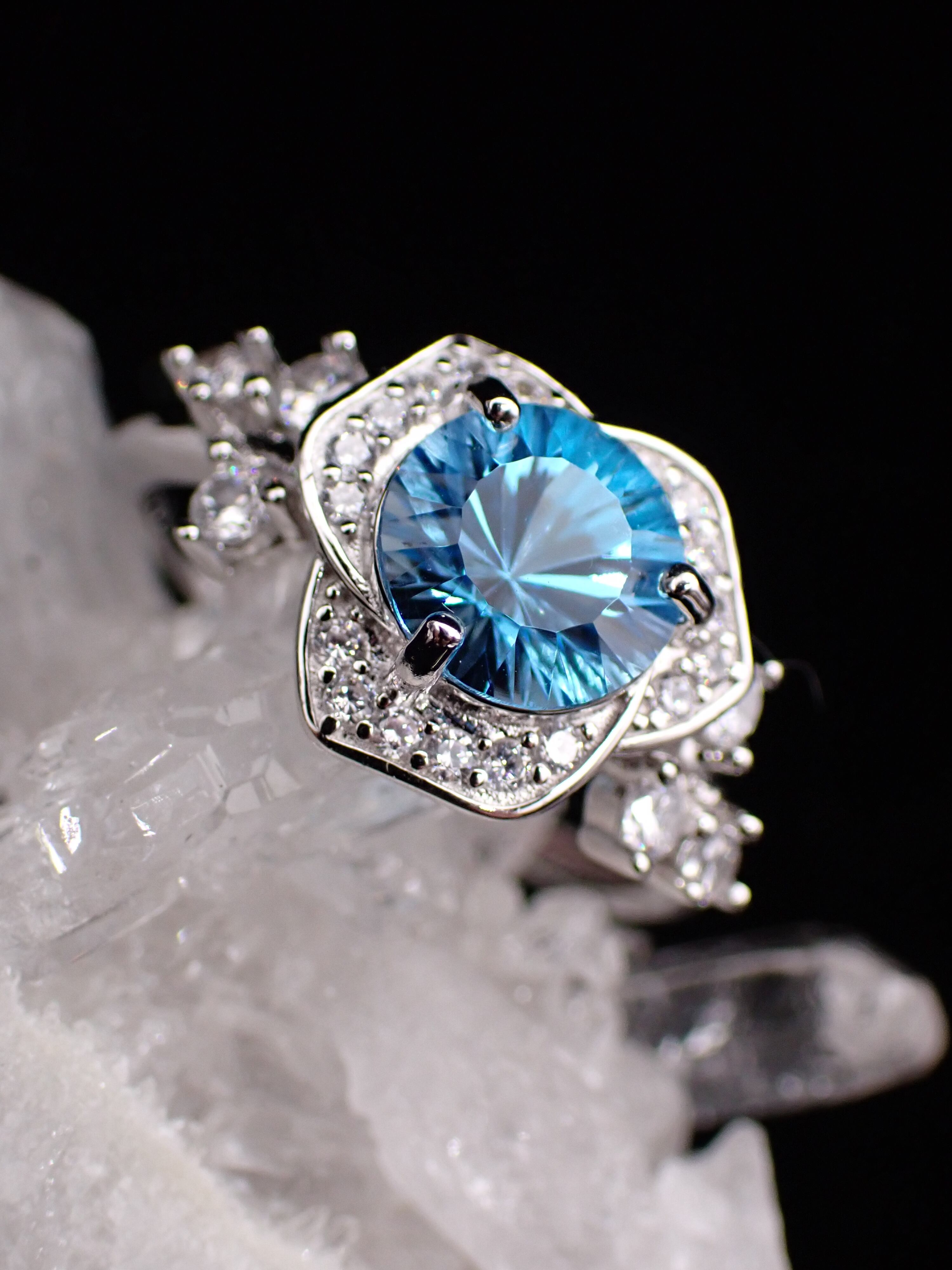 ジルコニアの中に8mmの美しいコンケーブカットのブルートパーズが豪華に輝きます。