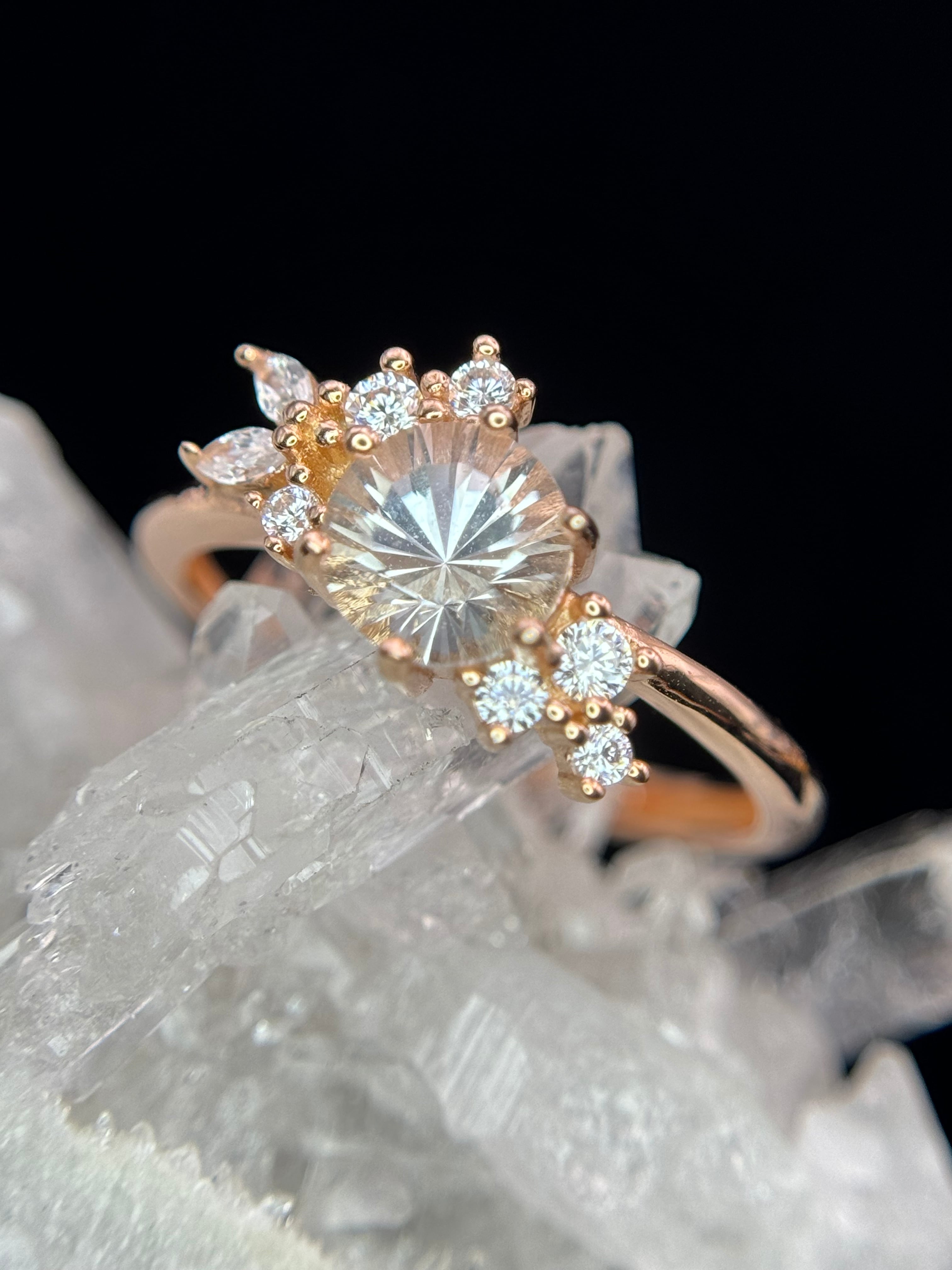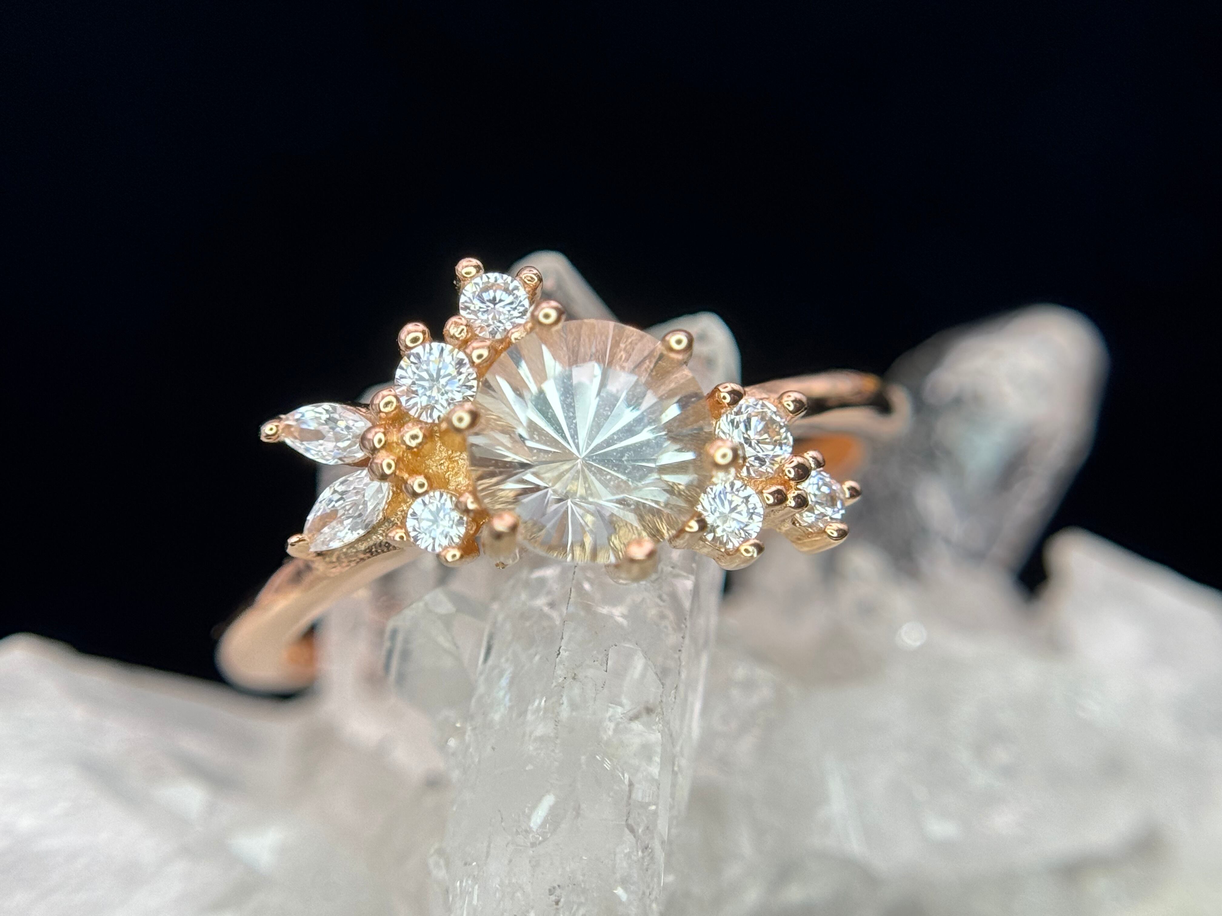 美しく包まれた花束のように並んだ小さなジルコニアたちが、澄んだホワイトトパーズをさらに輝かせる繊細なリングです。