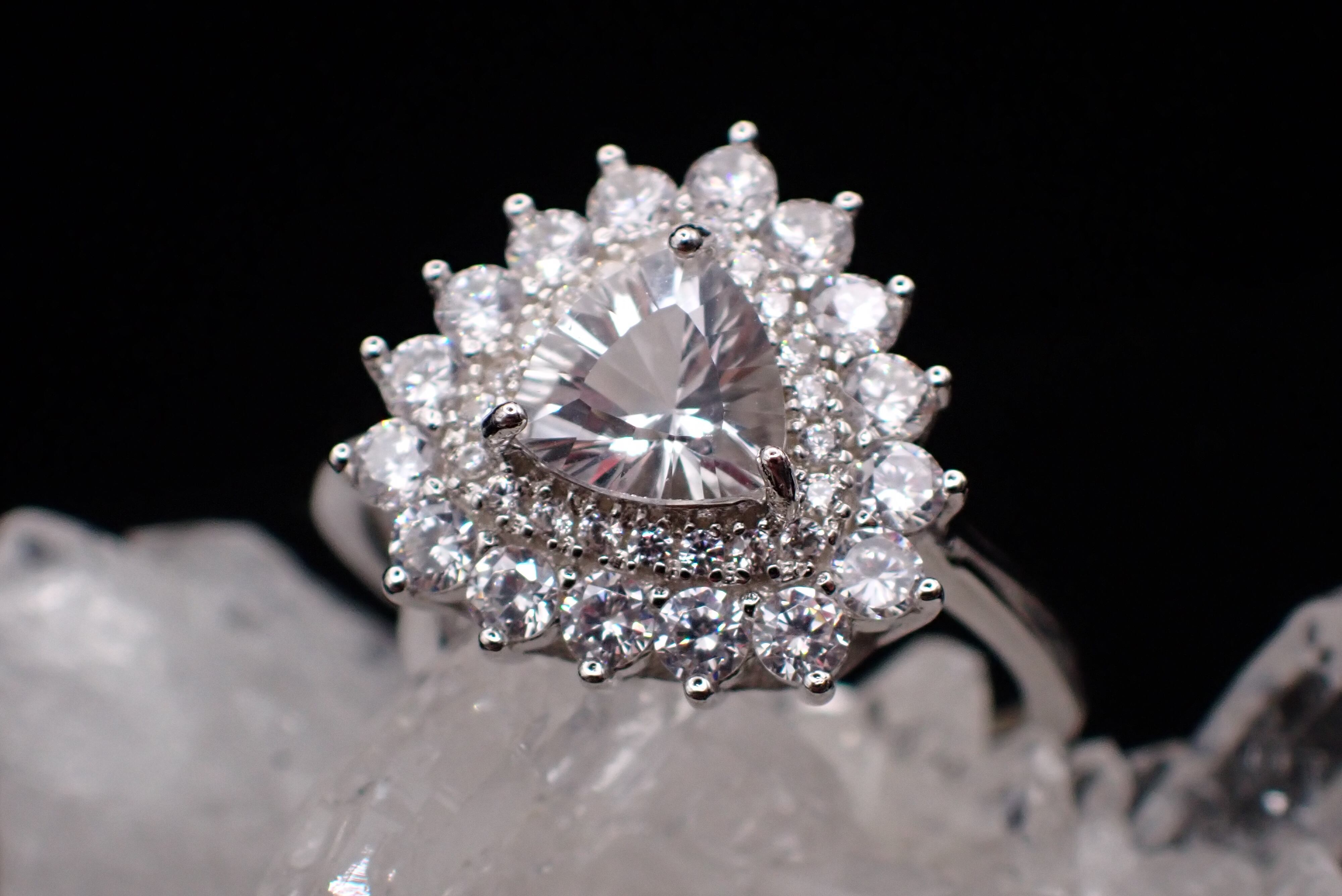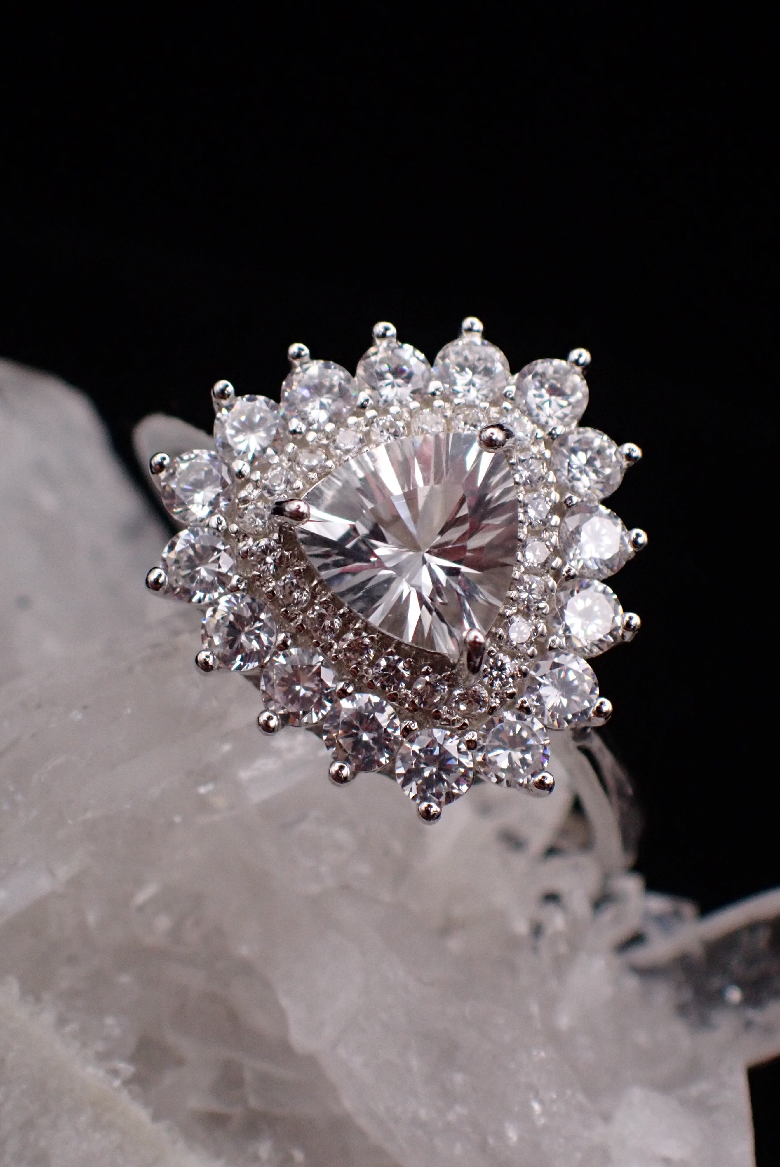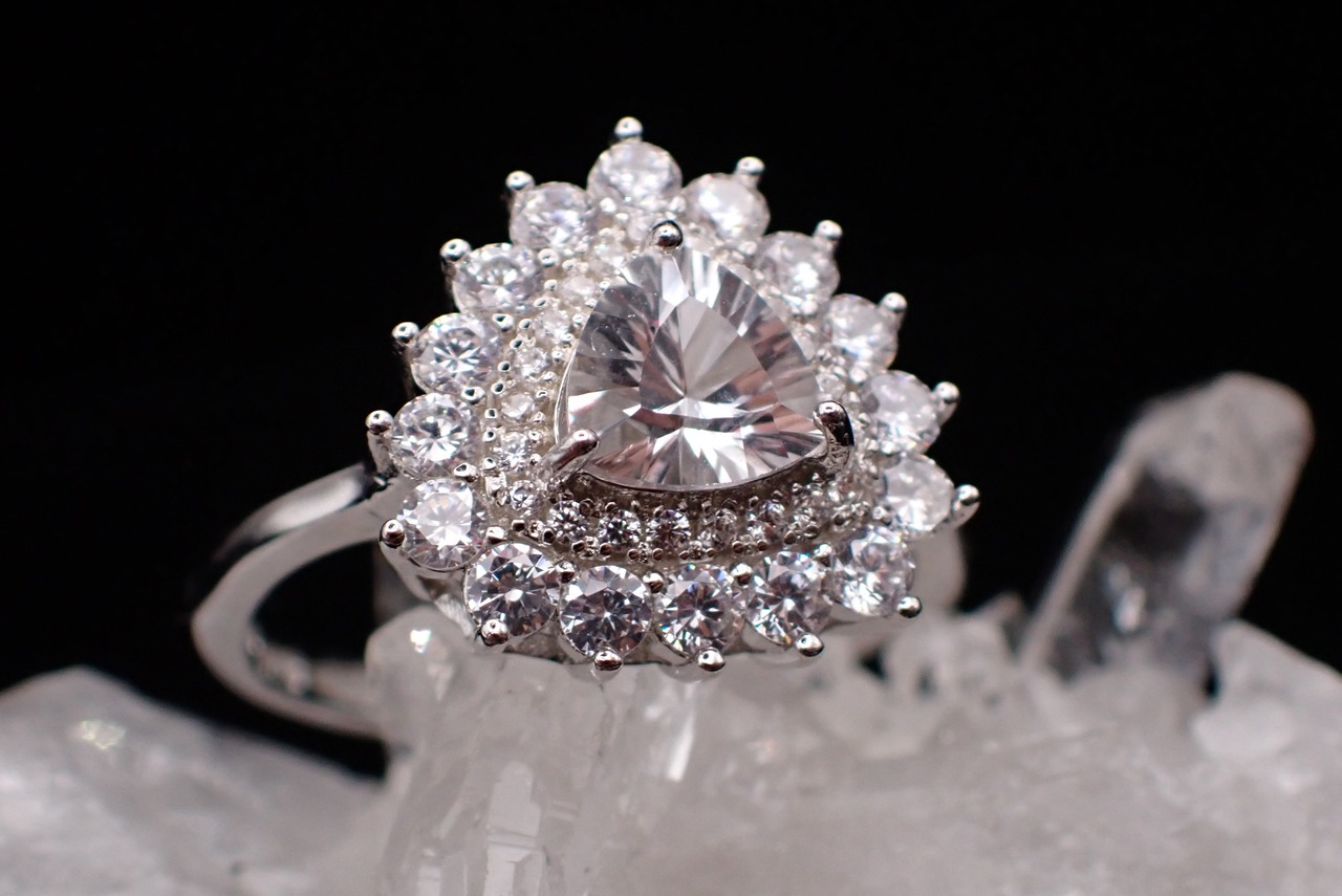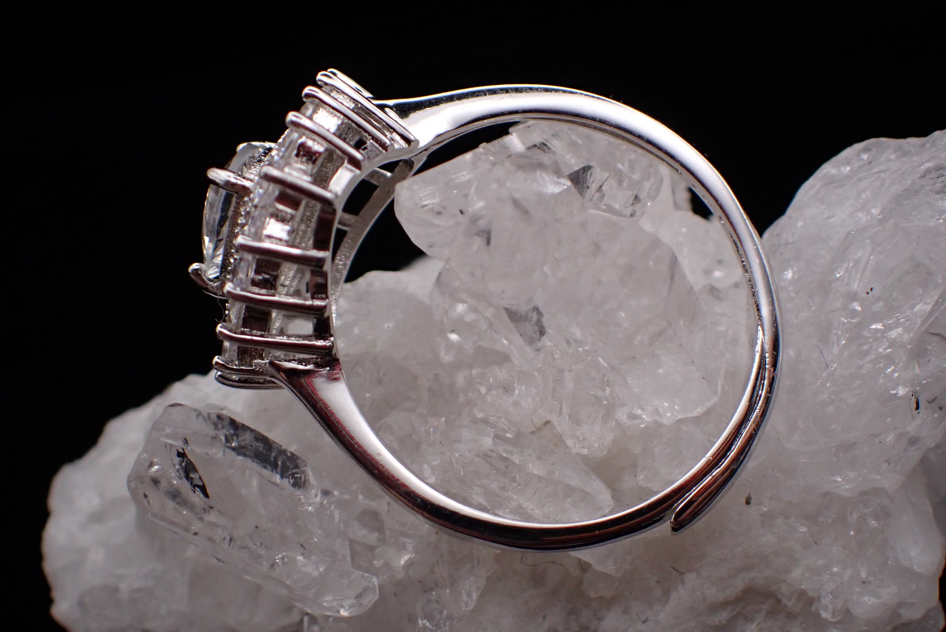 煌びやかに散るジルコニアの中央に佇む、純白が美しいホワイトトパーズのリングです。