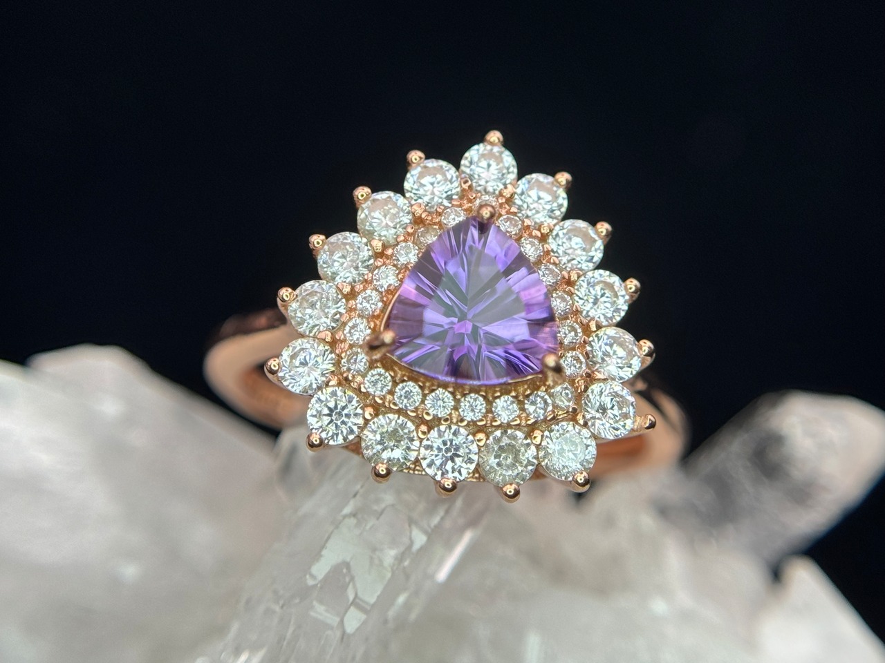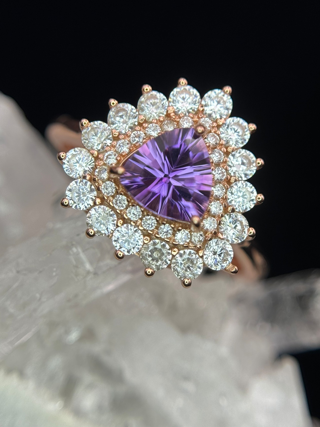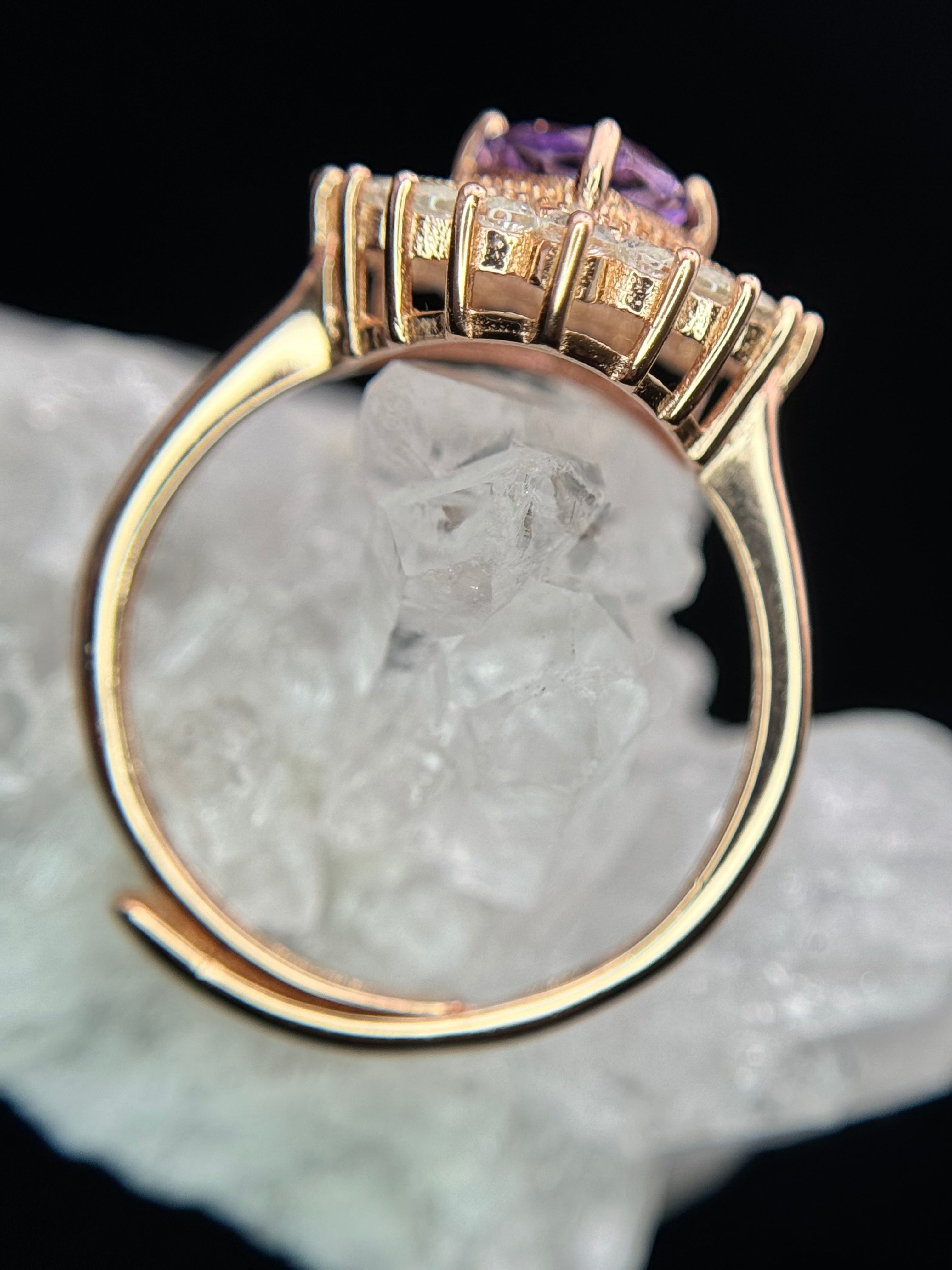 煌びやかに散るジルコニアの中央に佇む、高貴な紫が美しいアメジストのリングです。